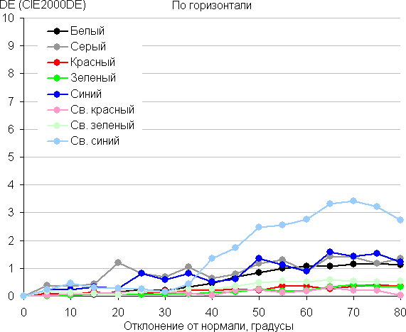 Для количественной характеристики изменения цветопередачи мы провели колориметрические измерения для белого, серого (127, 127, 127), красного, зеленого и синего, а также светло-красного, светло-зеленого и светло-синего полей во весь экран с использованием установки, подобной той, что применялась в предыдущем тесте. Измерения проводились в диапазоне углов от 0° (датчик направлен перпендикулярно к экрану) до 80° с шагом в 5°. Полученные значения интенсивностей были пересчитаны в отклонение ΔE относительно замера каждого поля при перпендикулярном положении датчика относительно экрана. Результаты представлены ниже: