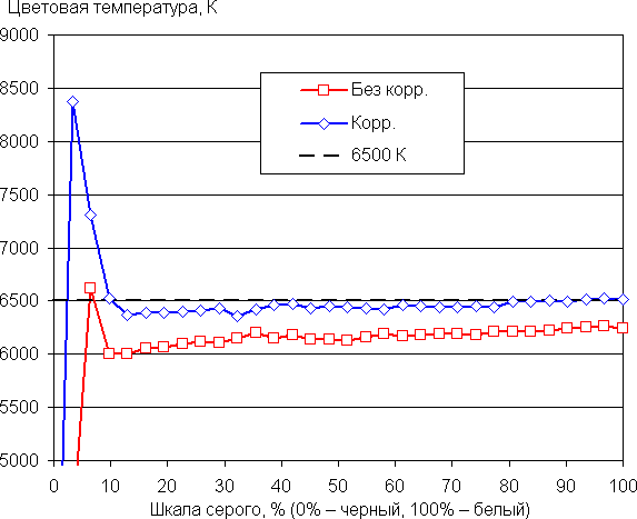 Графики ниже показывают цветовую температуру на различных участках шкалы серого и отклонение от спектра абсолютно черного тела (параметр ΔE) в случае настроек по умолчанию (подписано — Без корр.) и после коррекции цветового баланса (97/98/100 для усиления красного/зеленого/синего — Корр.):