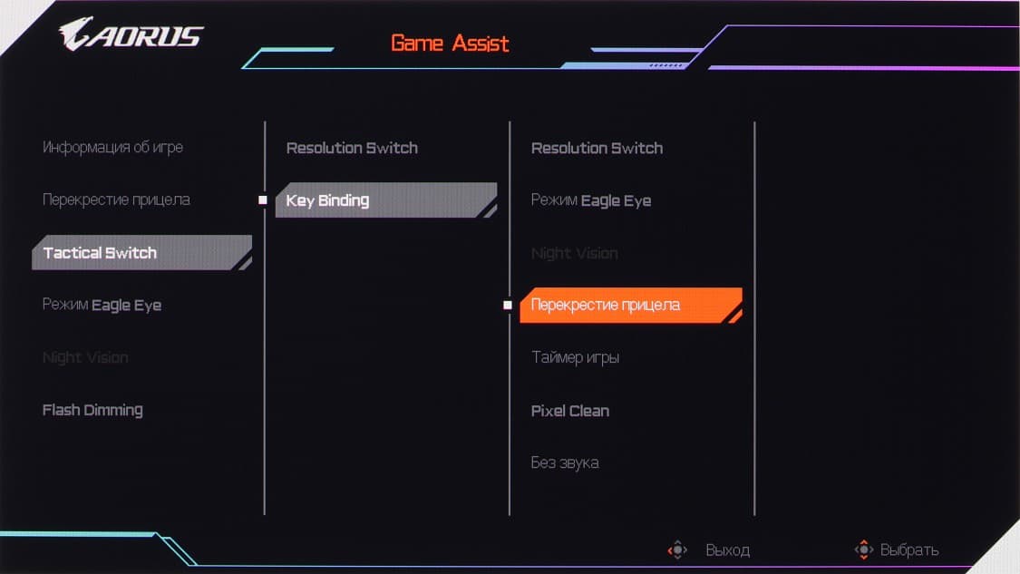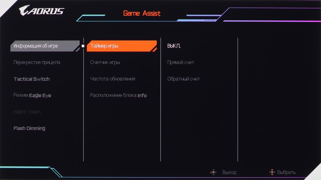 Из дополнительных возможностей в наборе Game Assist (Игровой ассистент) присутствуют несколько «геймерских» функции: таймер, пользовательский счетчик, вывод частоты кадров, перекрестия прицела в центре экрана и затемнение экрана.