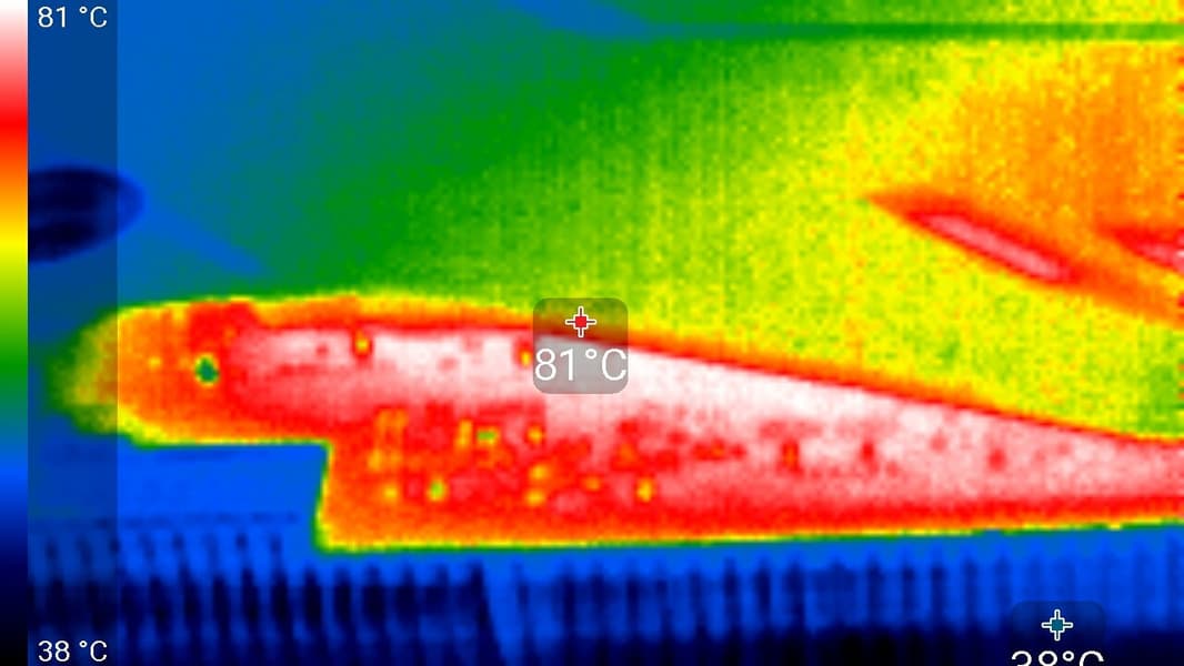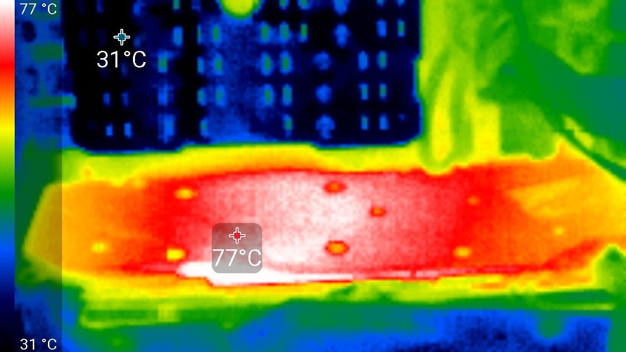 Максимальный нагрев — верхний край оборотной стороны PCB.