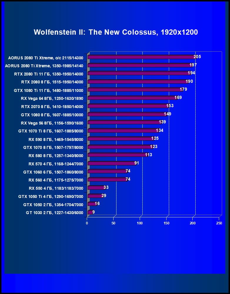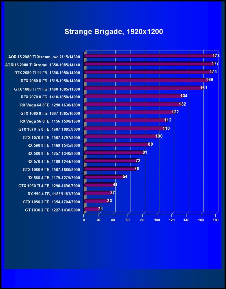 | 17 | Aorus 2080 Ti Xtreme, o/c 2115/14300 (ручной разгон) | 229 | 2210 | 96 500 |