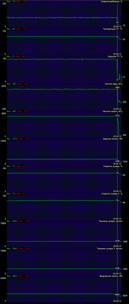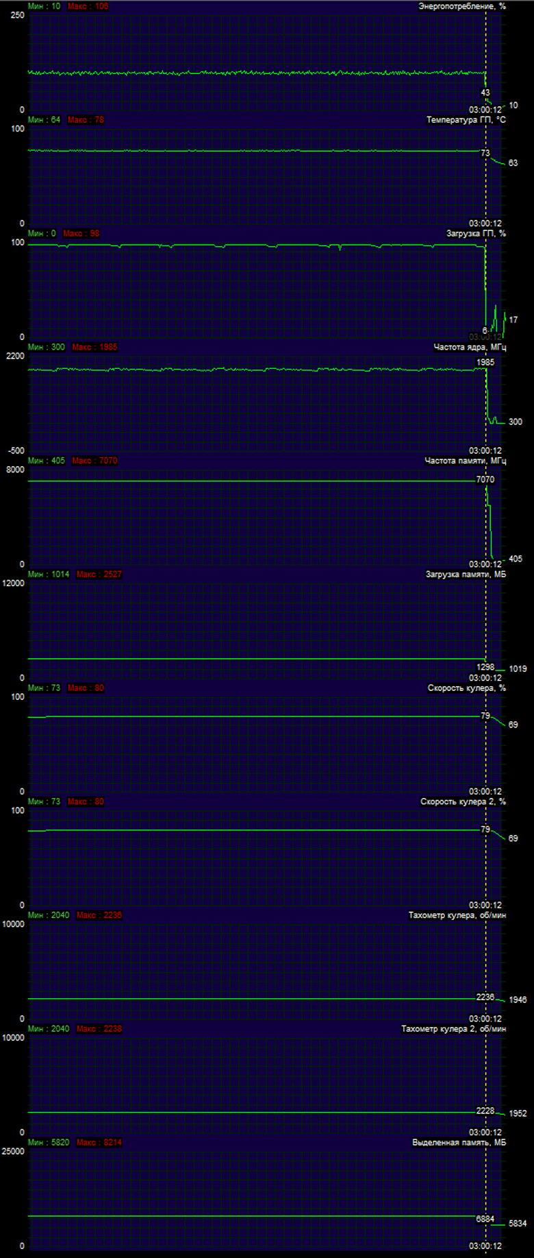 После 6-часового прогона под нагрузкой максимальная температура ядра не превысила 78 градусов, что является отличным результатом для видеокарты такого уровня.