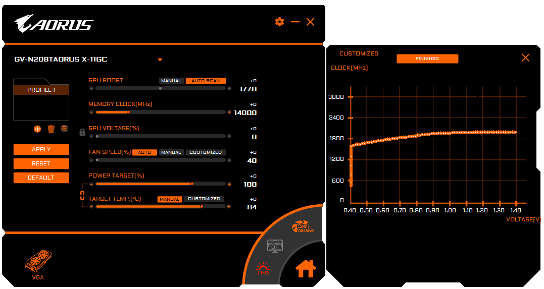 Технология «умного» разгона Nvidia Scanner, которая умеет находить безопасный максимум работы ядра и памяти, то есть самый быстрый режим работы в 3D, до недавнего времени была реализована только в утилите EVGA. Теперь же Nvidia Scanner имеется и в утилите Aorus, с его помощью были установлены максимальные частоты работы данного экземпляра карты при условии стабильной работы: 2115/14300 МГц. Это уже +9% к частотам карты Founder’s Edition. Любопытно, что примерно такие же максимальные разгонные частоты Scanner выдал и на предыдущей карте Aorus RTX 2080 Xtreme.