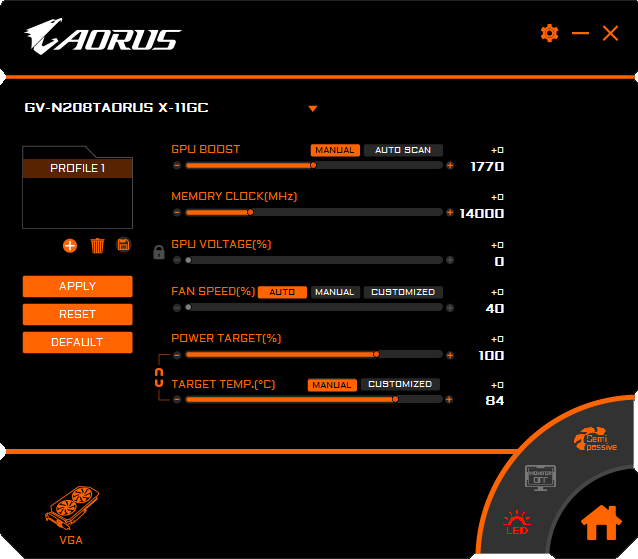Управляет подсветкой утилита RGB Fusion, которая устанавливается вместе с Aorus Engine. Можно регулировать цвета подсветки логотипов Aorus, а также создавать красивые эффекты свечения у вентиляторов (на концах их лопаток также есть светодиоды).
