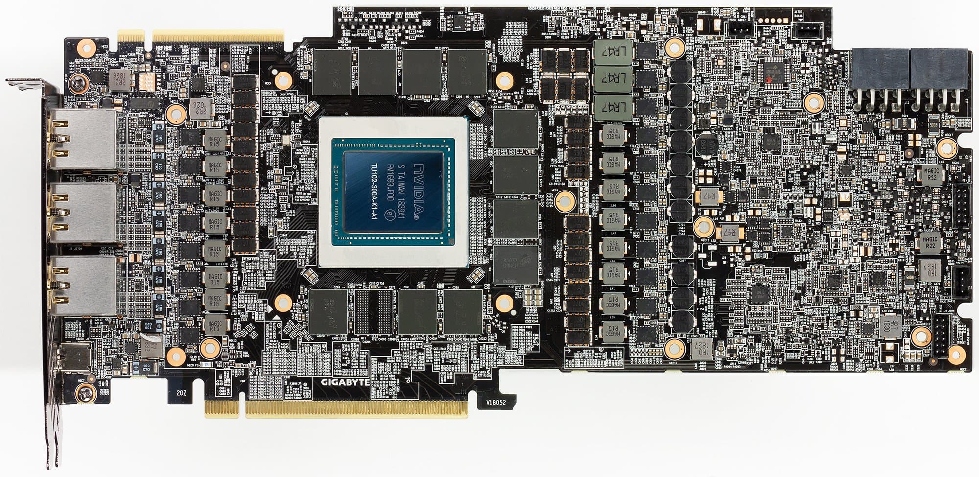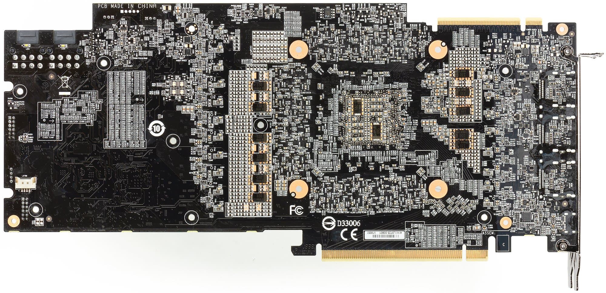 У всех видеокарт на базе RTX 2080 Ti печатная плата имеет разведенную шину обмена с памятью в 384 бит, то есть можно установить до 12 32-битных микросхем памяти суммарным объемом в 12 ГБ, просто одна микросхема не установлена, таким образом получен объем в 11 ГБ и шина обмена с памятью в 352 бит.