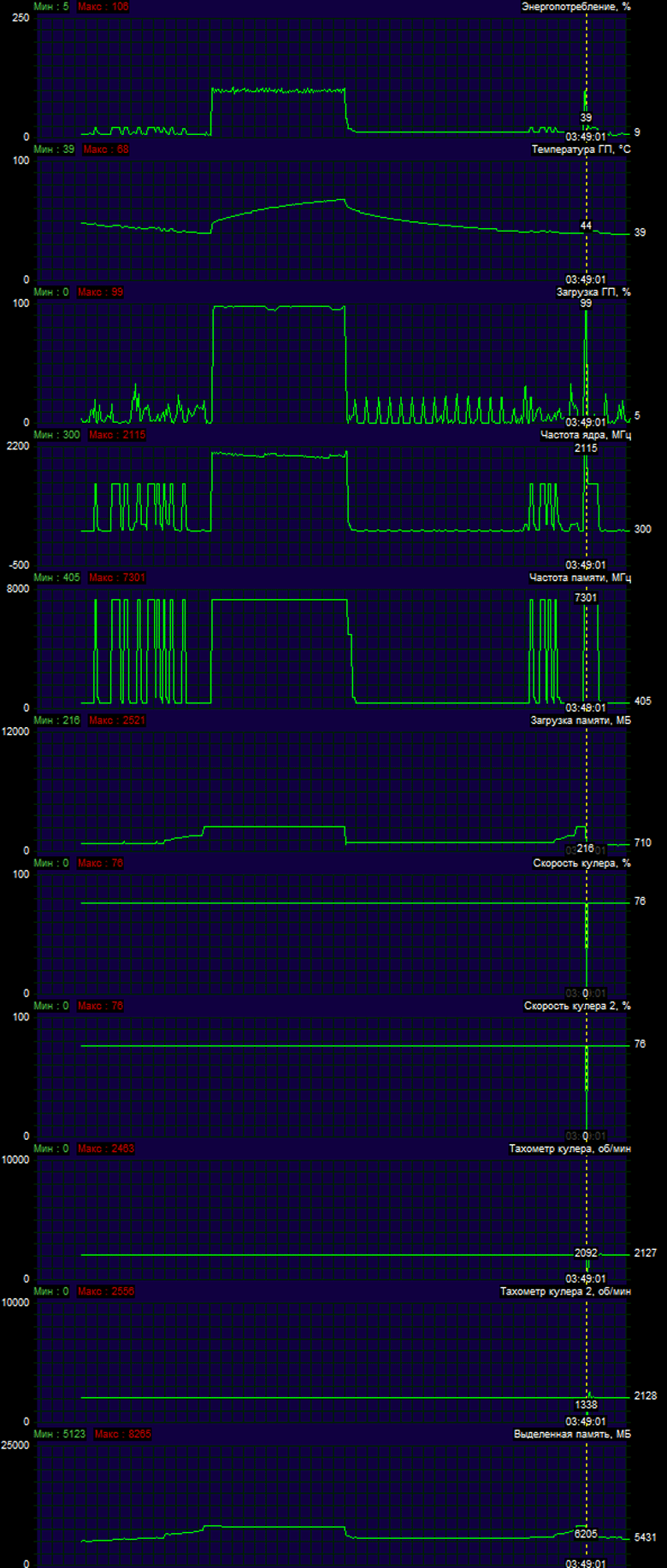 В данном случае GPU нагревался до 83 градусов при том же уровне шума. Карта стабильно отработала несколько часов под нагрузкой на таких частотах. (Маркер на скриншоте мониторинга выше выставлен на максимальную частоту GPU, а не на максимум температуры GPU.)