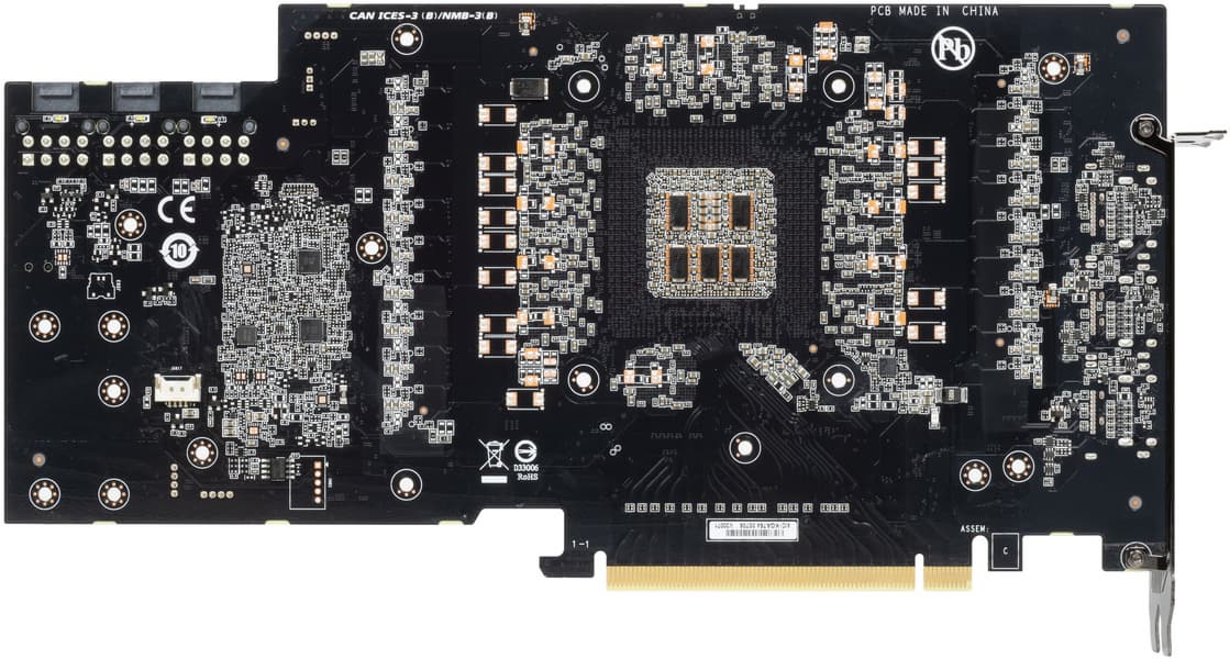 Максимальный нагрев наблюдался в центральной части PCB, в основном около ядра (а микросхемы памяти GDDR6X оказались самыми нагревающимися элементами).