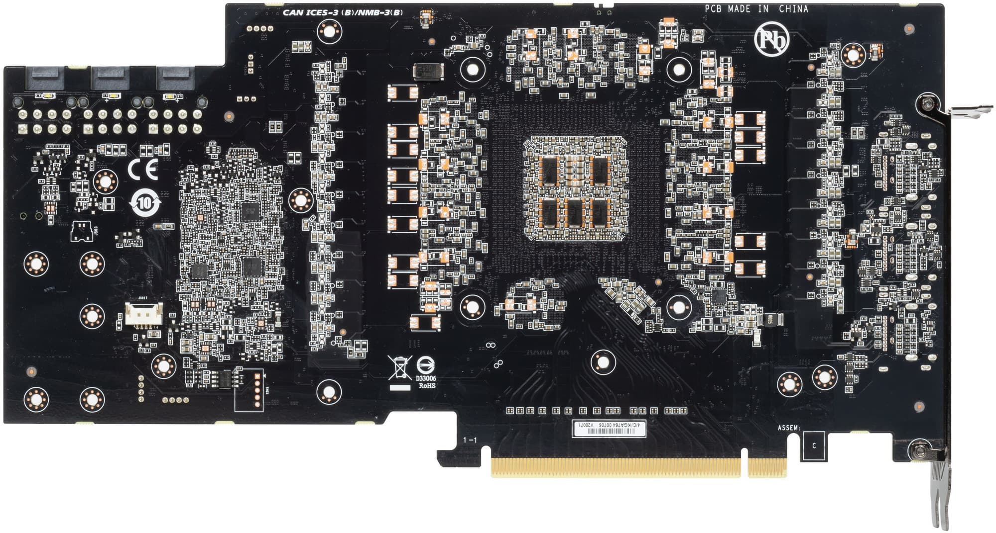 А вот партнеры калифорнийского гиганта продолжают создавать ускорители просто колоссальных размеров. Даже печатная плата у Gigabyte куда более громоздкая, а ведь ее система охлаждения предусматривает еще и сквозной продув радиатора за печатной платой, так что суммарная длина такого ускорителя точно превысит 30 см.