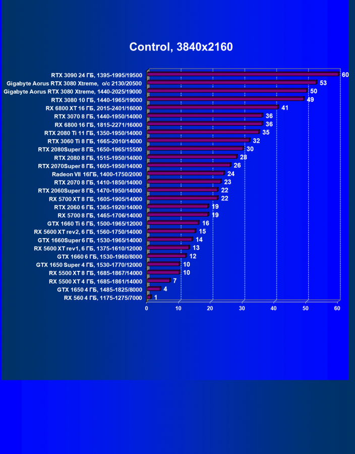 Рейтинг составлен по всем тестам без использования технологий трассировки лучей. Этот рейтинг нормирован по самому слабому ускорителю — Radeon RX 560 (то есть сочетание скорости и функций Radeon RX 560 приняты за 100%). Рейтинги ведутся по 28 ежемесячно исследуемым нами акселераторам в рамках проекта Лучшая видеокарта месяца. В данном случае из общего списка выбрана группа карт для анализа, в которую входят GeForce RTX 3080 и его конкуренты.
