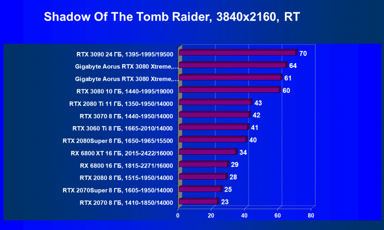 C появлением грозного соперника в лице AMD Radeon RX 6800 XT ускоритель GeForce RTX 3080 получил мощный стимул начать падать в цене, ибо оба эти ускорителя нацелены на разрешение 4К при максимальном качестве графики в играх, в котором они могут обеспечить полный комфорт. Правда, в играх, использующих технологию трассировки лучей (RT), GeForce RTX 3080 становится беспрекословным лидером, а Radeon RX 6800 XT сильно теряет в производительности, плюс у серии GeForce RTX есть отменный помощник, предотвращающий падение производительности при включении RT — технология DLSS, которой пока нет у конкурентов из стана Radeon (AMD что-то подобное обещает, но сроки неизвестны). Так что стимул снижать цену на GeForce RTX 3080 у Nvidia не такой уж и весомый, к тому же в рознице наблюдается дефицит этих карт. Что касается рассматриваемой сегодня видеокарты Gigabyte, то она немного быстрее референсной Founders Edition.