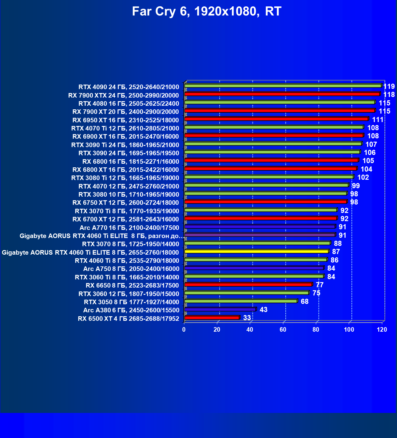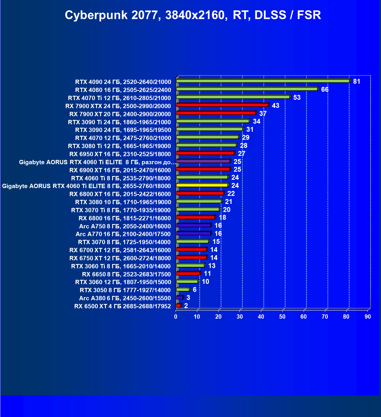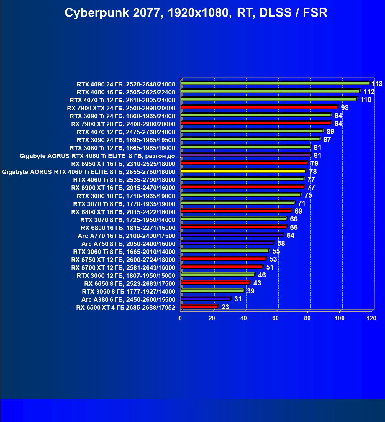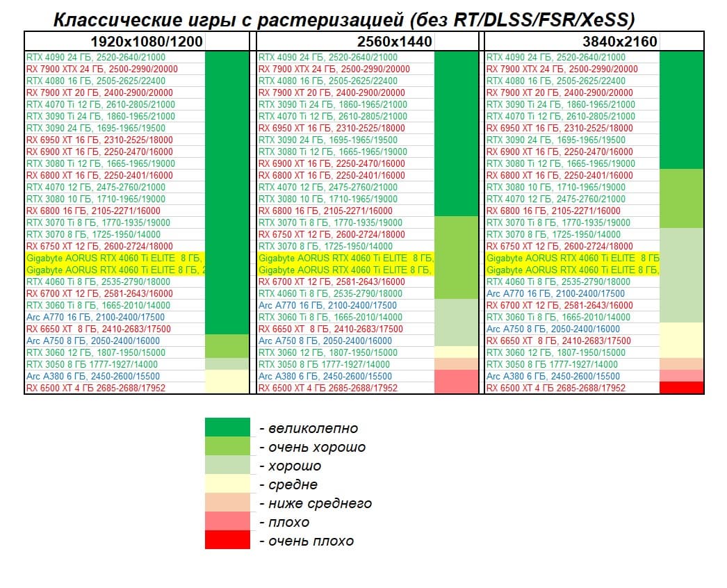 | 23 | Gigabyte Aorus RTX 4060 Ti Elite 8 ГБ, 2655—2760/18000 | 69 | 333 | 48 000 |