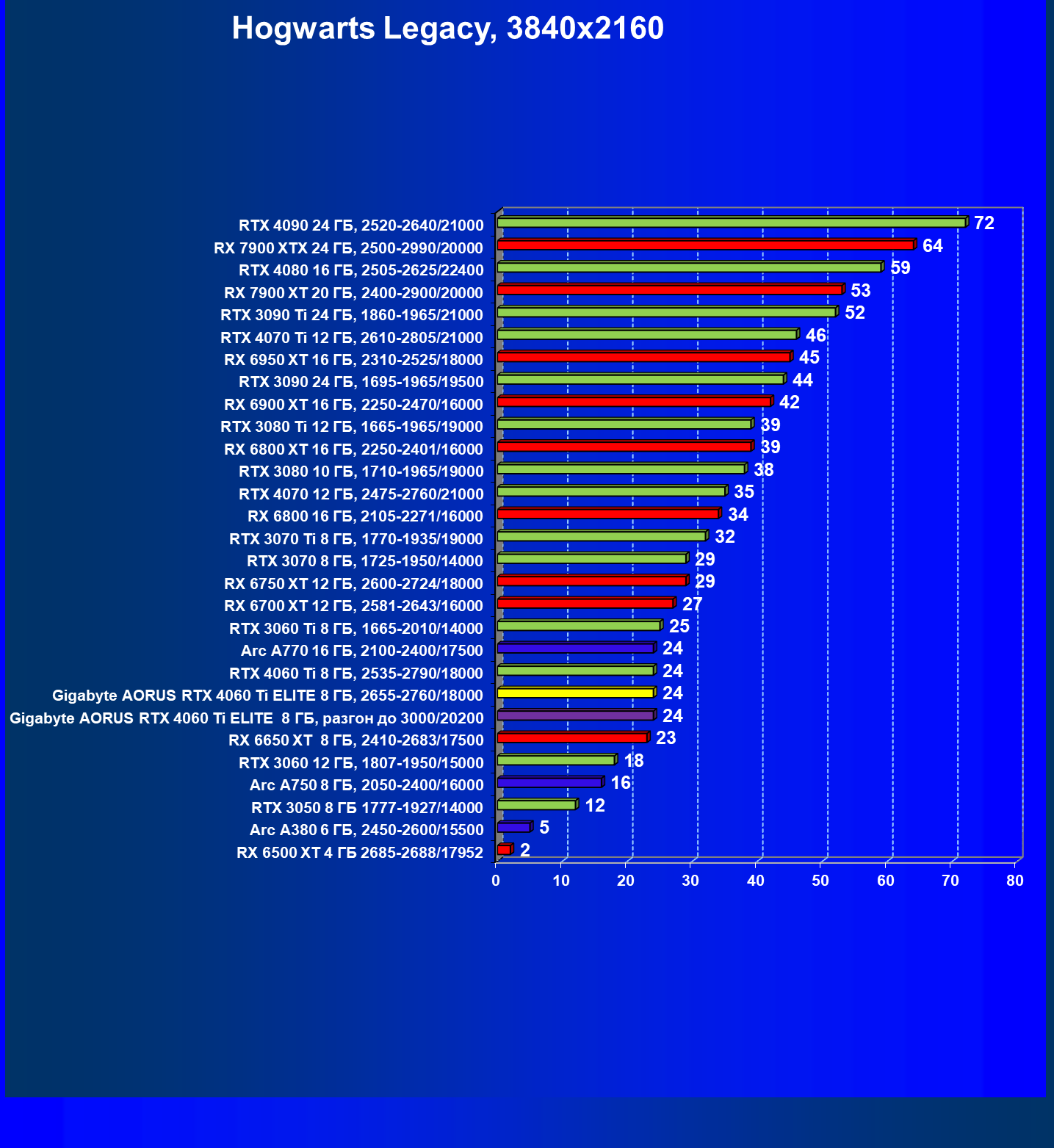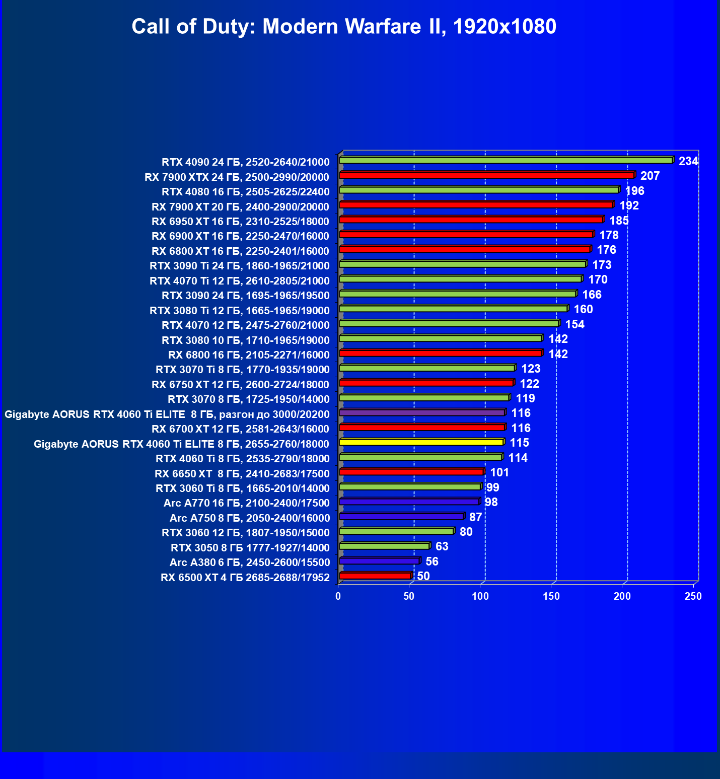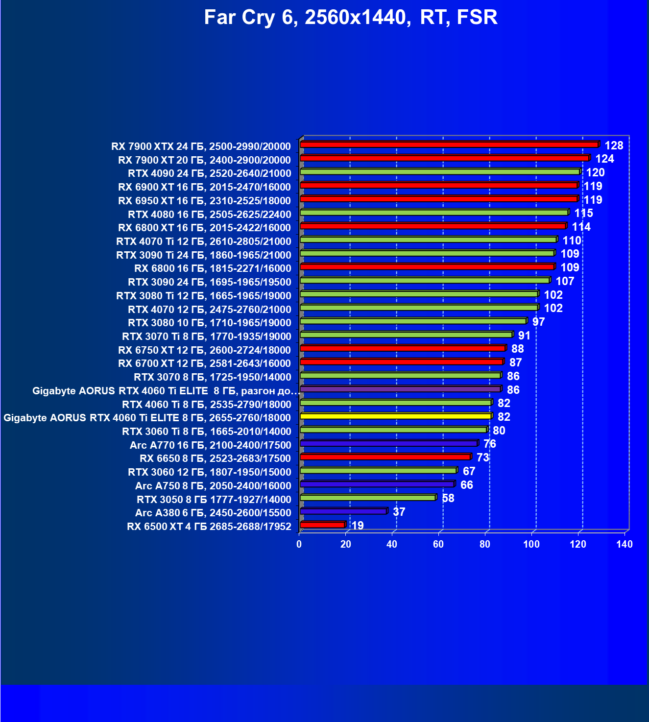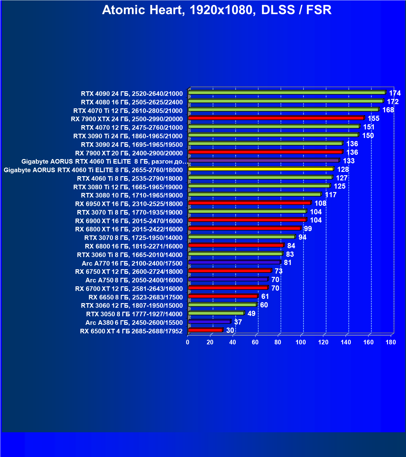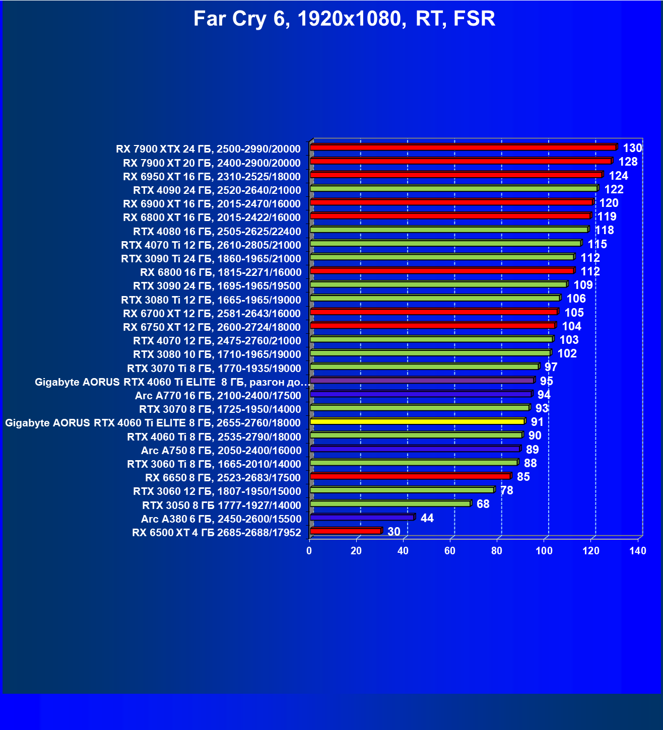 | 23 | Gigabyte Aorus RTX 4060 Ti Elite 8 ГБ, 2655—2760/18000 | 69 | 333 | 48 000 |