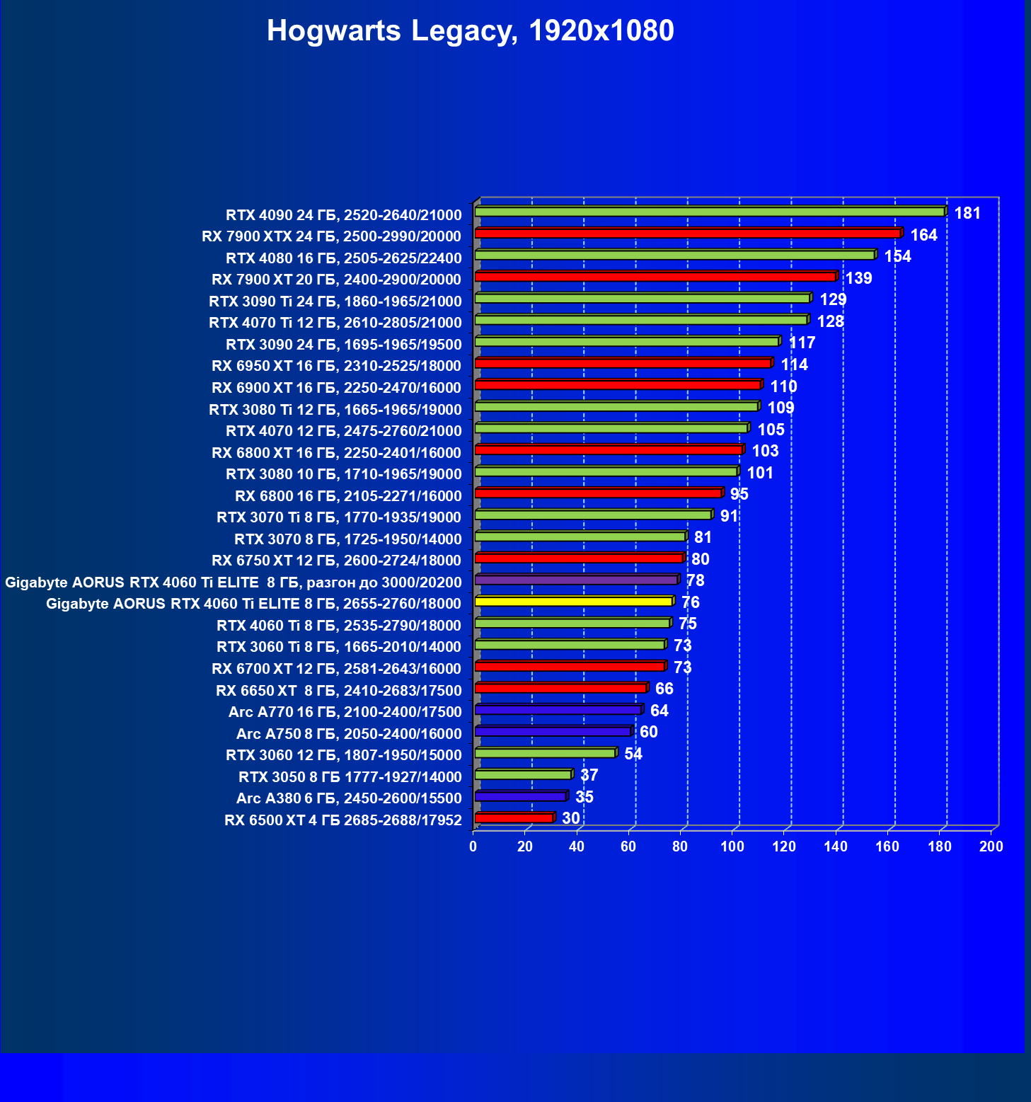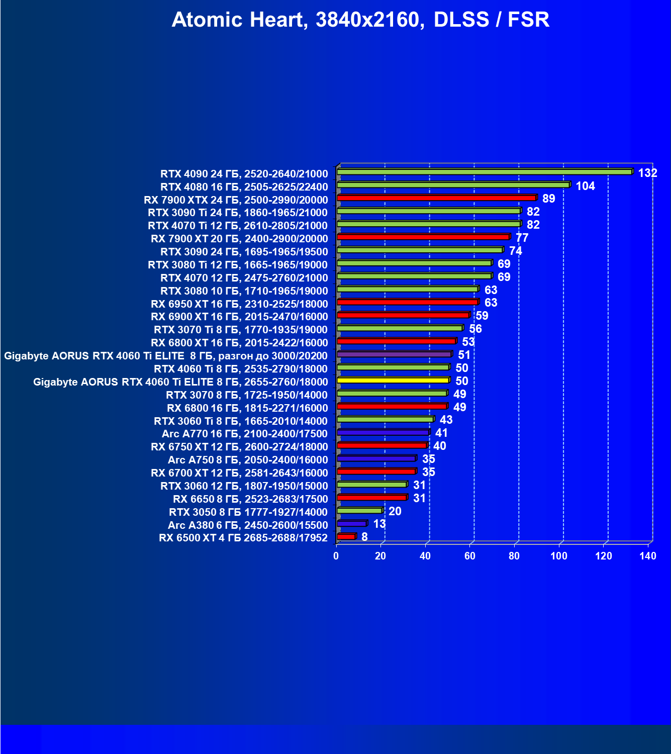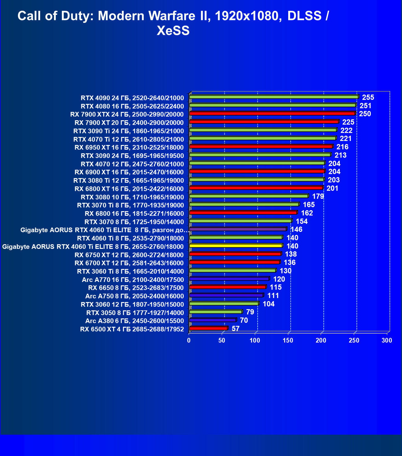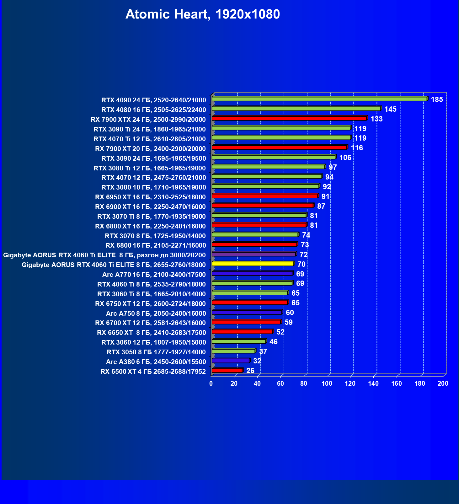 | 23 | Gigabyte Aorus RTX 4060 Ti Elite 8 ГБ, 2655—2760/18000 | 69 | 333 | 48 000 |
