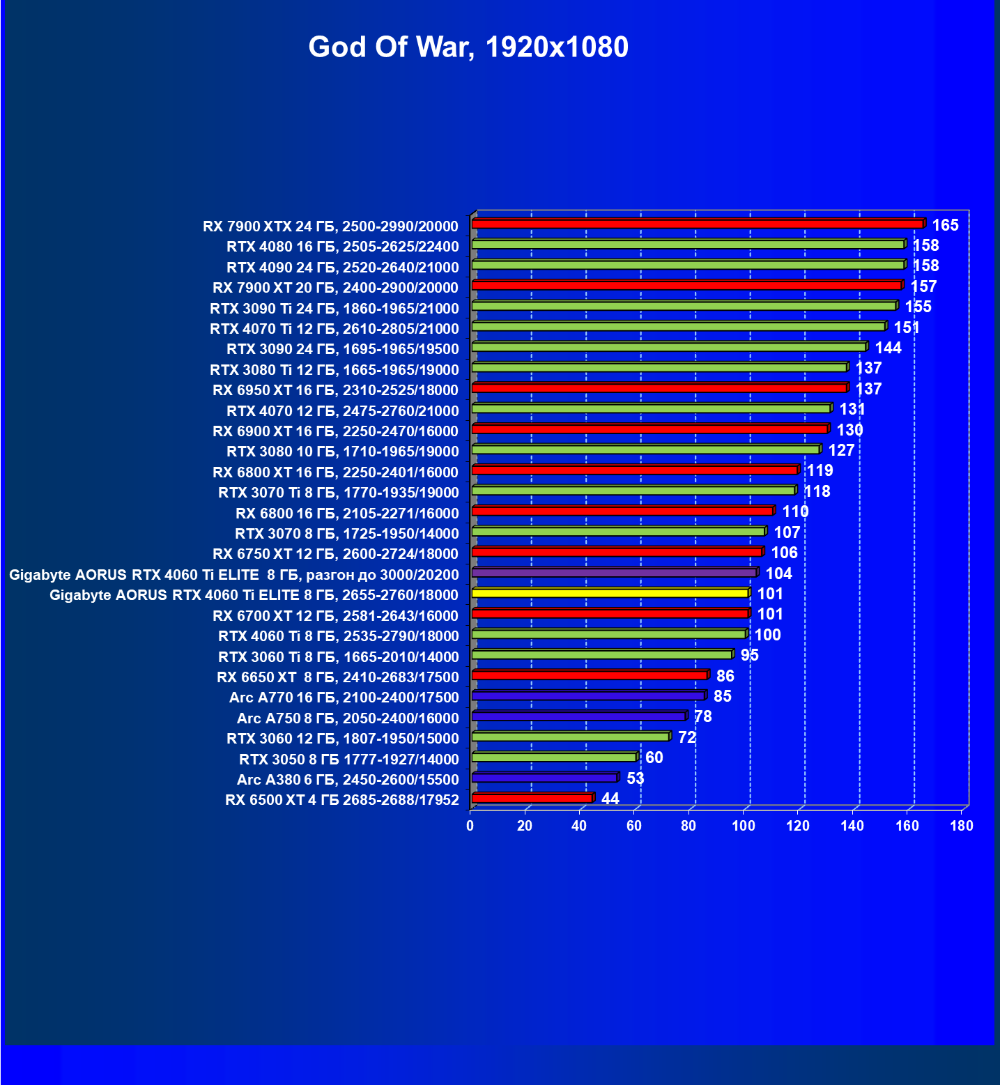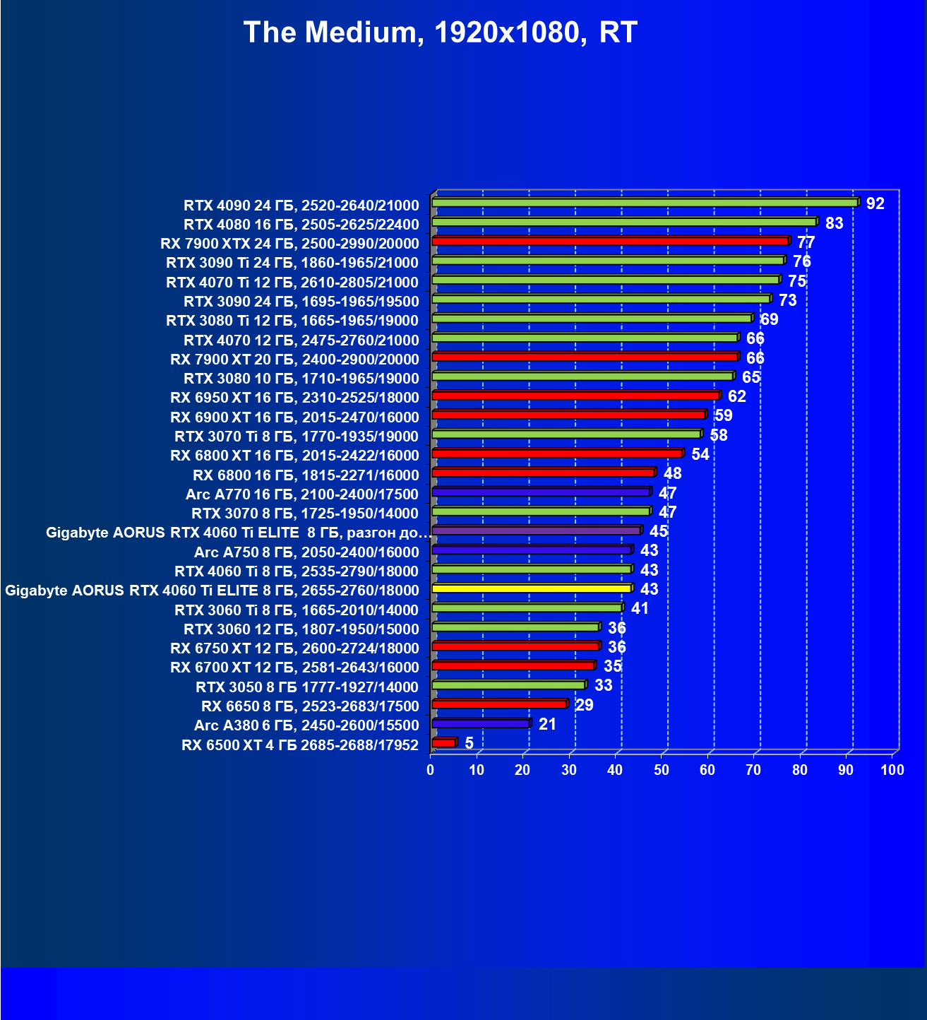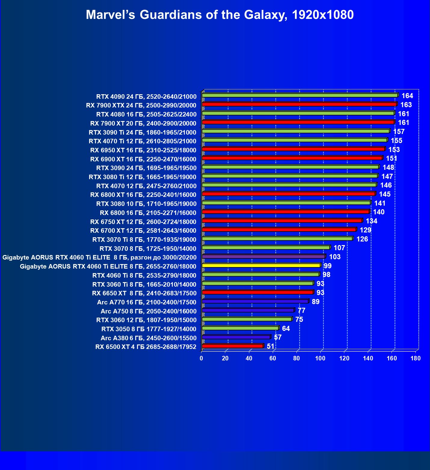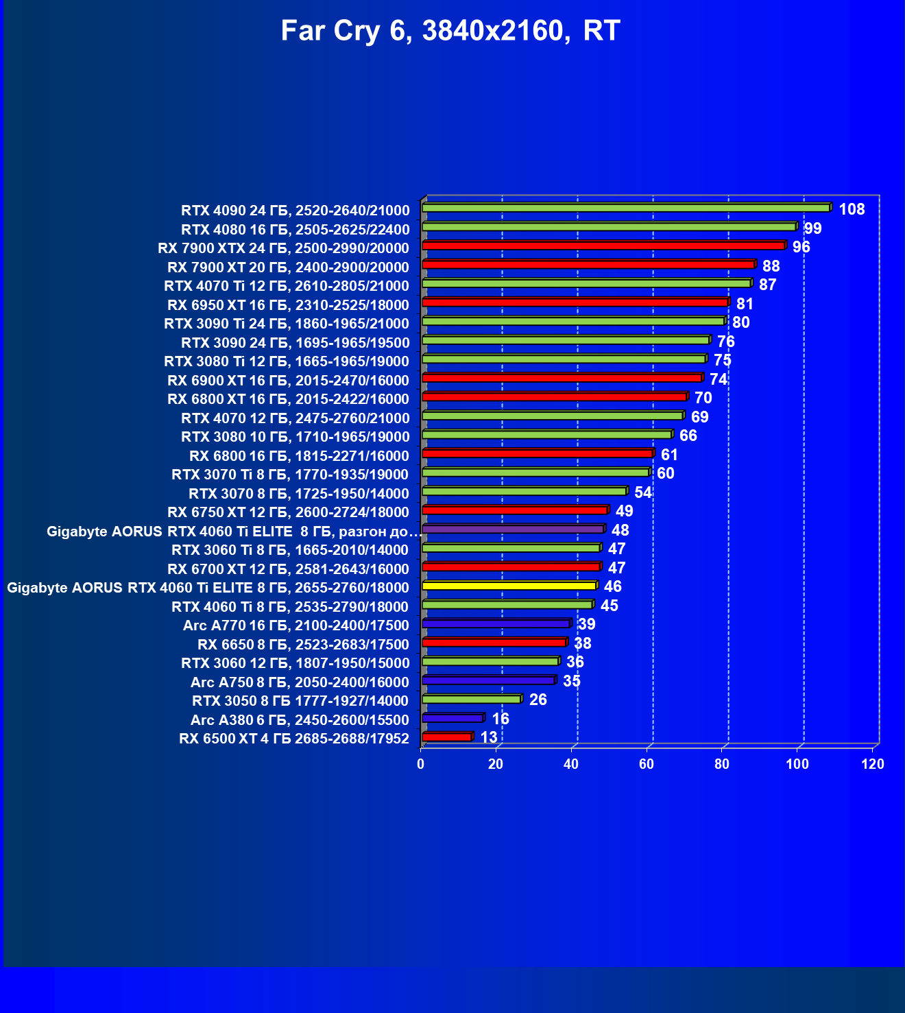 | 23 | Gigabyte Aorus RTX 4060 Ti Elite 8 ГБ, 2655—2760/18000 | 69 | 333 | 48 000 |