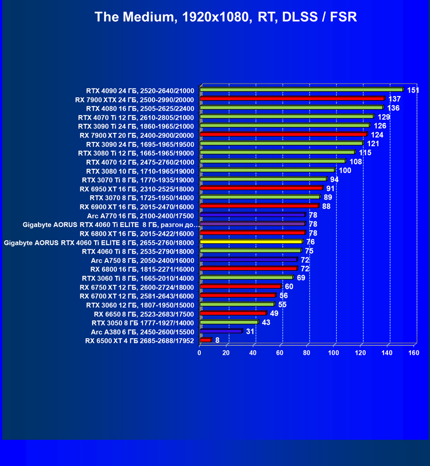 GeForce RTX 4060 Ti в целом лишь на 5%—8% быстрее формального предшественника в лице GeForce RTX 3060 Ti, при этом GeForce RTX 4060 Ti отстает от GeForce RTX 3070 и Radeon RX 6750 XT, находясь на уровне Radeon RX 6700 XT, хотя оба ускорителя AMD дешевле. Обозреваемая карта Gigabyte лишь слегка опережает референс-аналог, но даже ручной разгон не позволил ей догнать Radeon RX 6750 XT.
