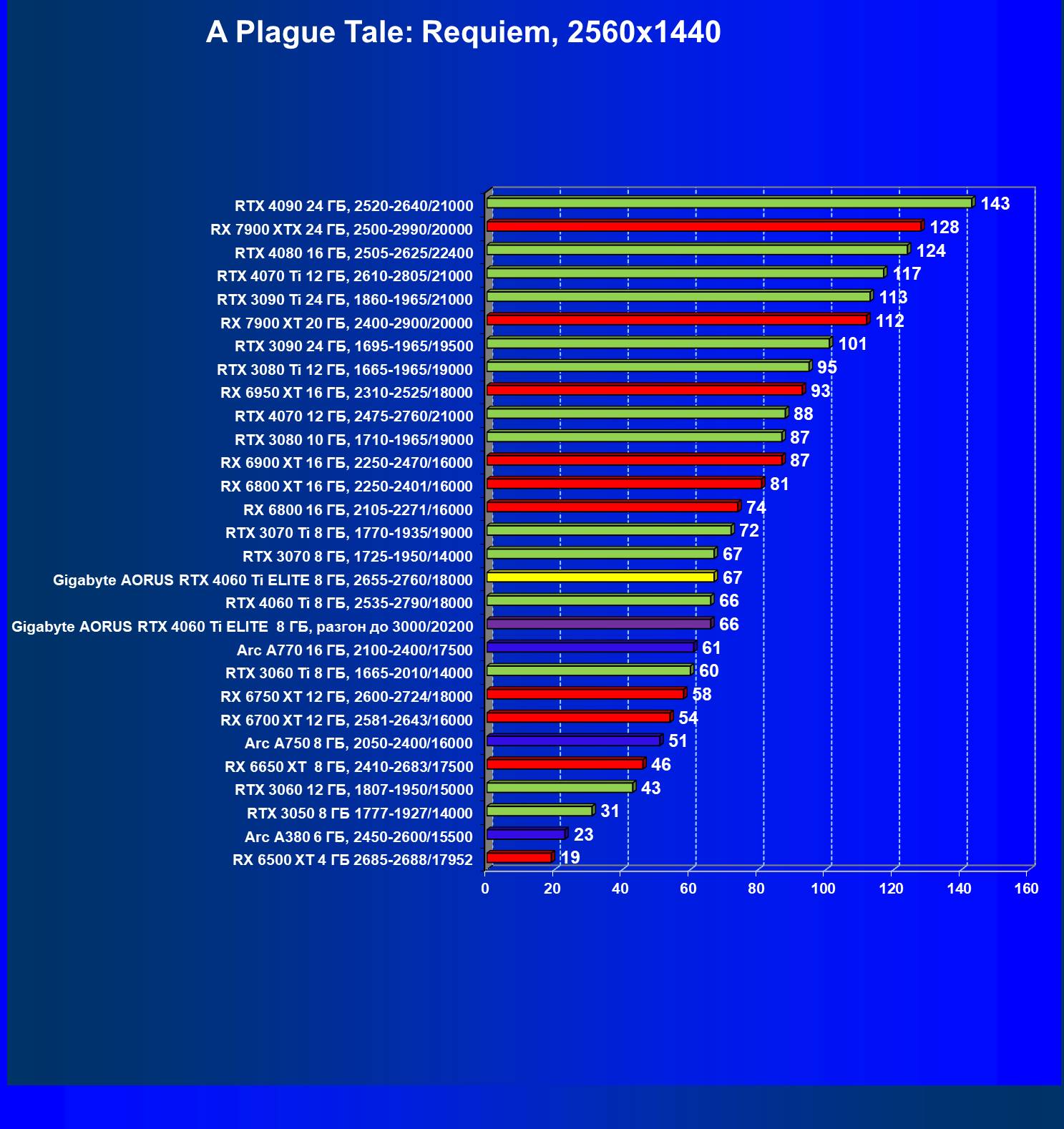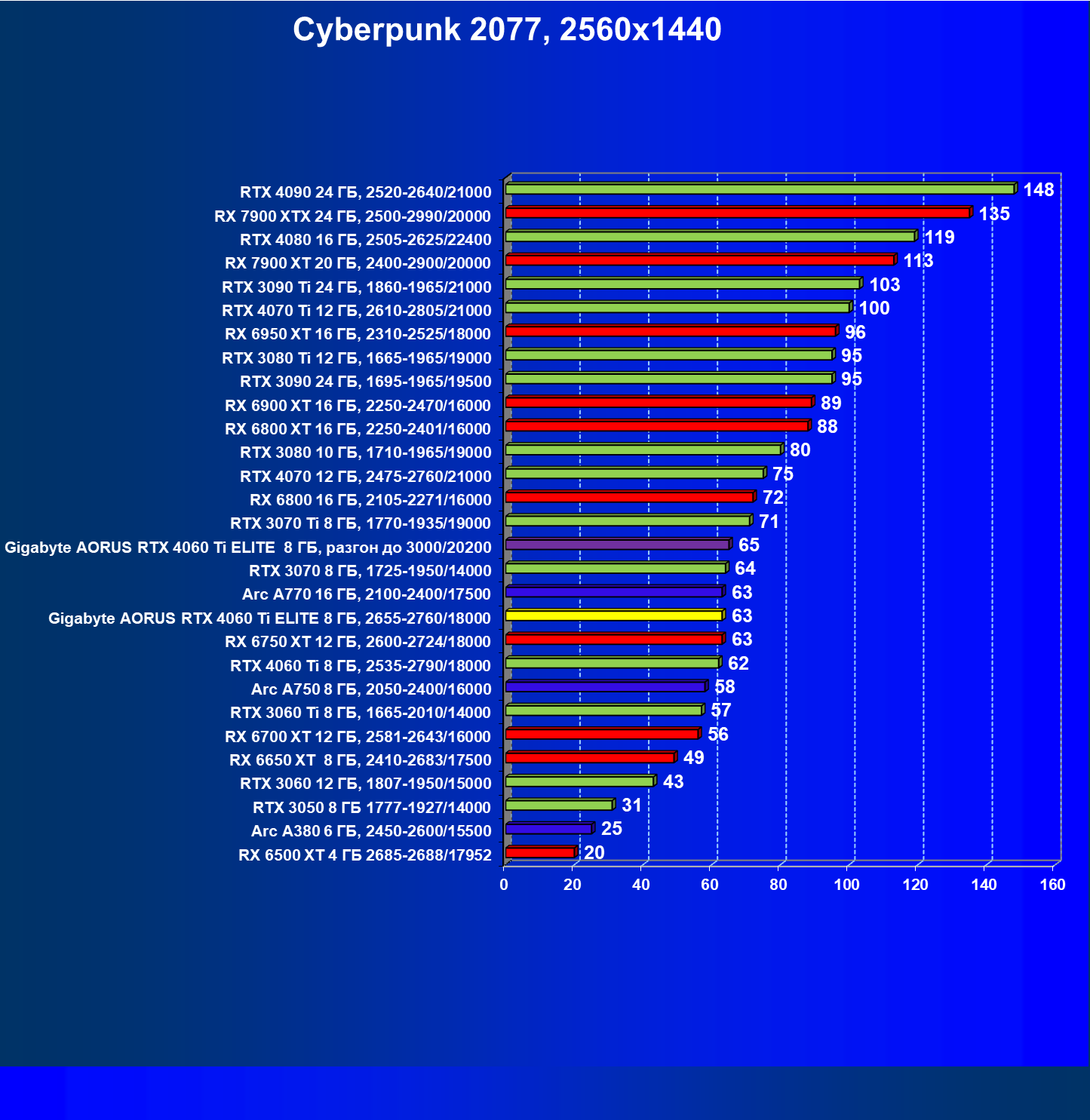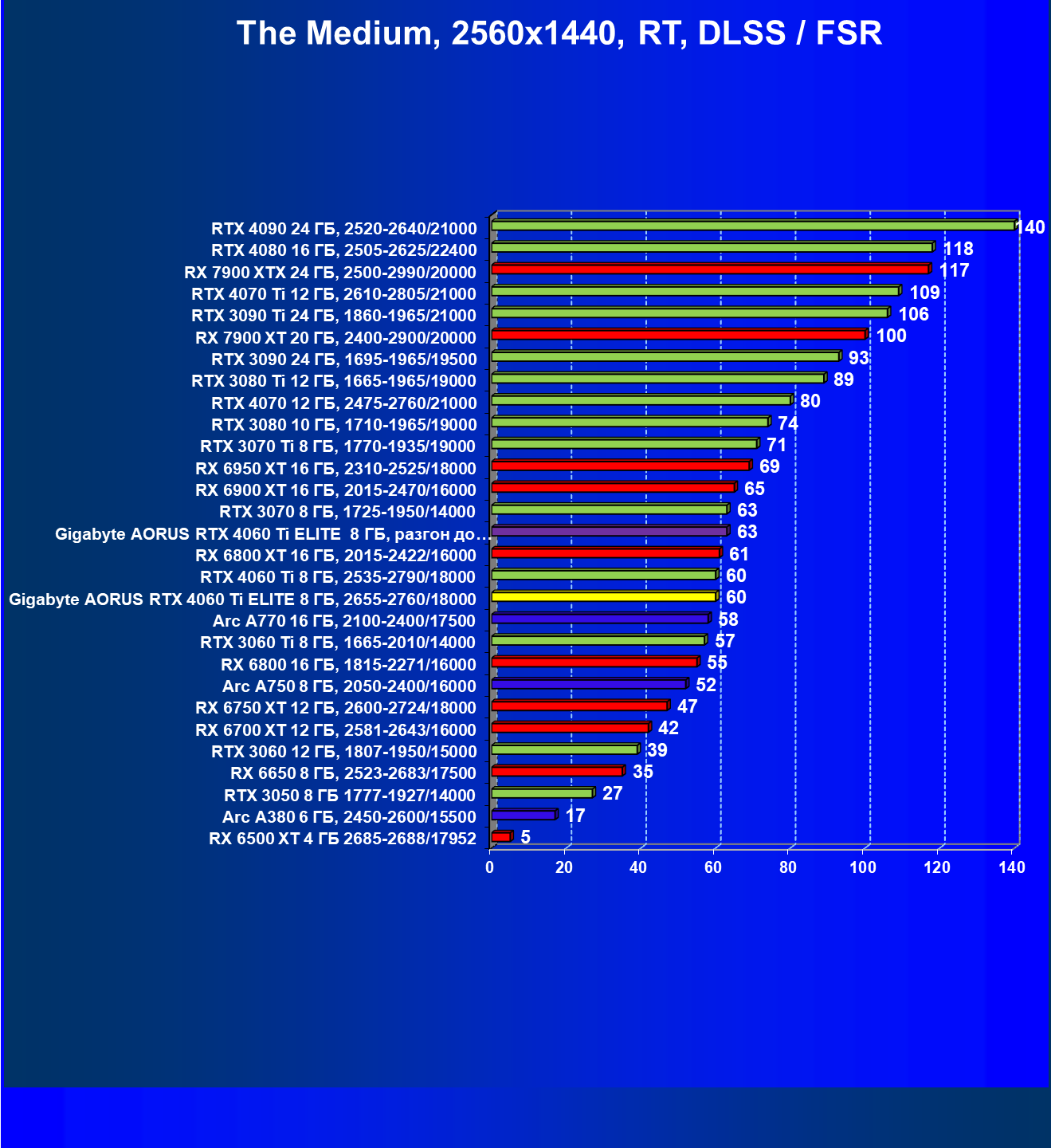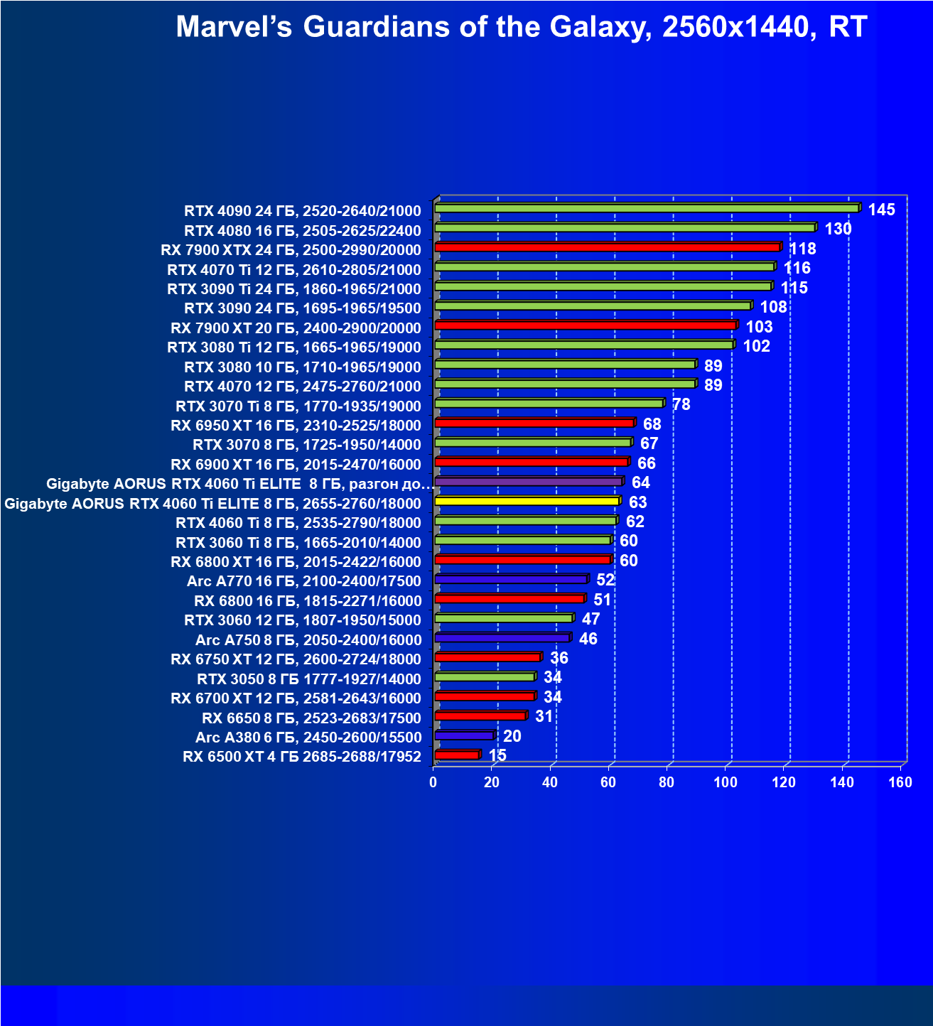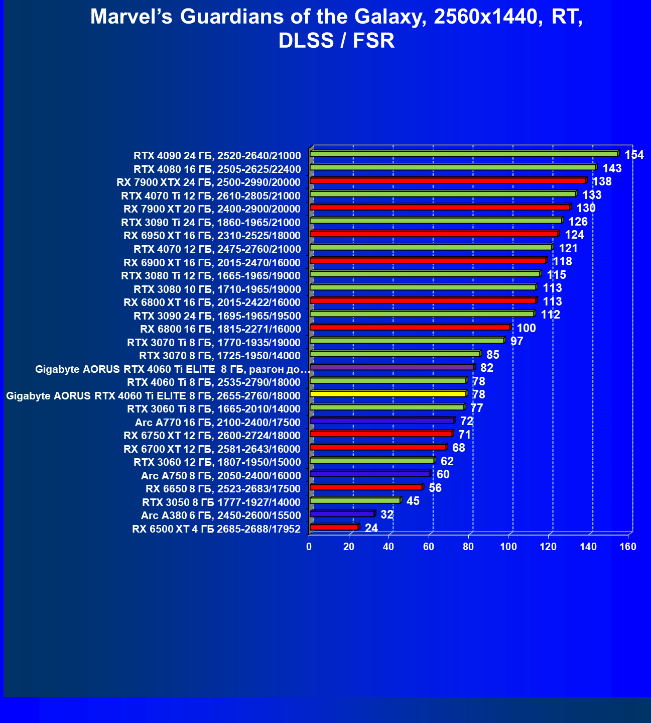 | 21 | Arc A770 16 ГБ, 2100—2400/17500 | 447 | 159 | 28 000 |