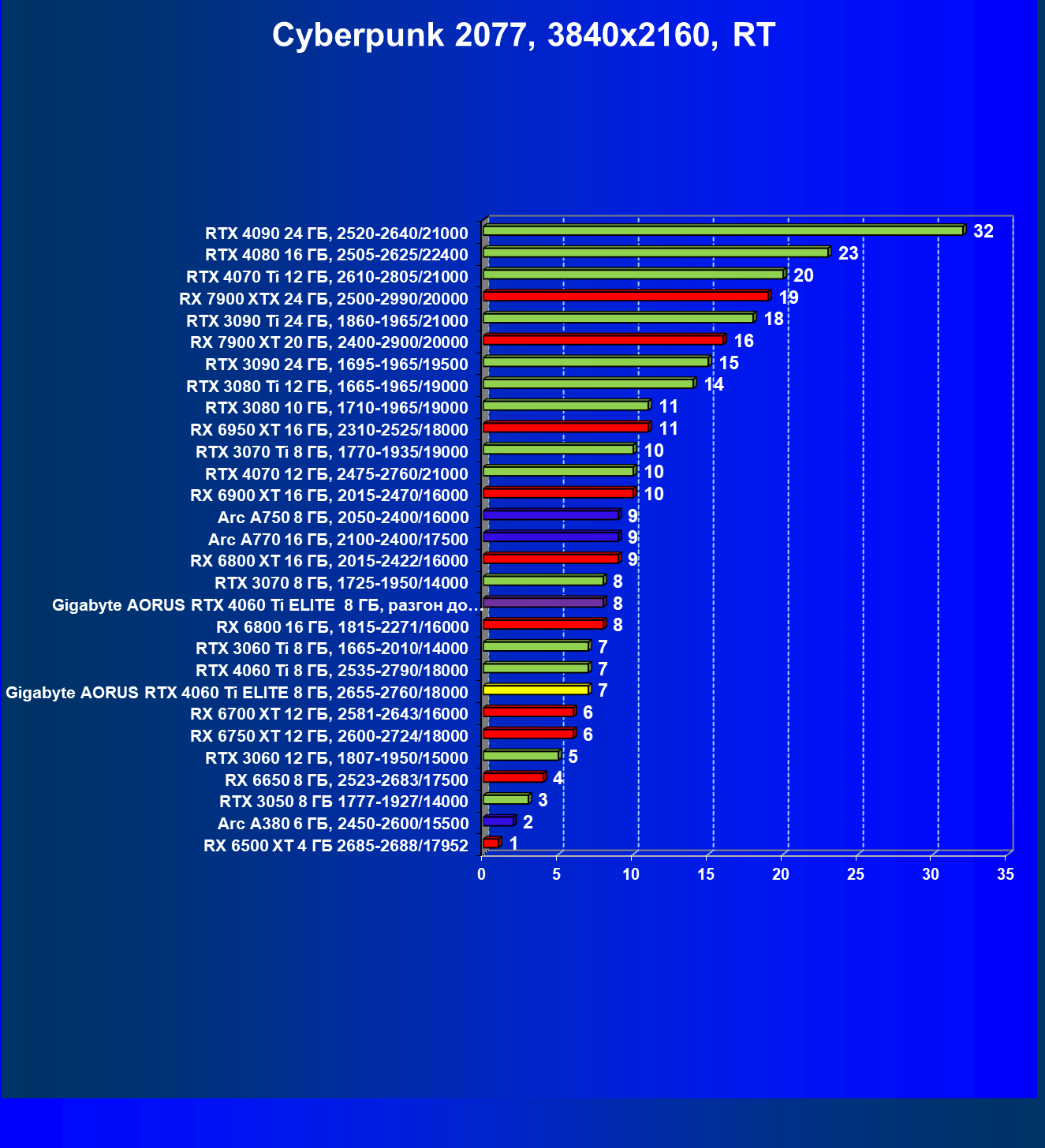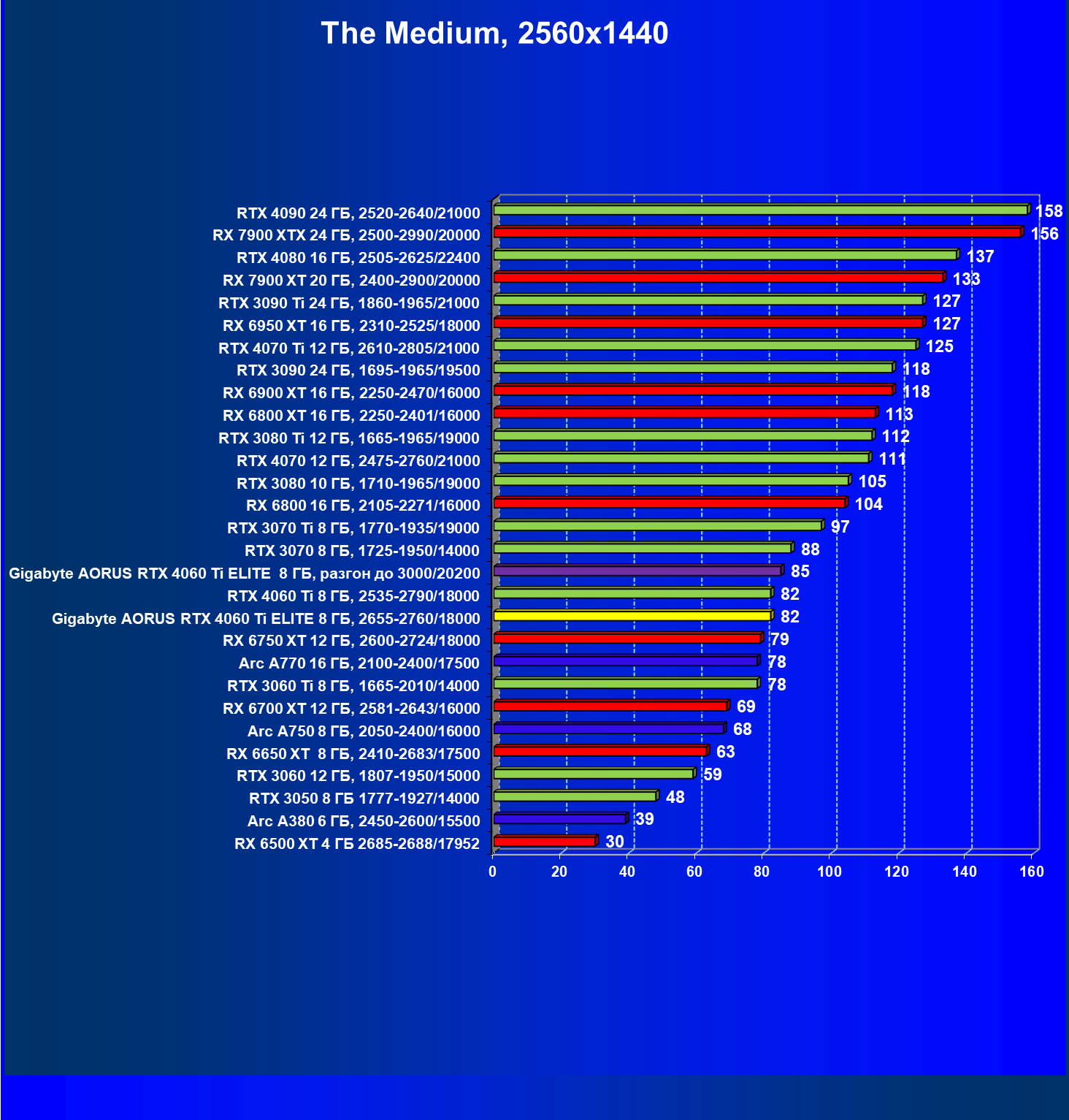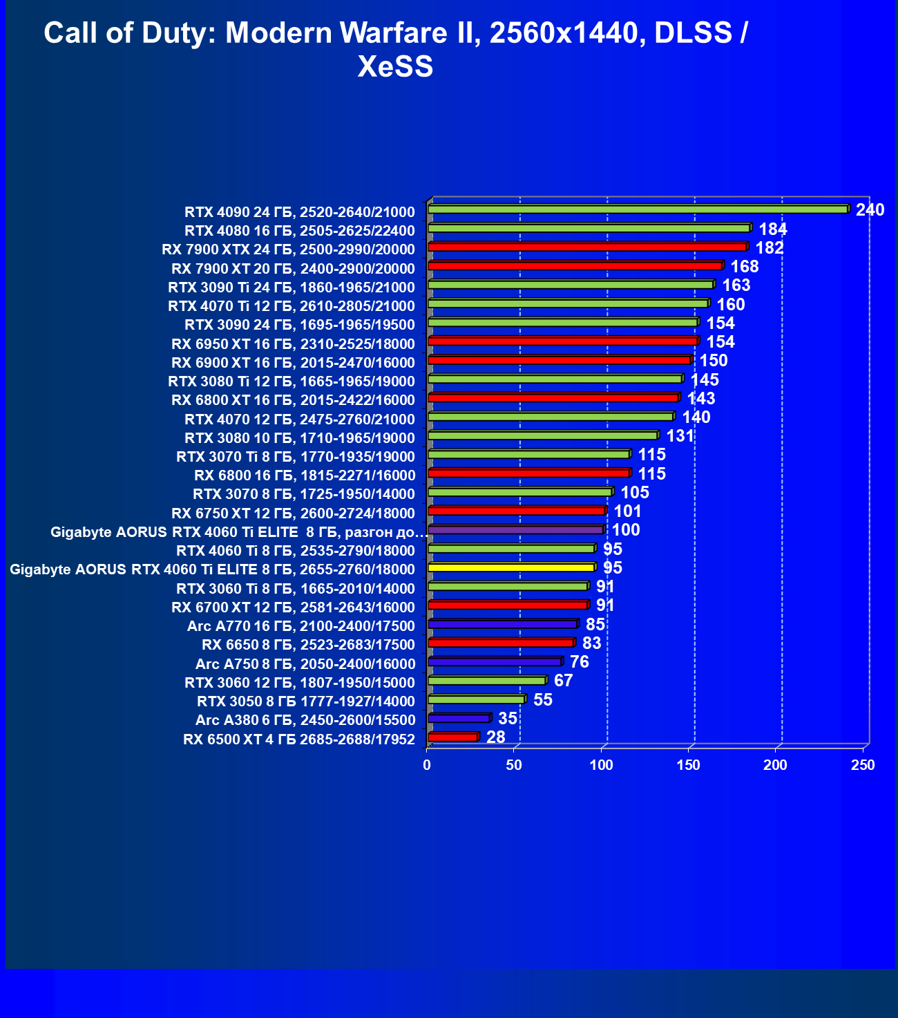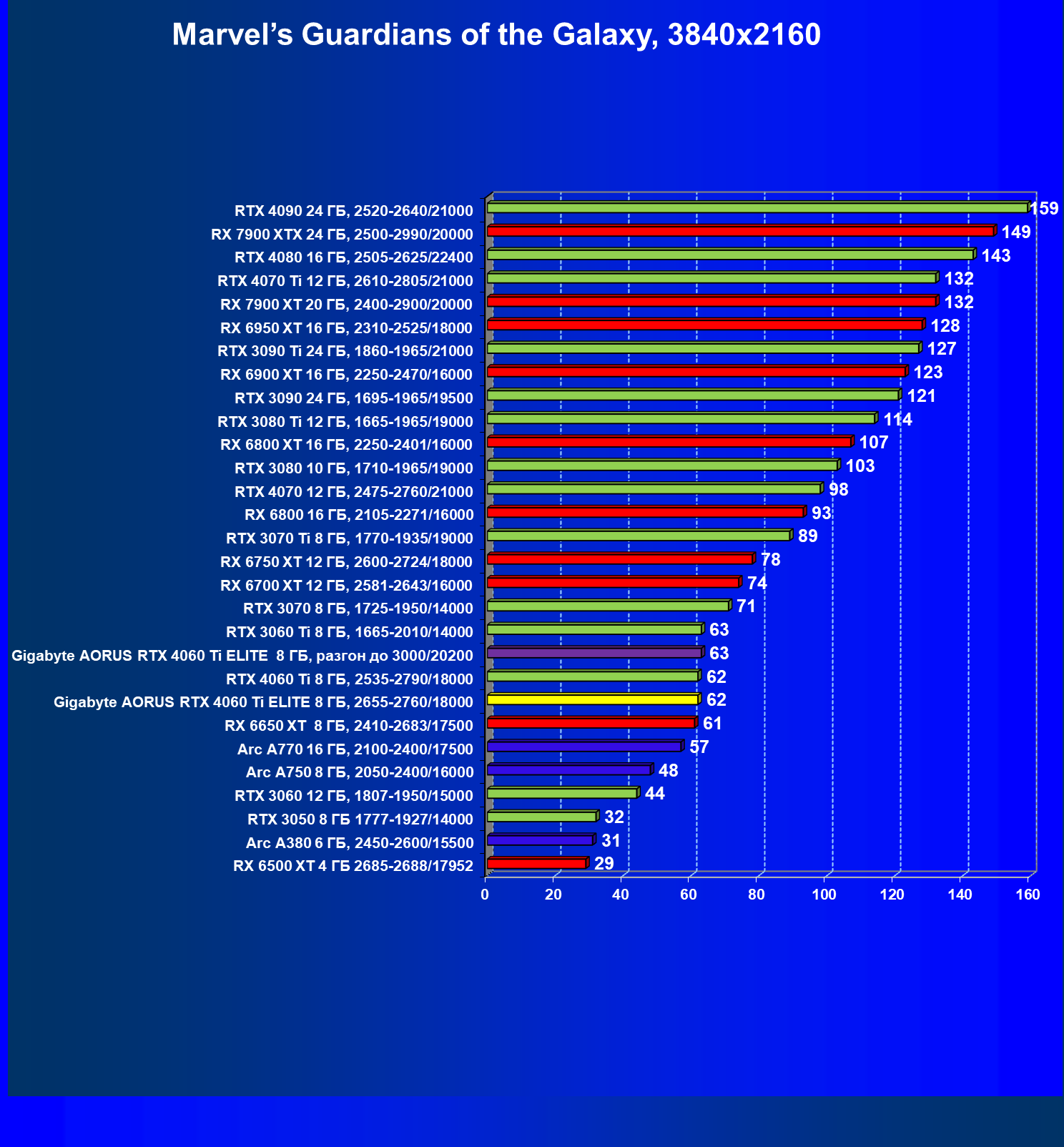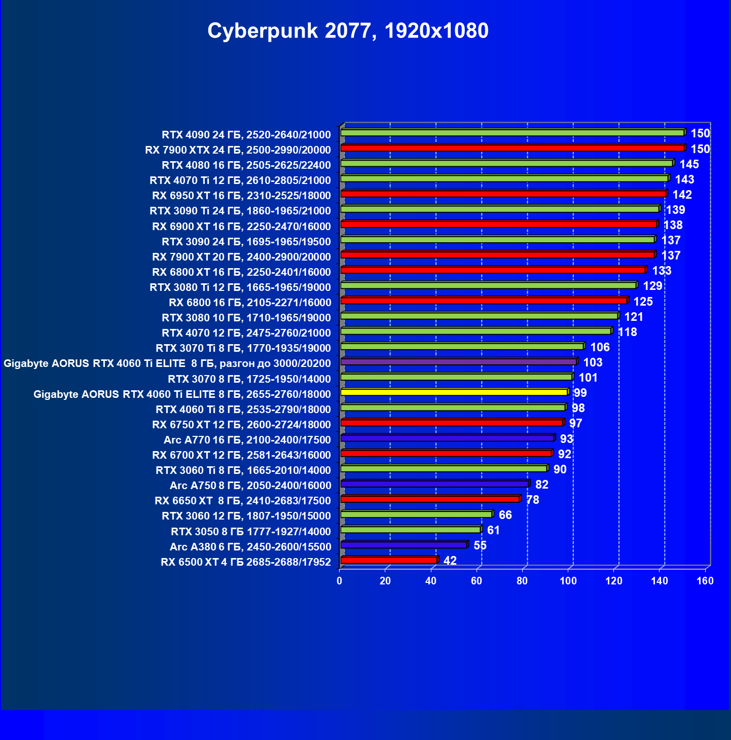 | 21 | Arc A770 16 ГБ, 2100—2400/17500 | 447 | 159 | 28 000 |