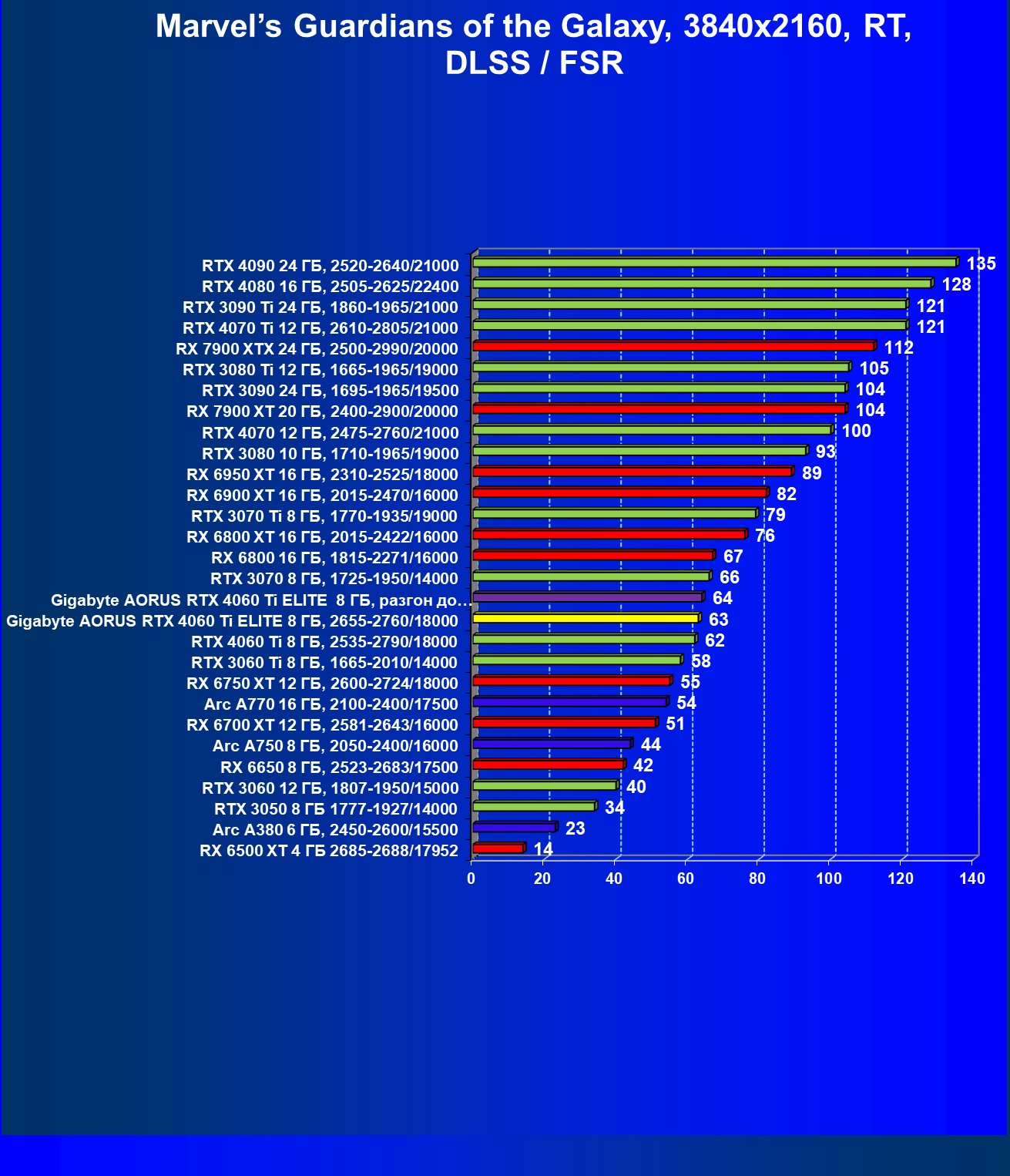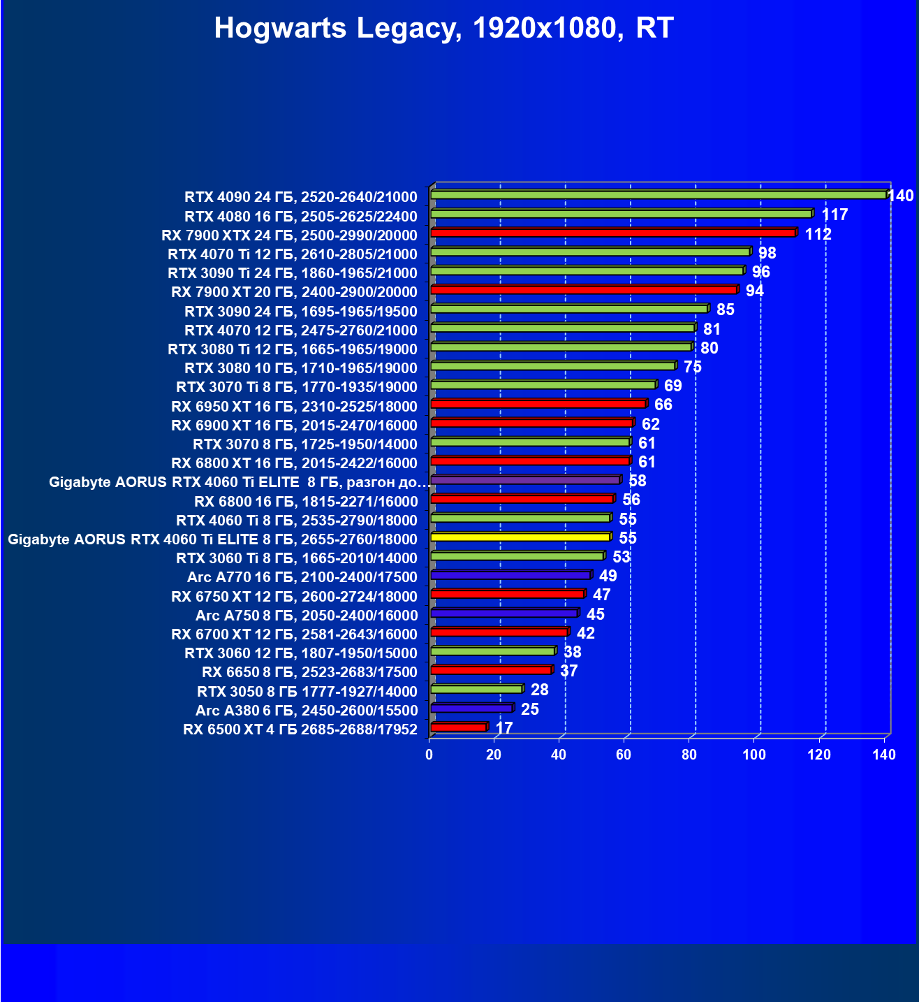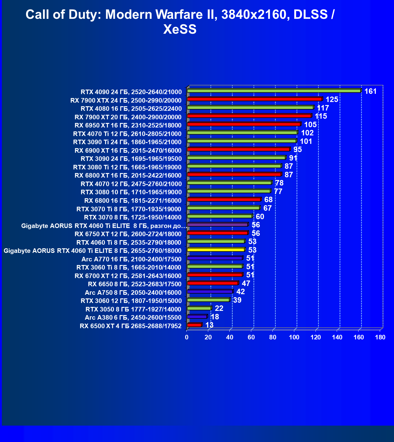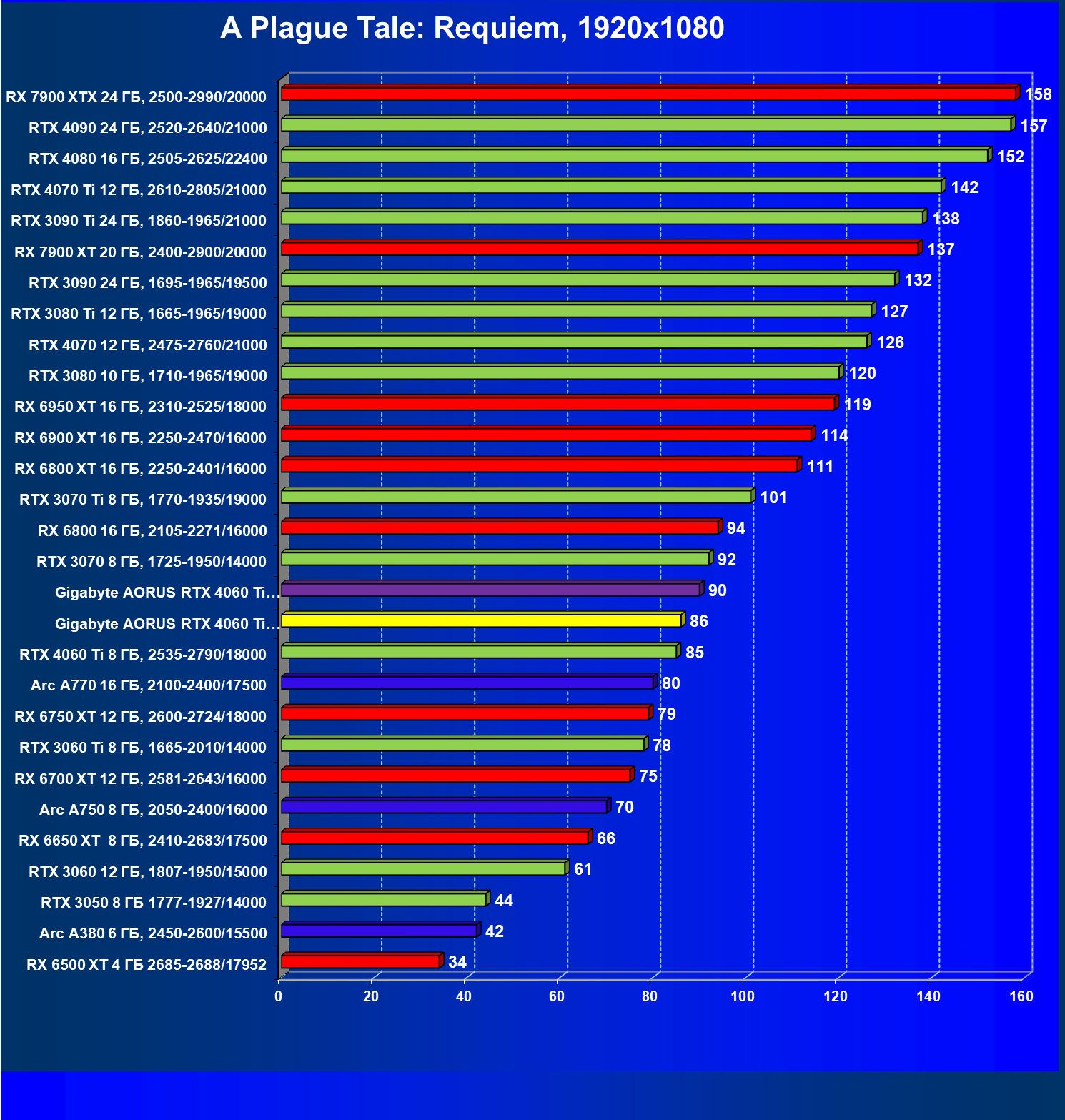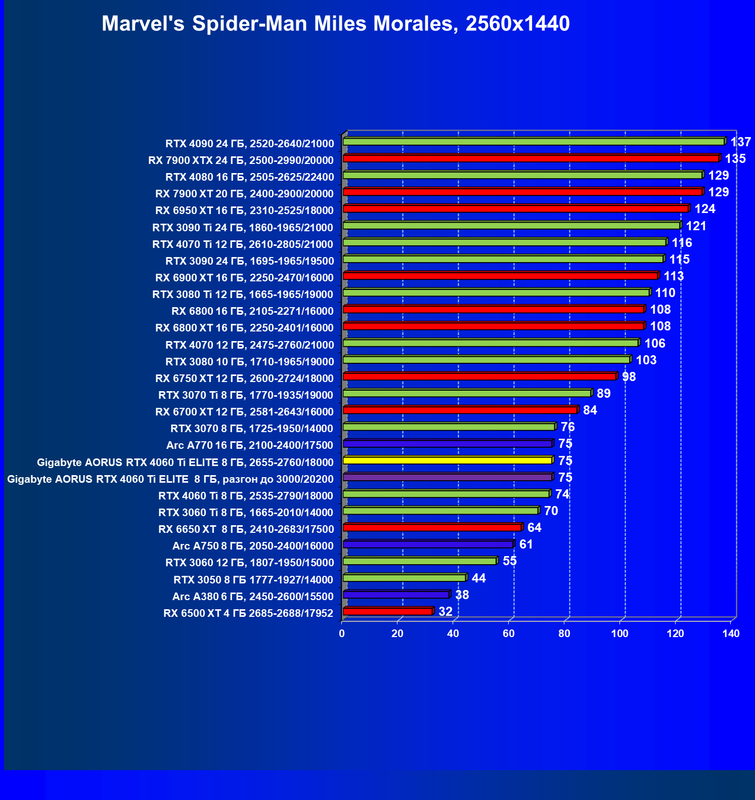 | 21 | Arc A770 16 ГБ, 2100—2400/17500 | 447 | 159 | 28 000 |