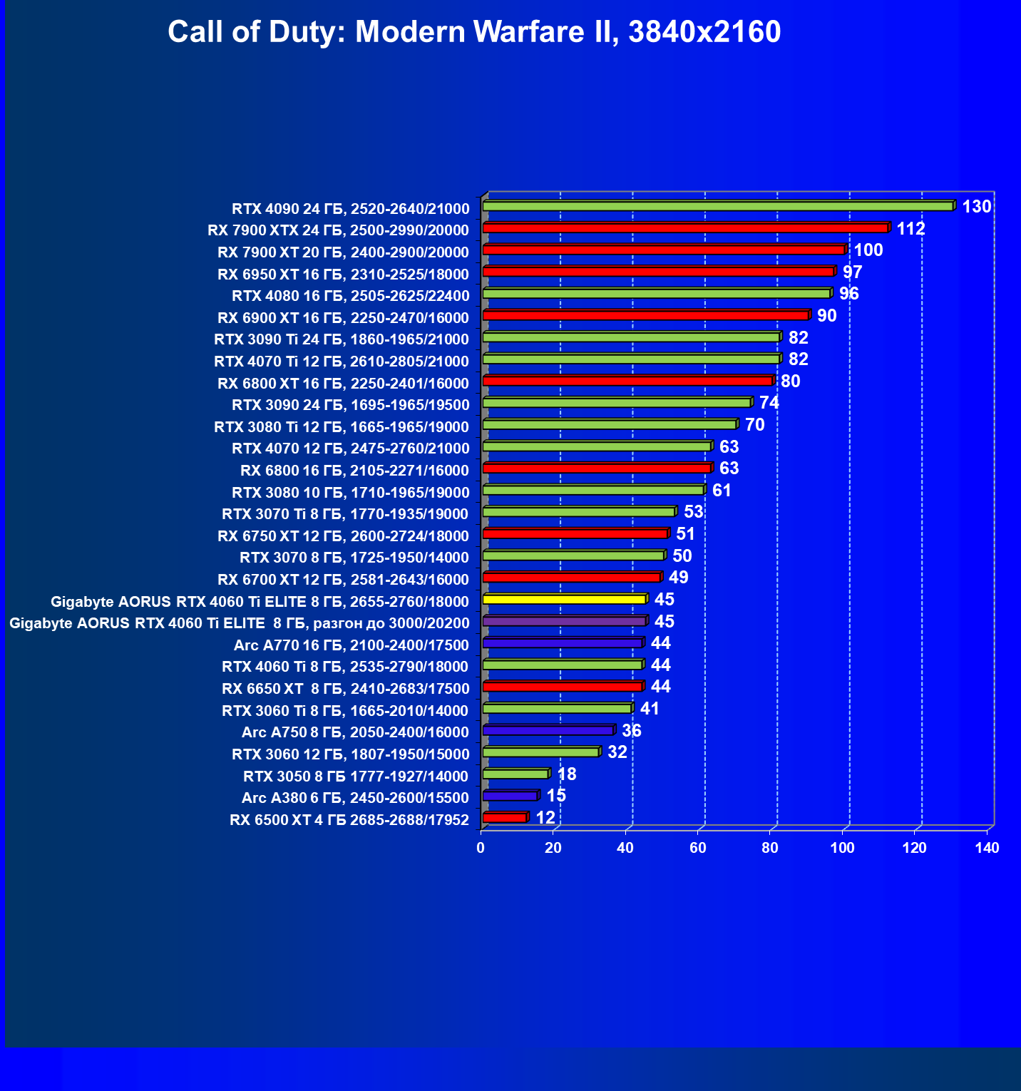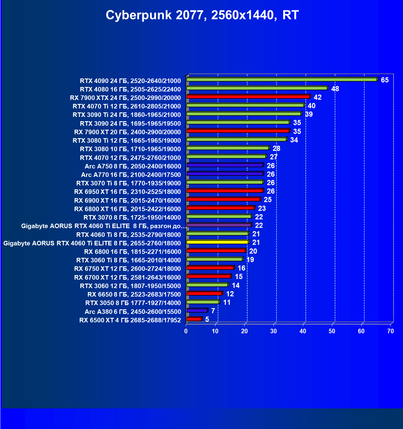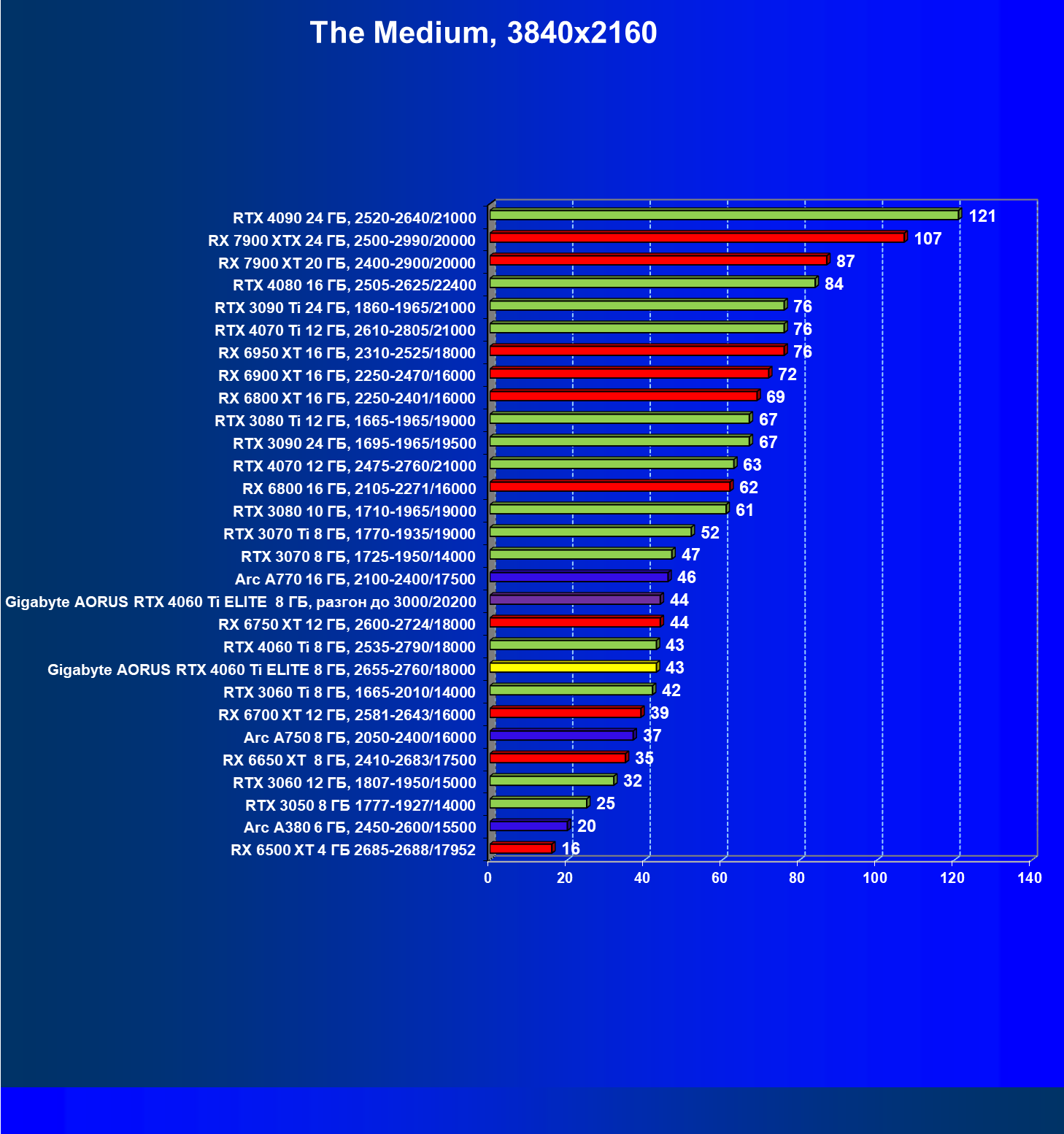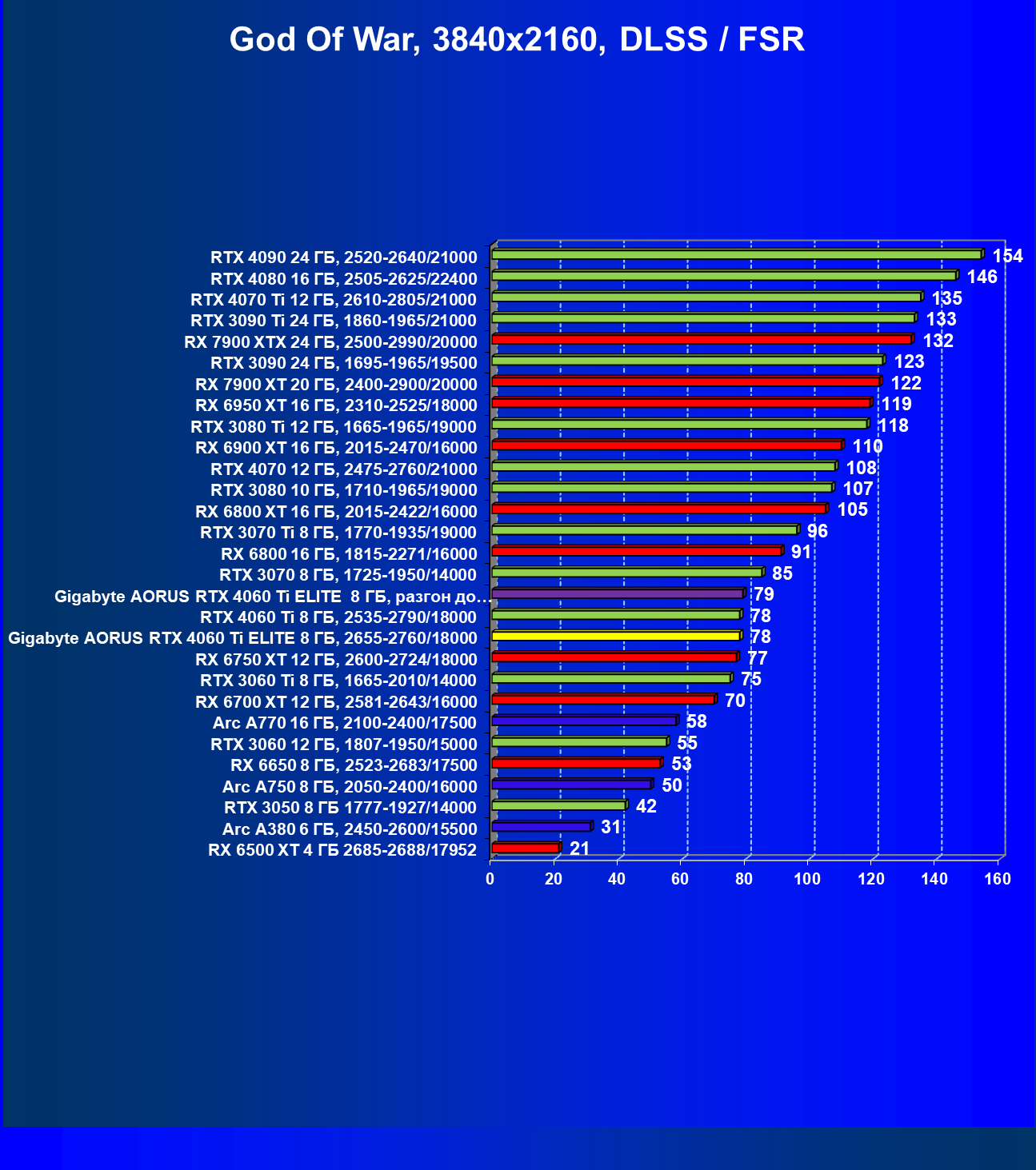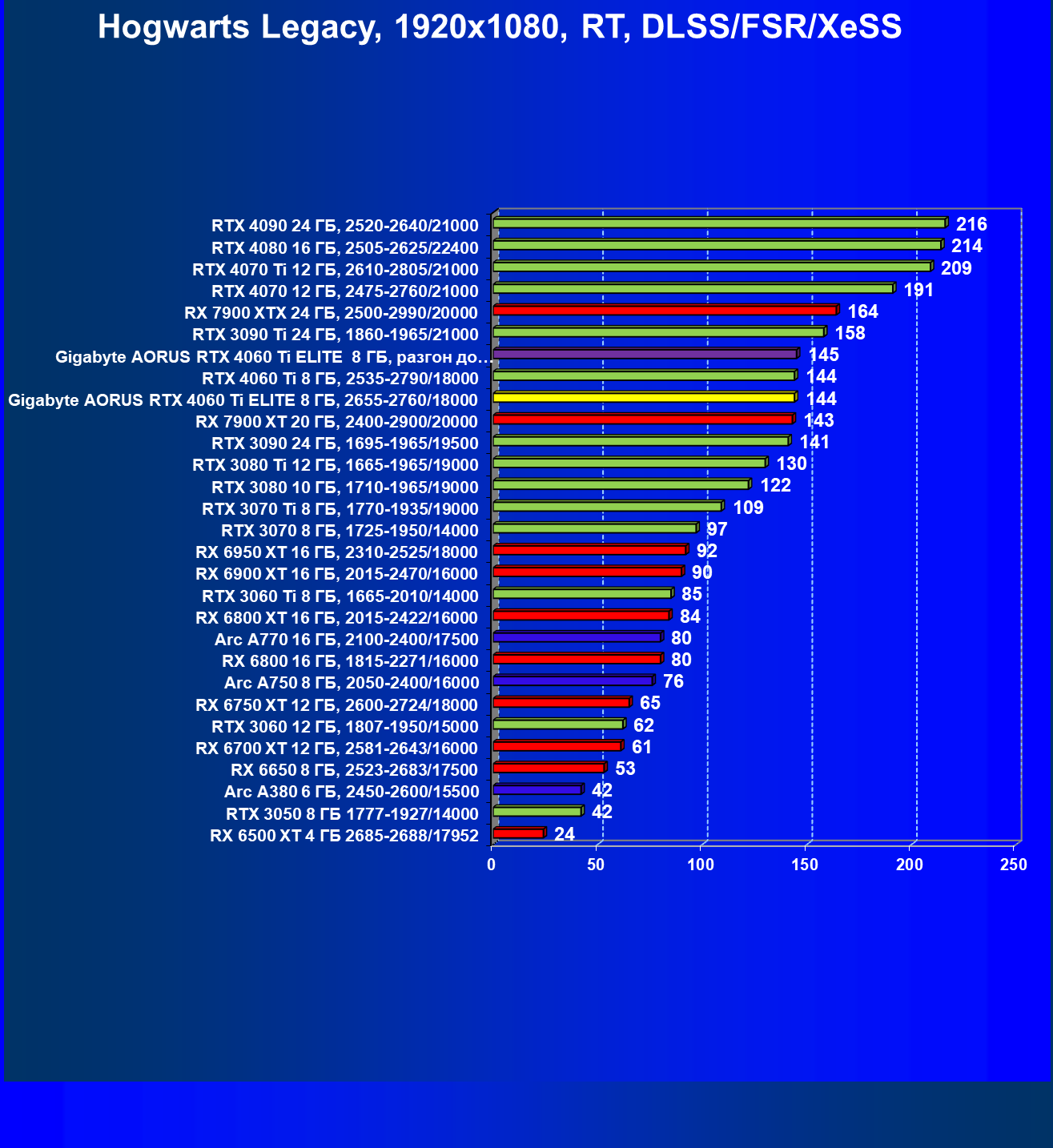 | 21 | Arc A770 16 ГБ, 2100—2400/17500 | 447 | 159 | 28 000 |