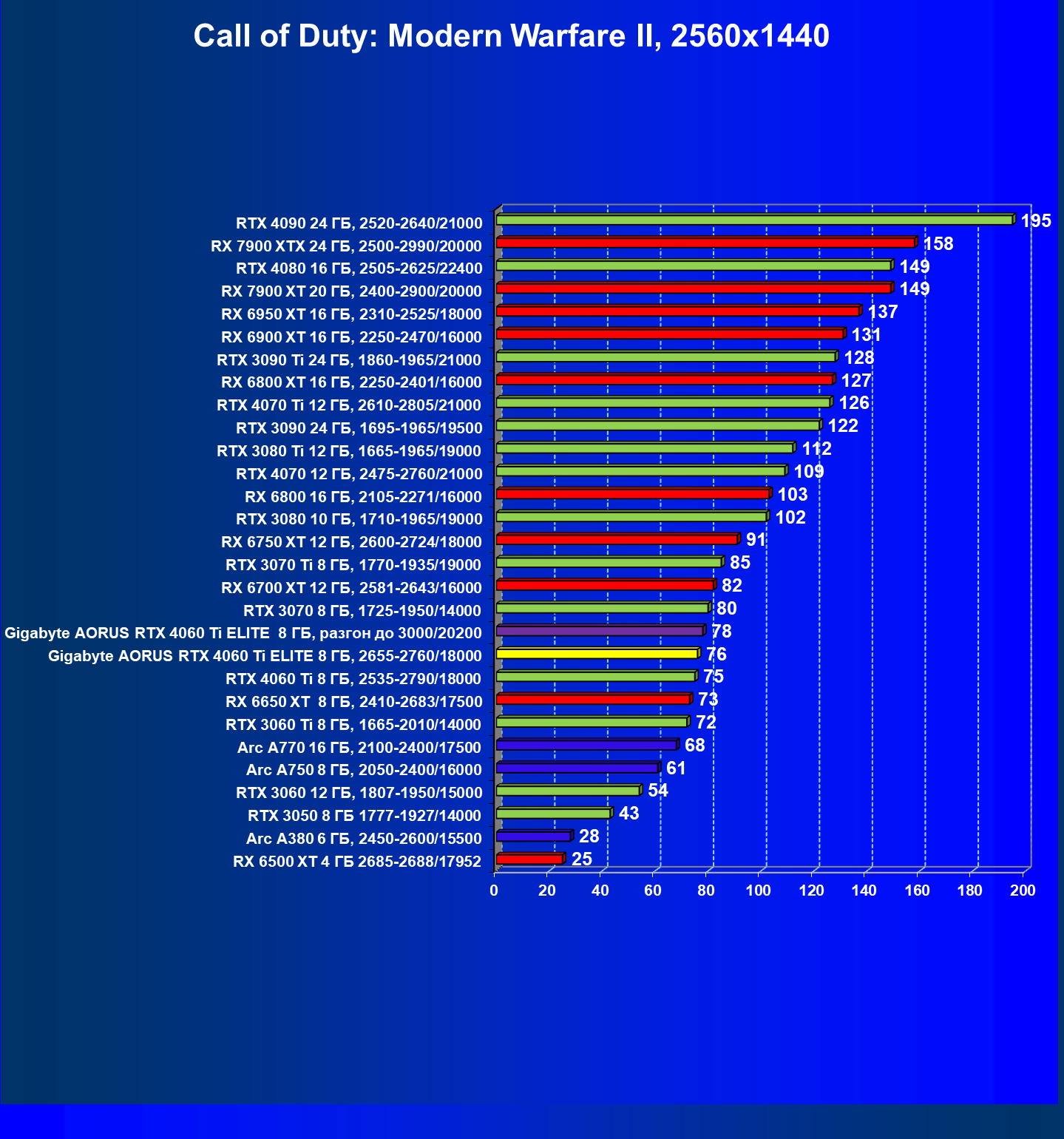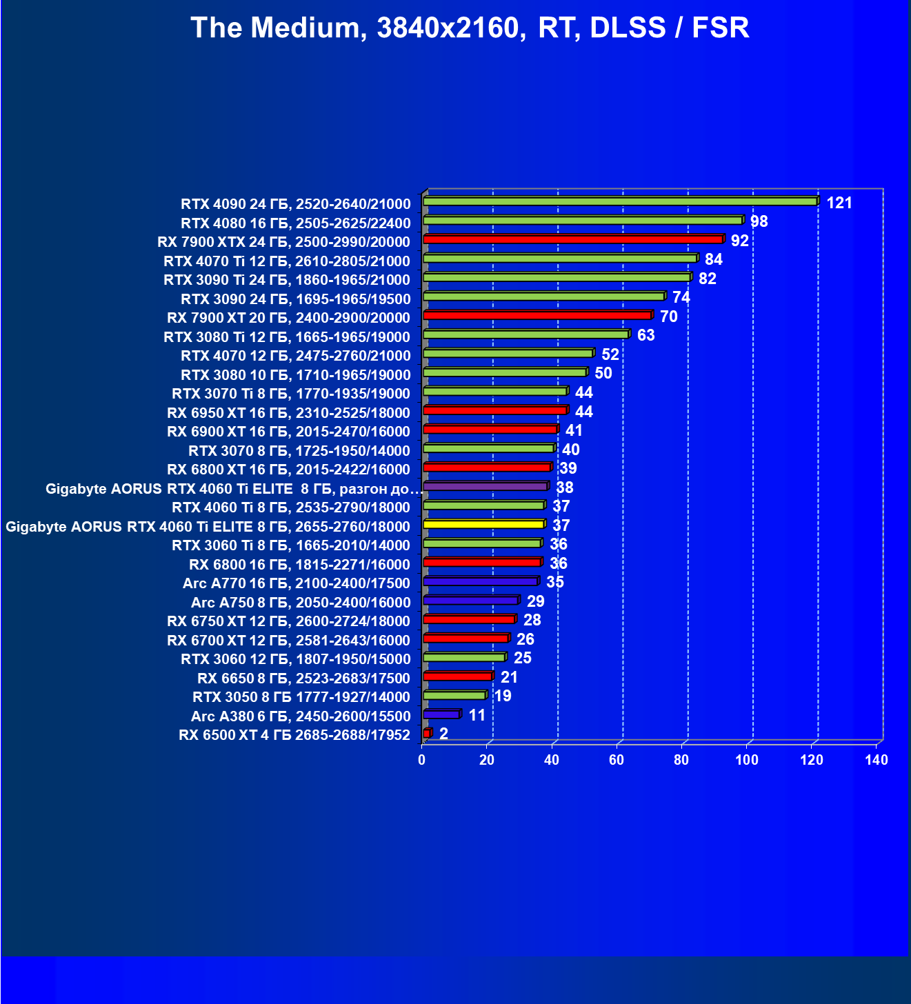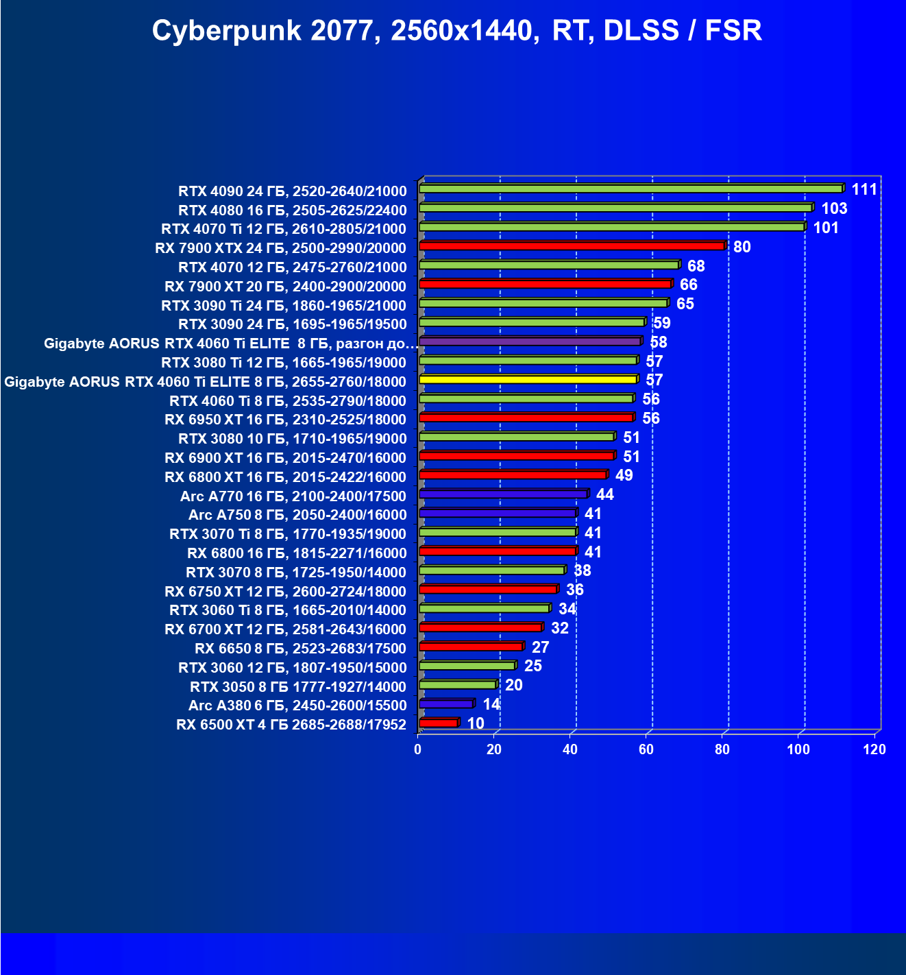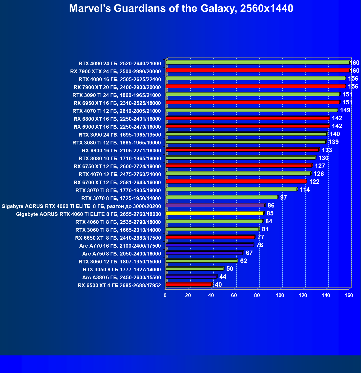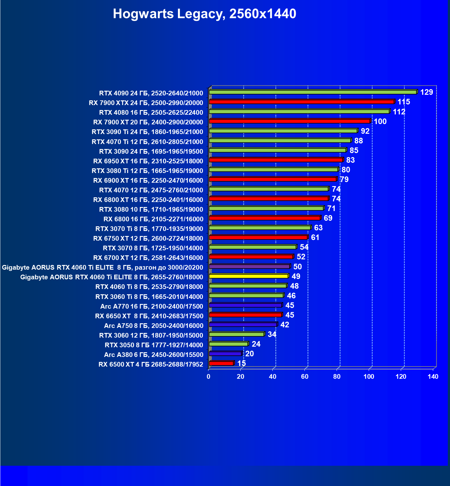 | 21 | Arc A770 16 ГБ, 2100—2400/17500 | 447 | 159 | 28 000 |