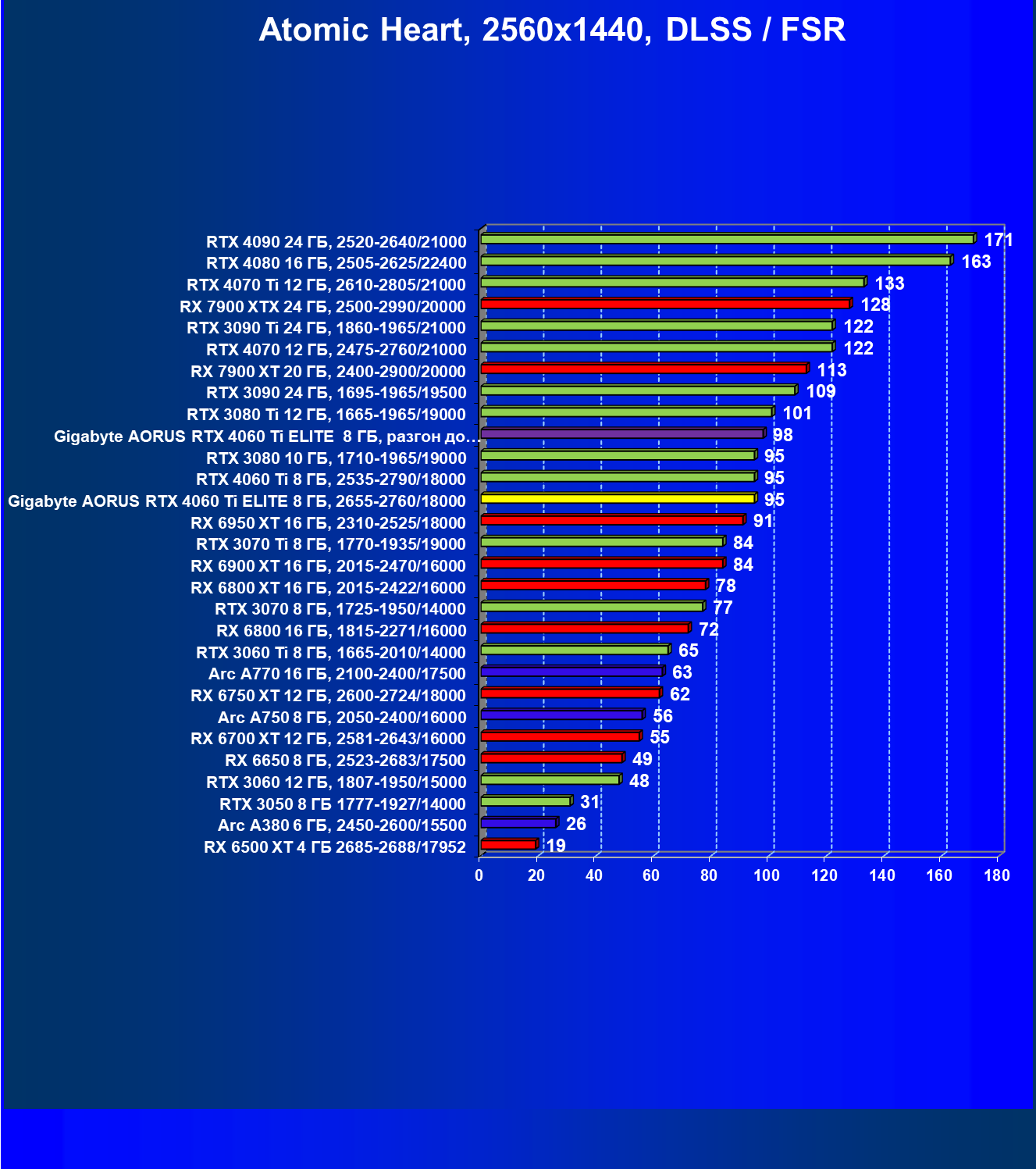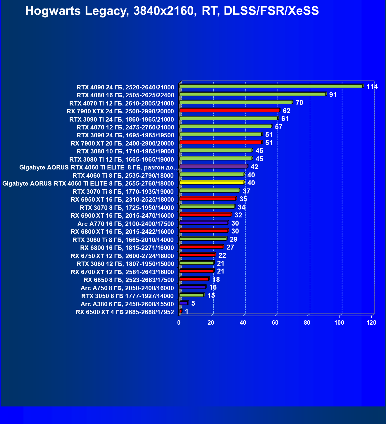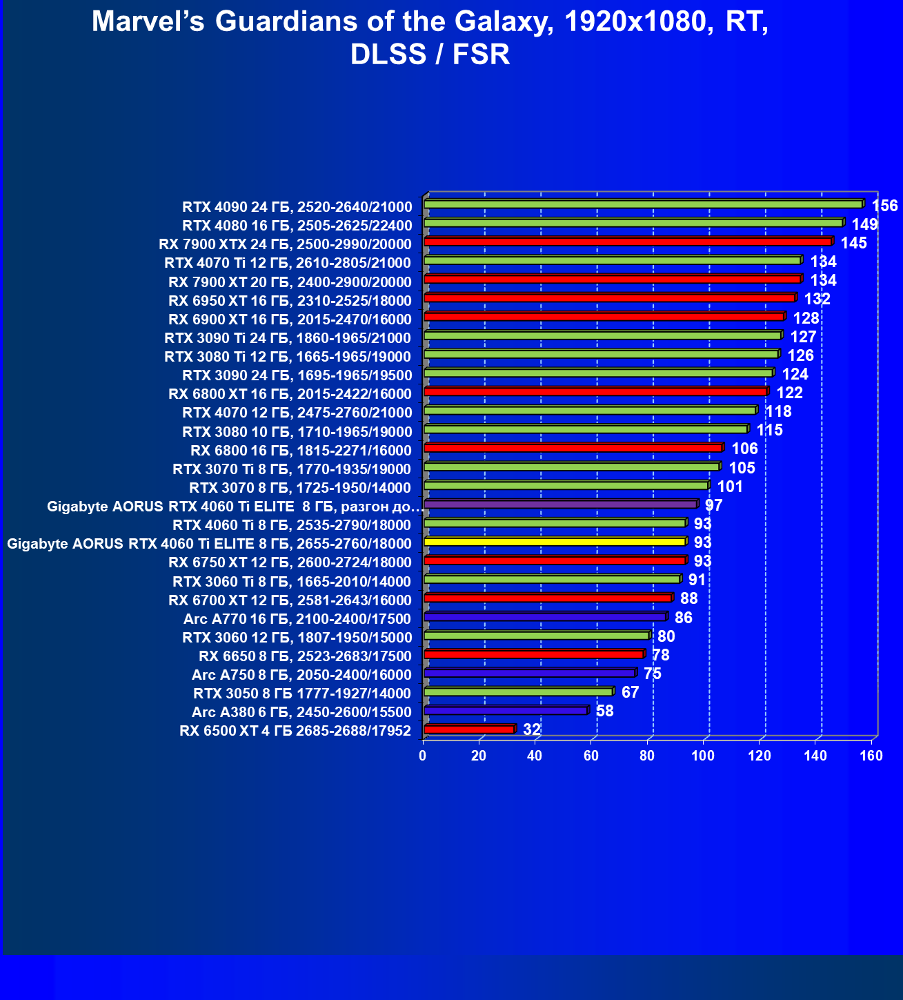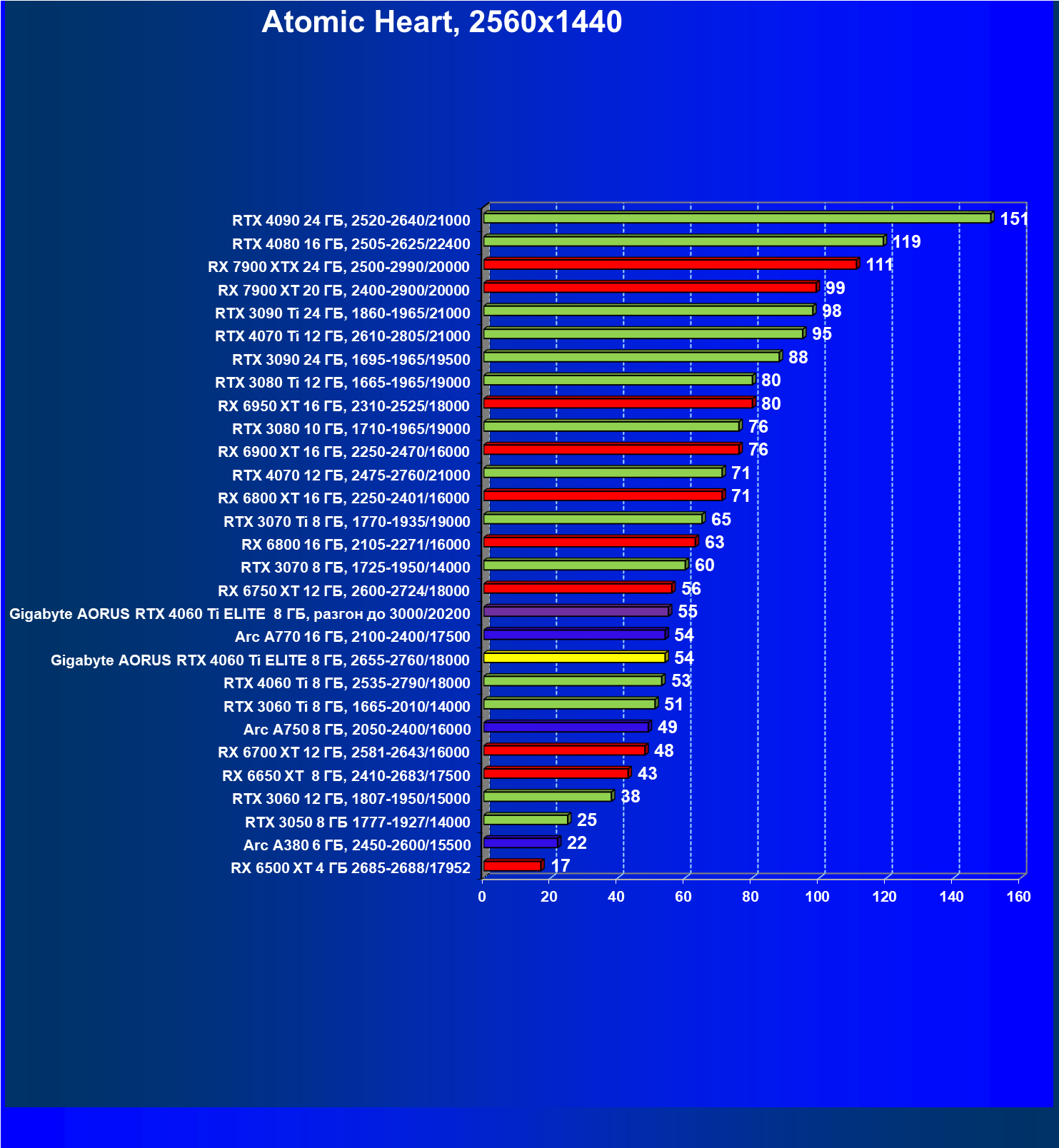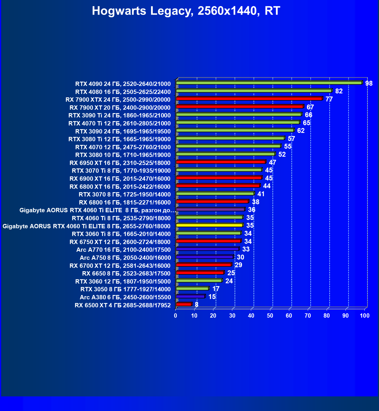 | 21 | Arc A770 16 ГБ, 2100—2400/17500 | 447 | 159 | 28 000 |