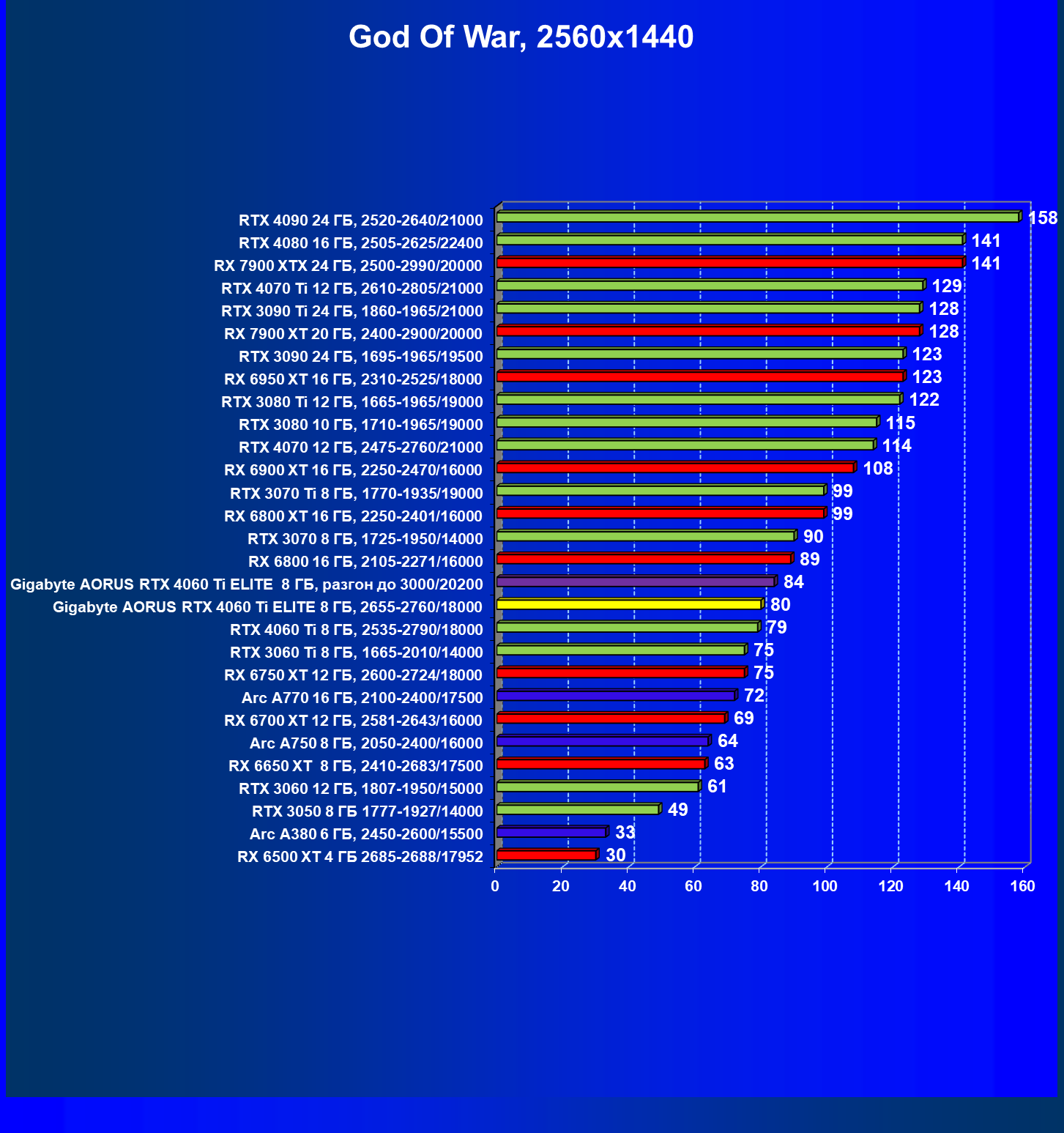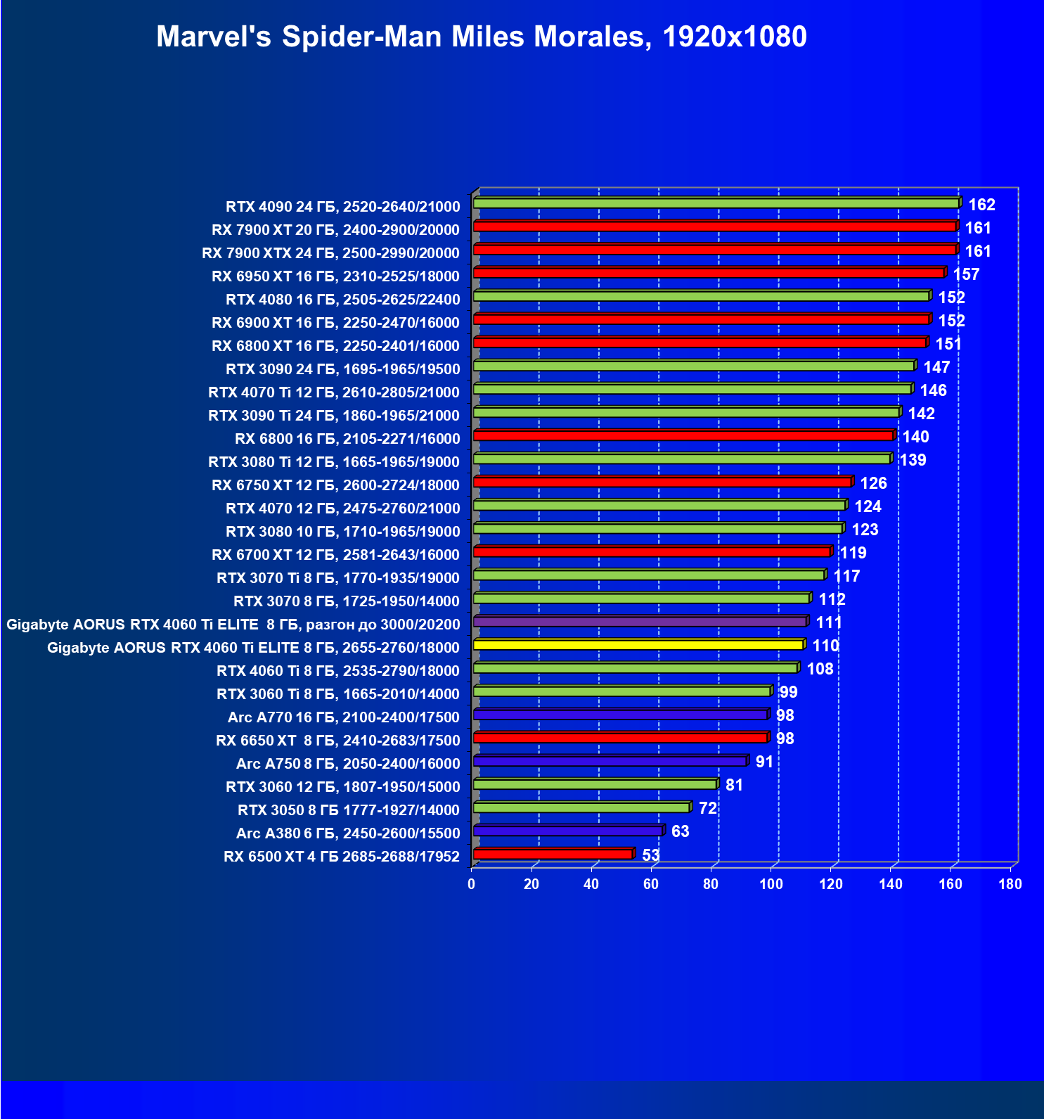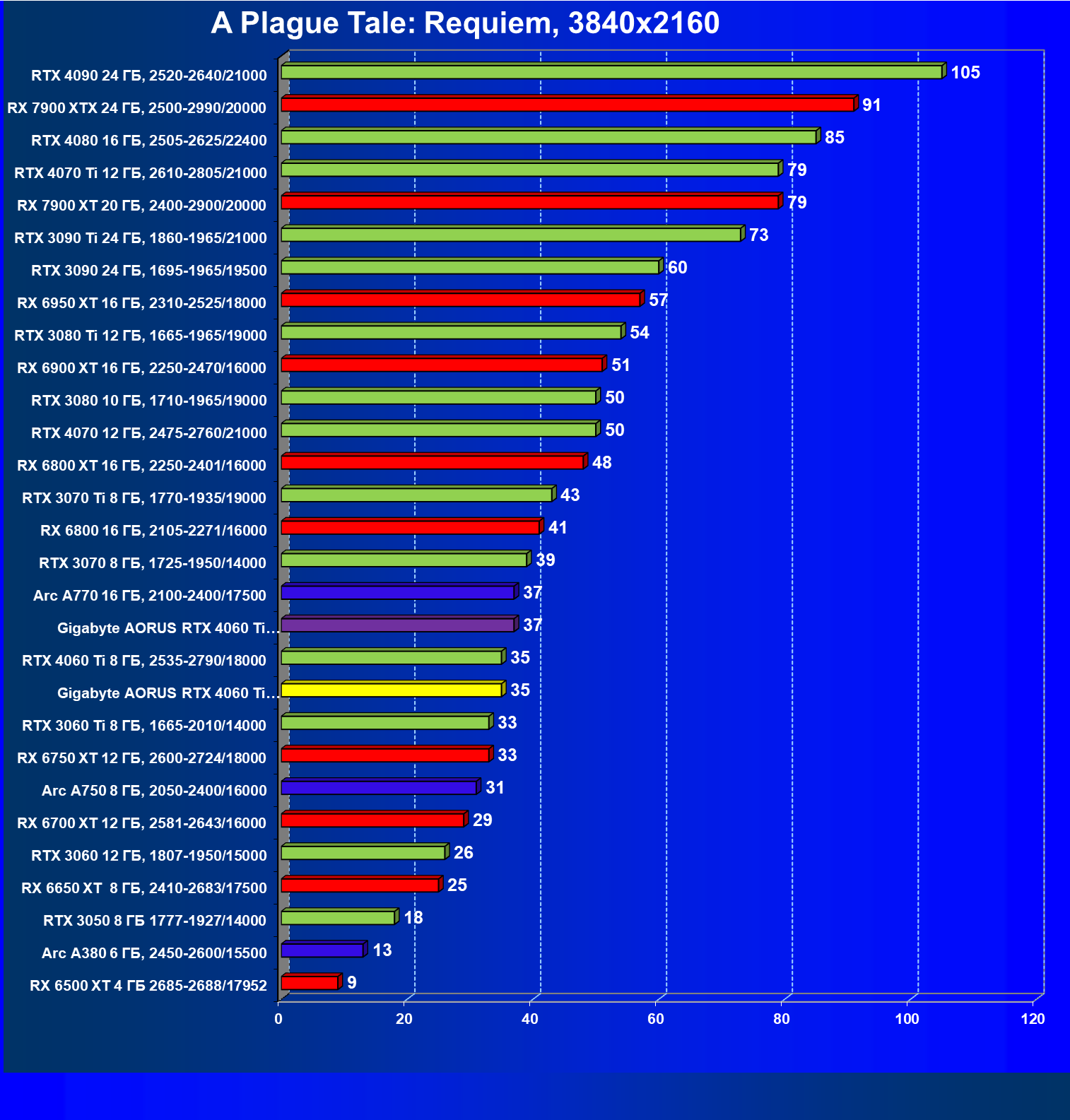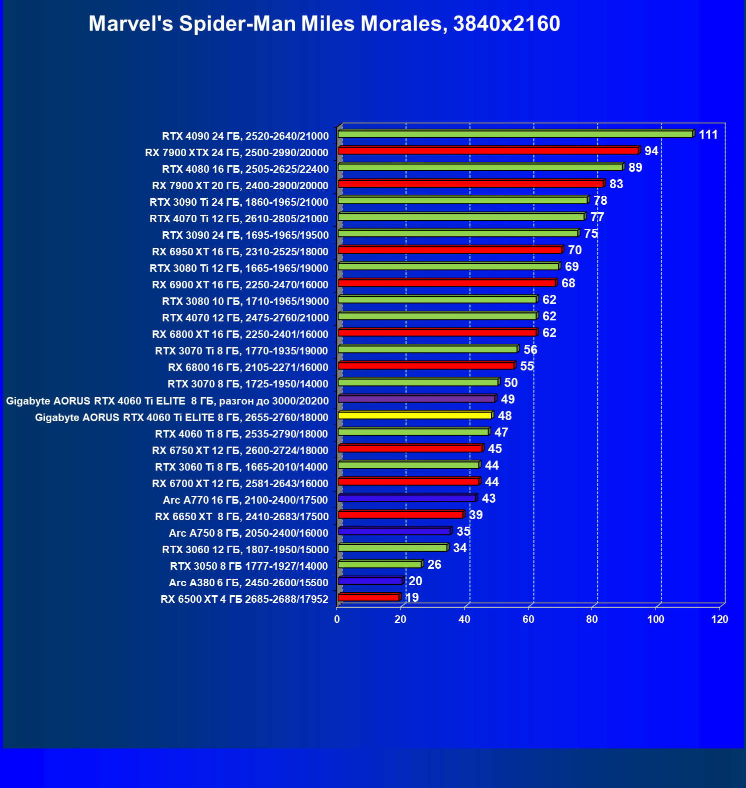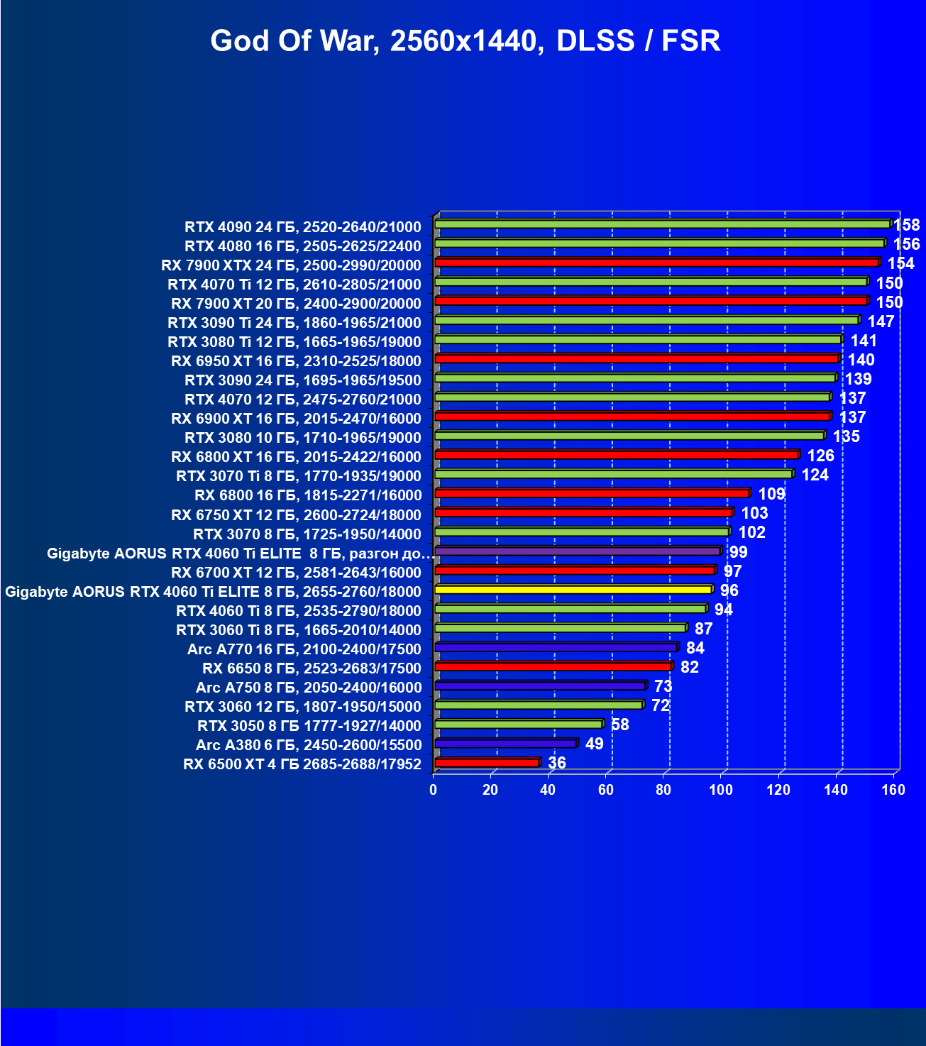 | 21 | Arc A770 16 ГБ, 2100—2400/17500 | 447 | 159 | 28 000 |
