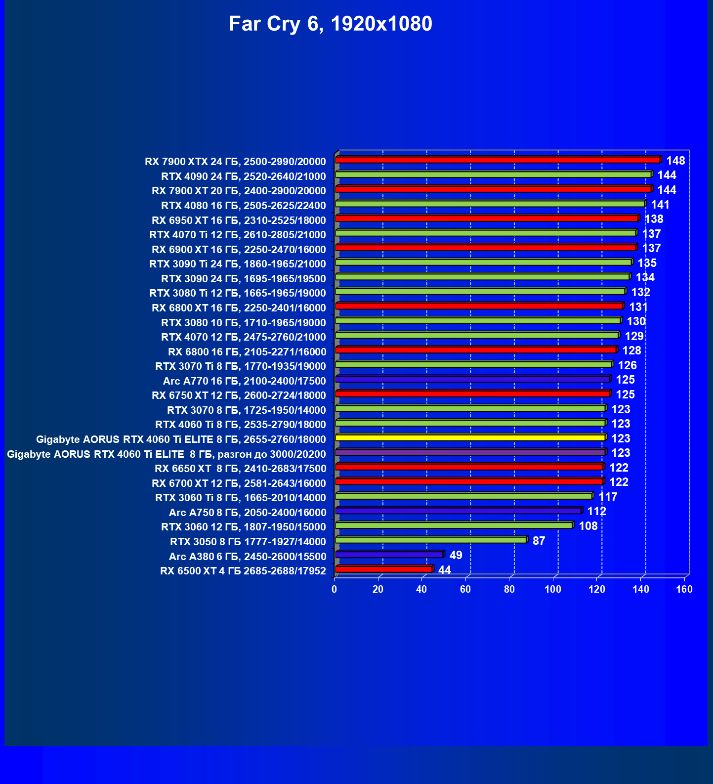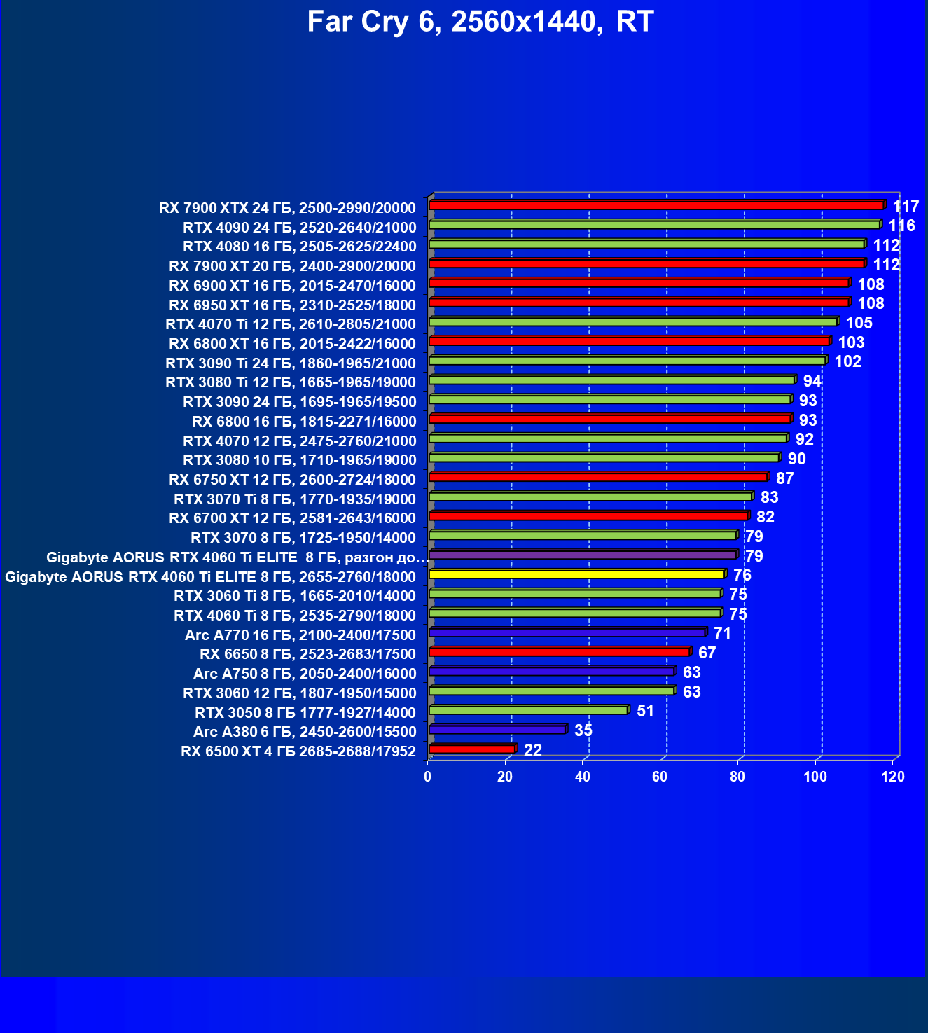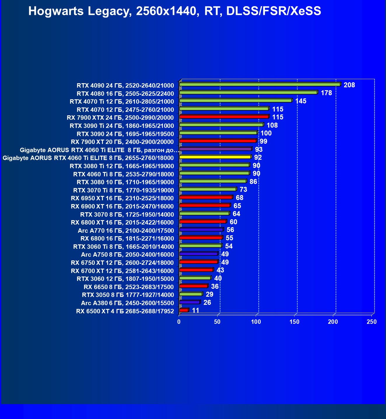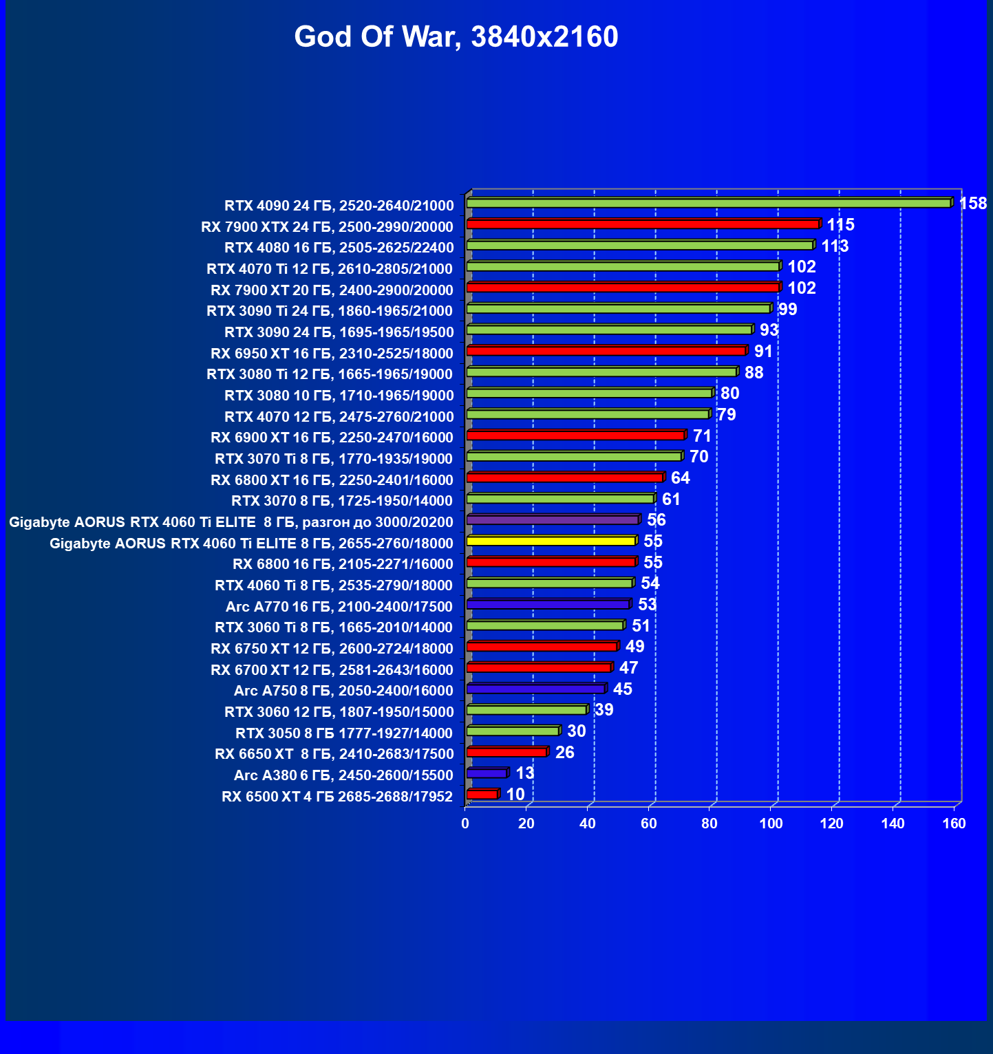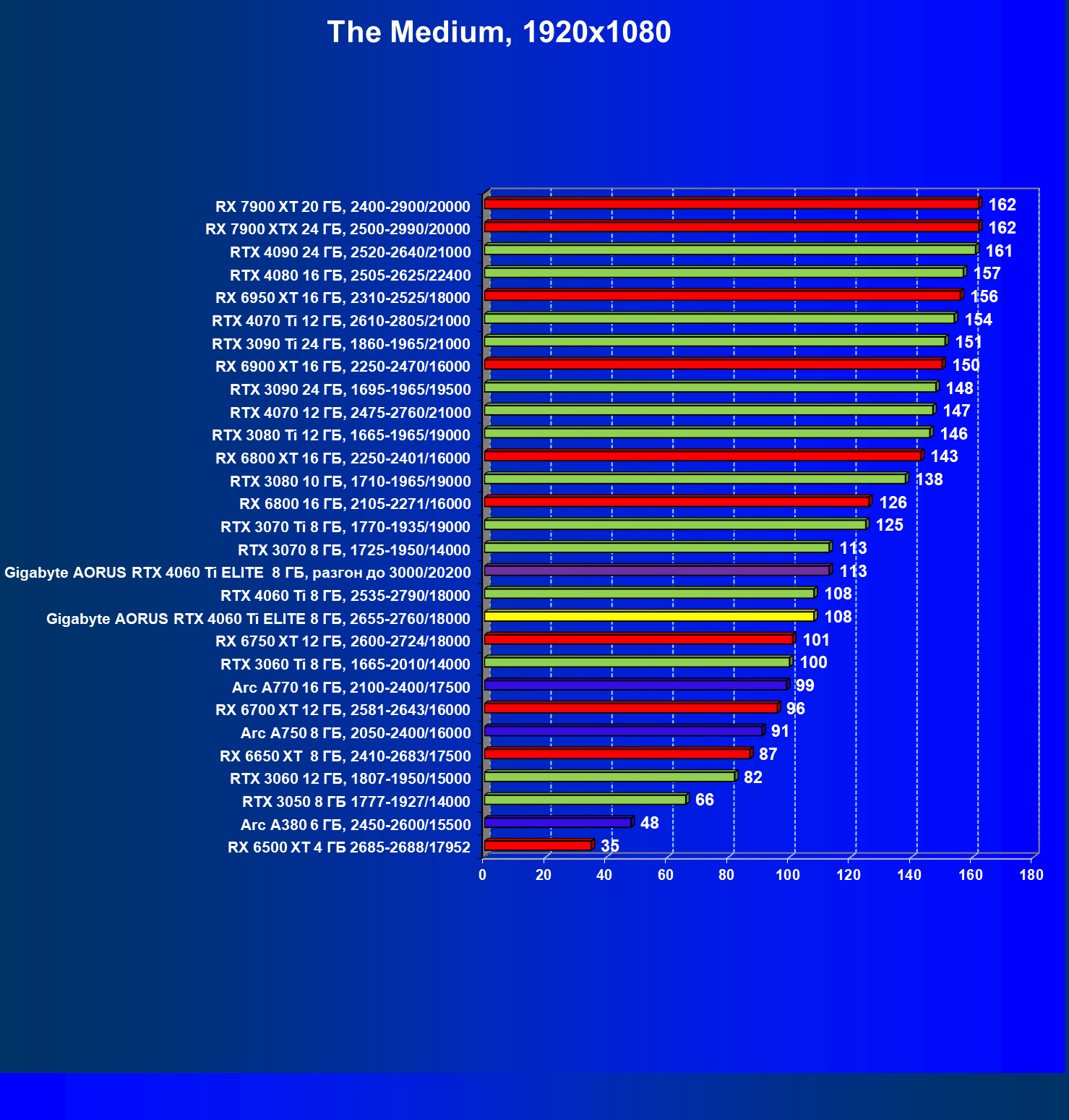 | 21 | Arc A770 16 ГБ, 2100—2400/17500 | 447 | 159 | 28 000 |