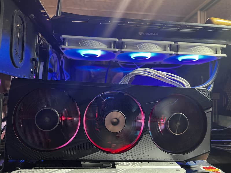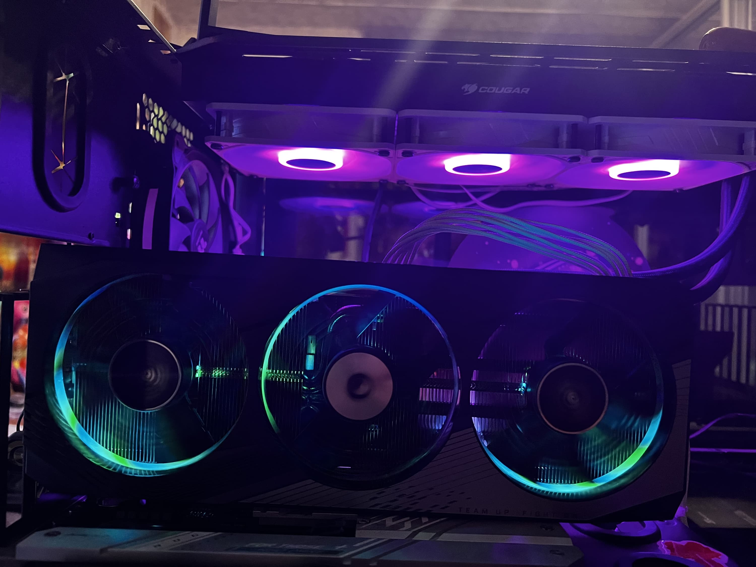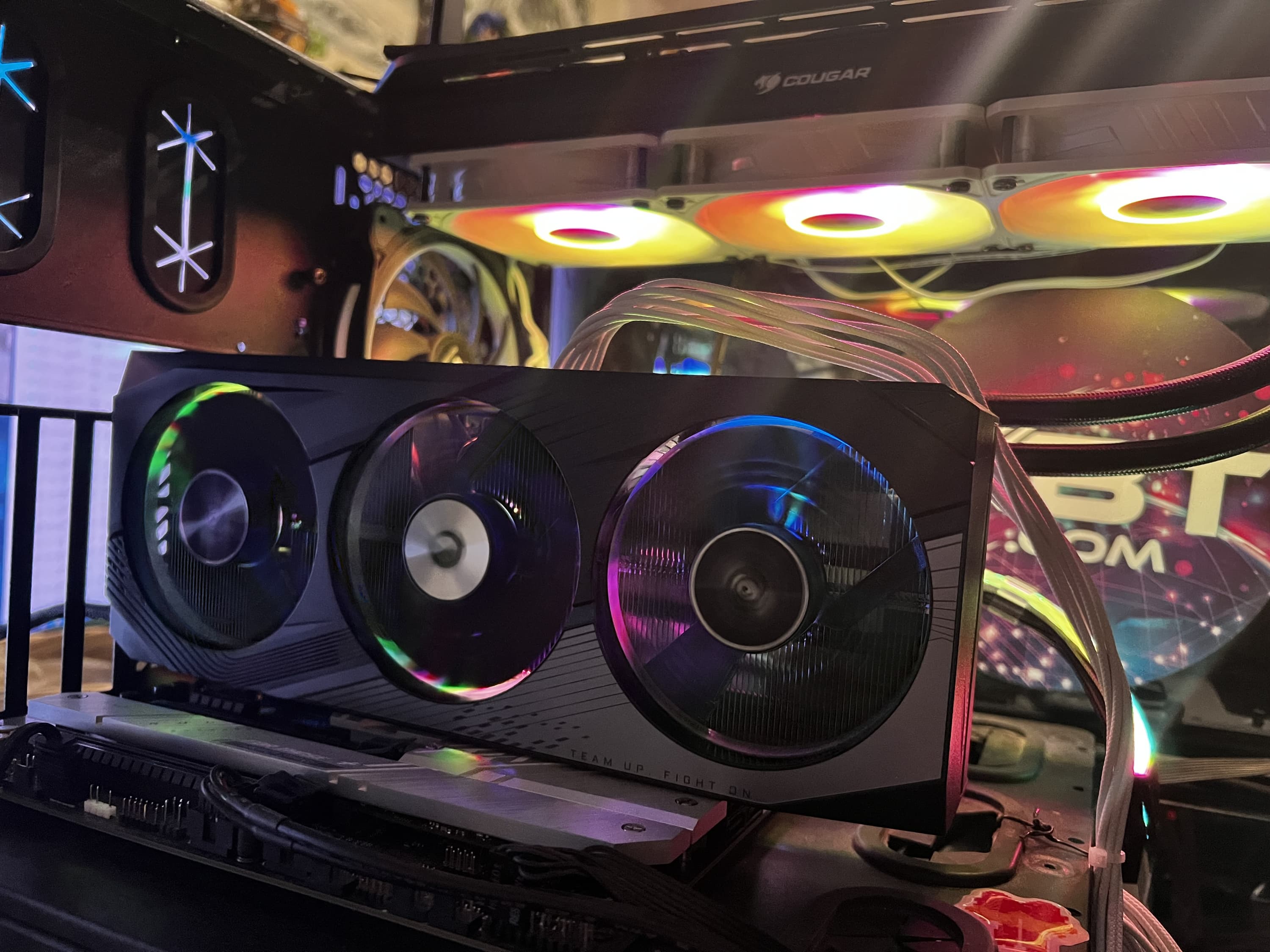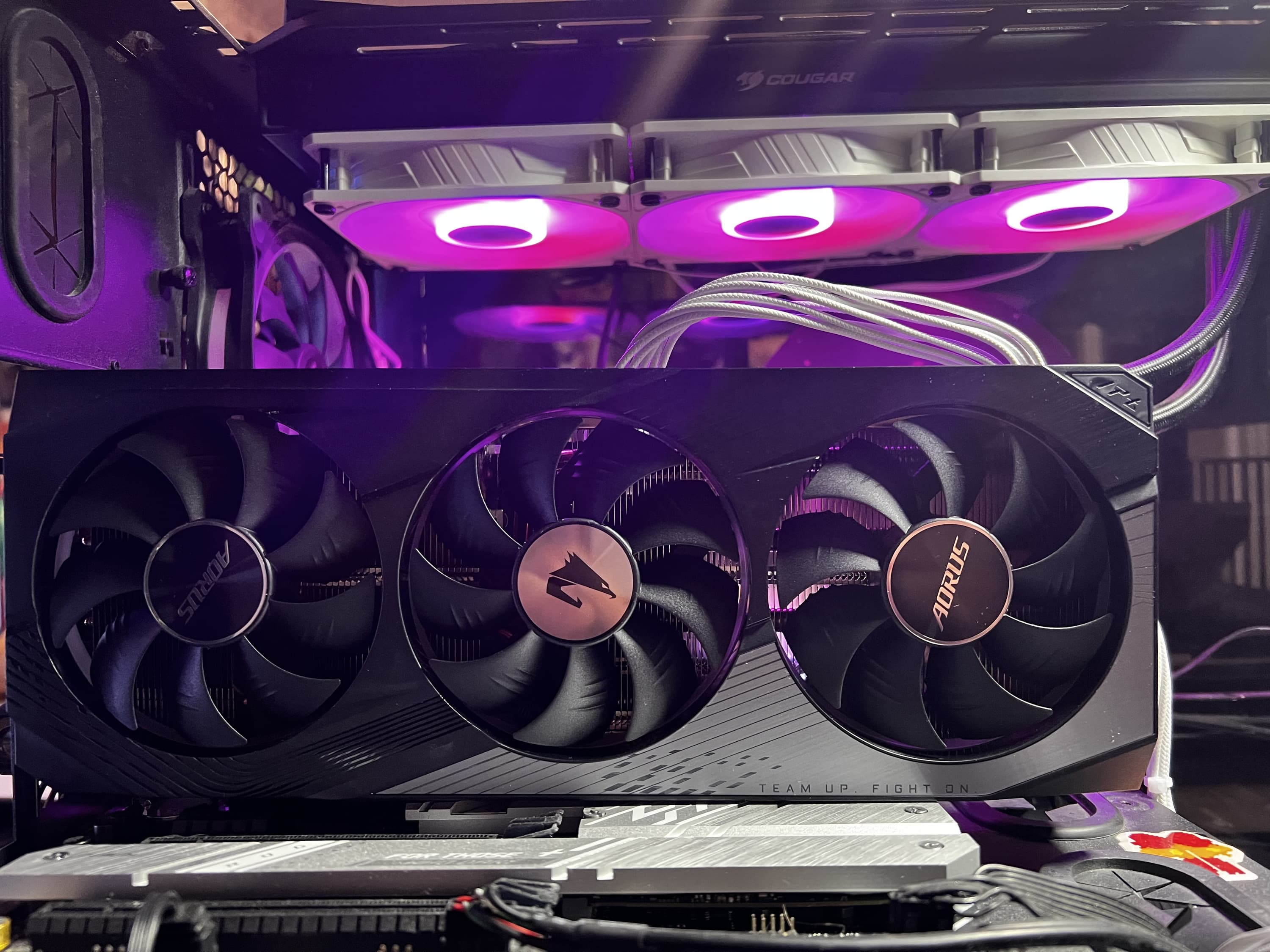 Подсвечены логотипы бренда на торцах и на оборотной стороне карты, а также организована подсветка по краям лопастей вентиляторов с помощью светодиодов на концах самих лопастей: она включается только при вращении вентиляторов; когда они стоят — свечения нет.