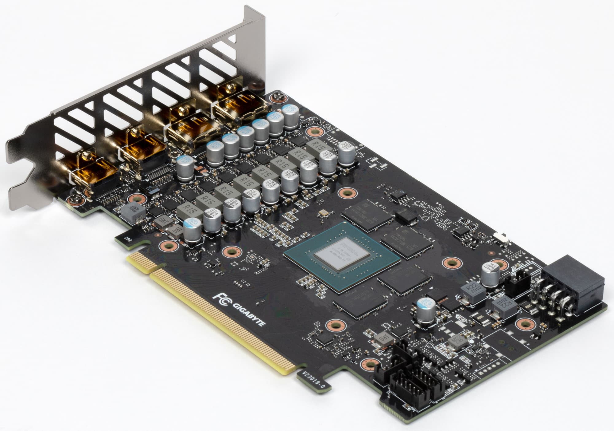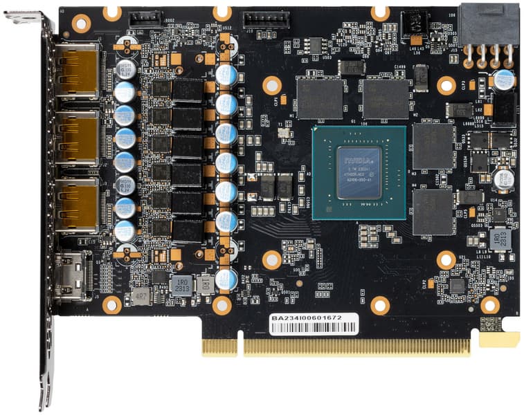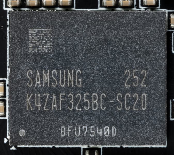 Карта имеет 8 ГБ памяти GDDR6 SDRAM, размещенной в 4 микросхемах по 16 Гбит на лицевой стороне PCB. Микросхемы памяти Samsung (K4ZAF325BC-SC20) рассчитаны на номинальную частоту работы в 2500 (20000) МГц.