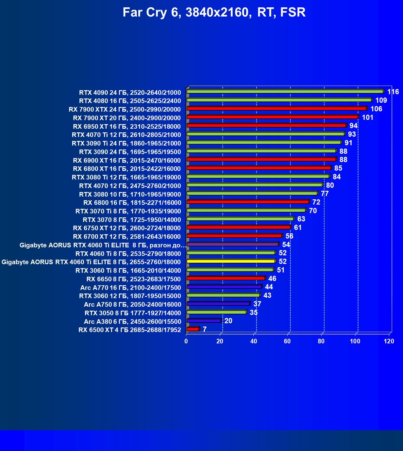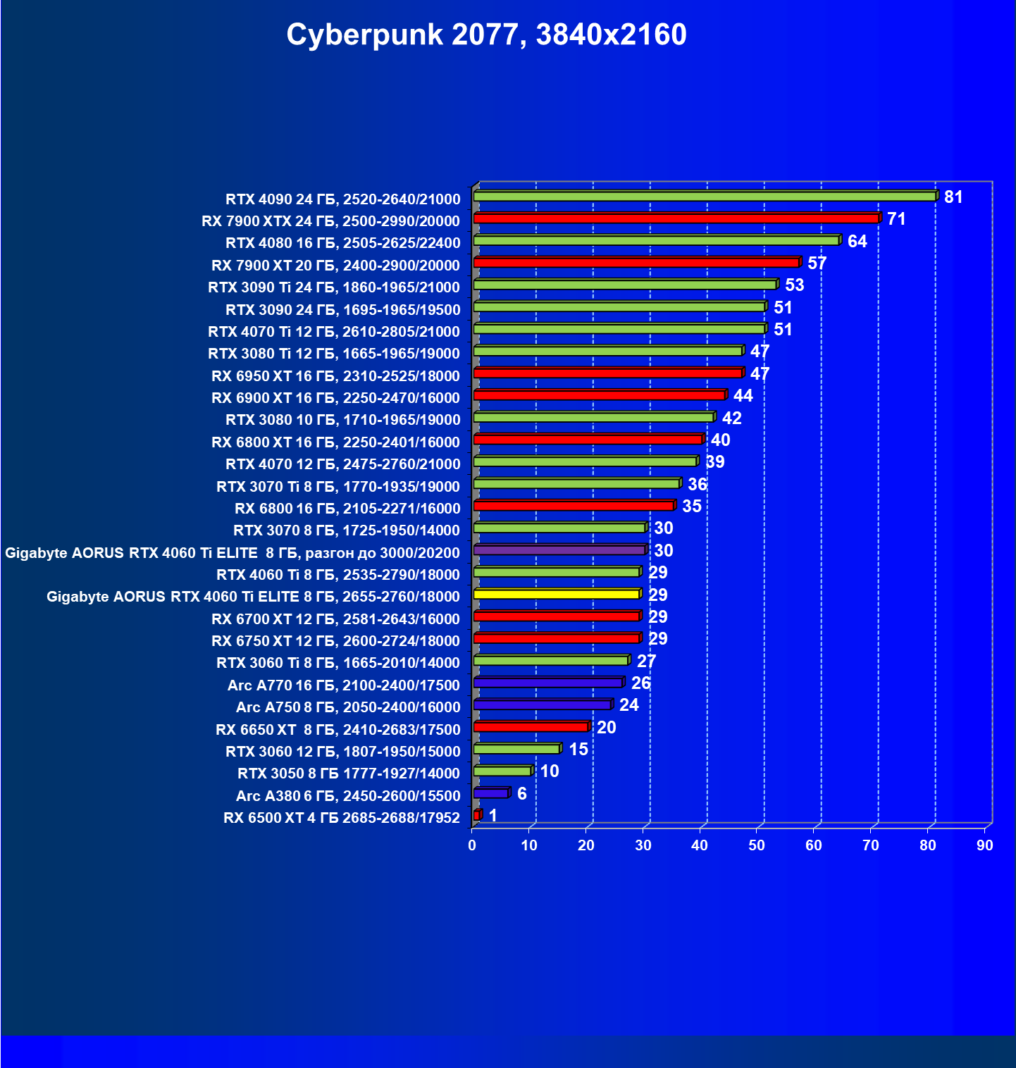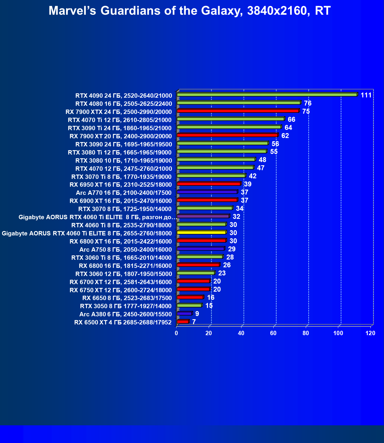 | 15 | Gigabyte Aorus RTX 4060 Ti Elite 8 ГБ, разгон до 3000/20200 | 563 | 117 | 48 000 |