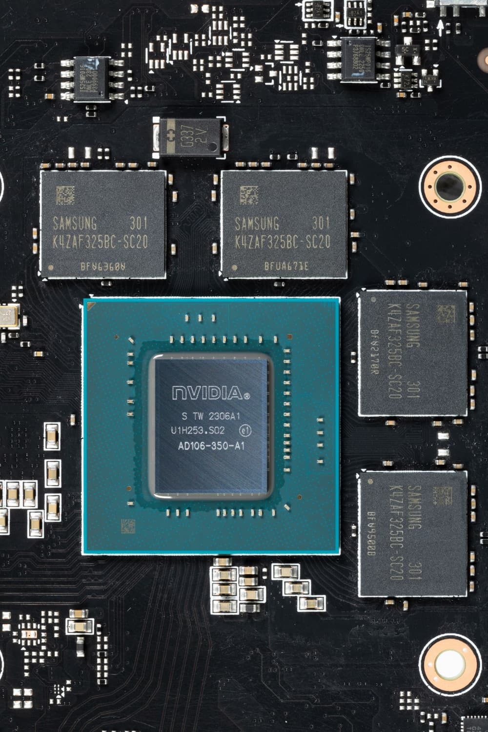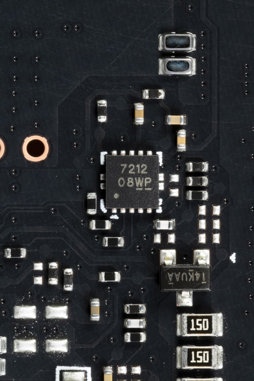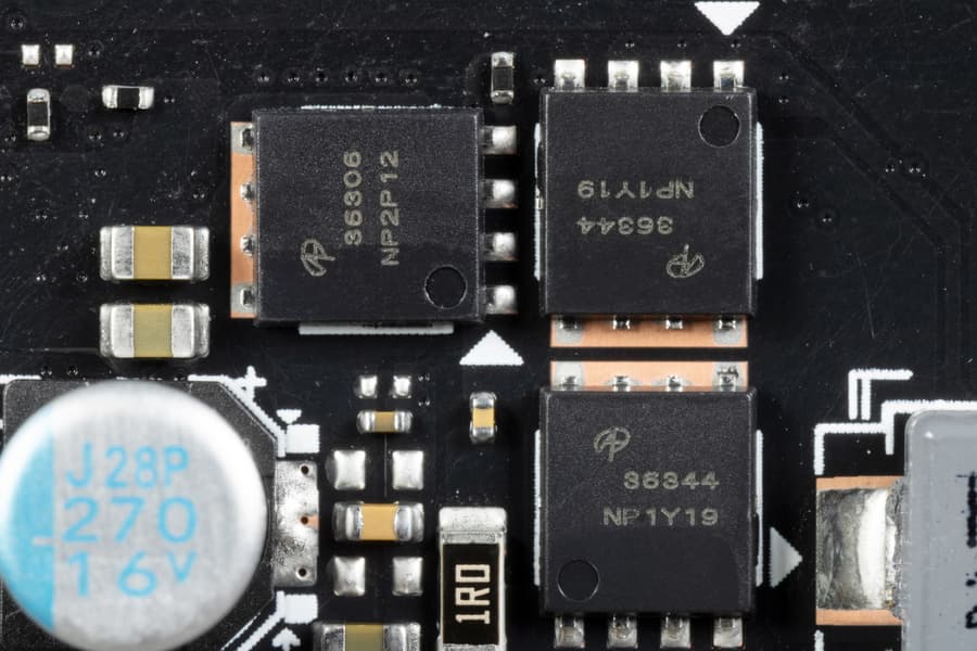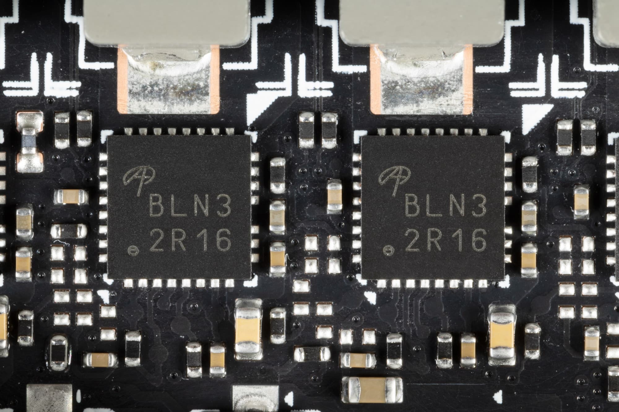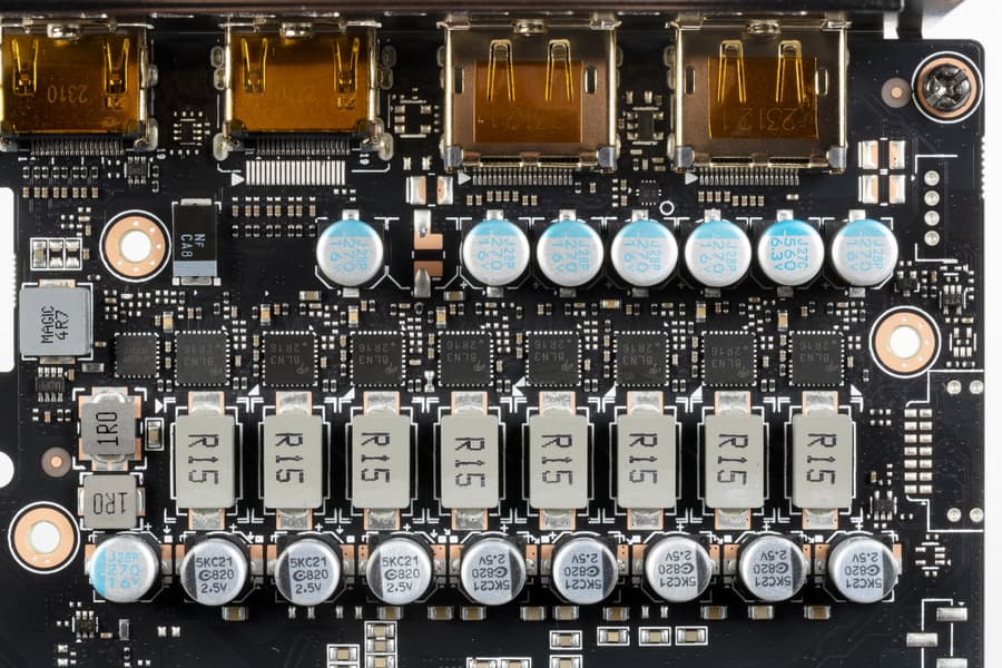 В преобразователе питания ядра, традиционно для всех видеокарт Nvidia, используются транзисторные сборки DrMOS — в данном случае AOZ5316 (Alpha&Omega Semi), каждая из которых рассчитана максимально на 55 А.