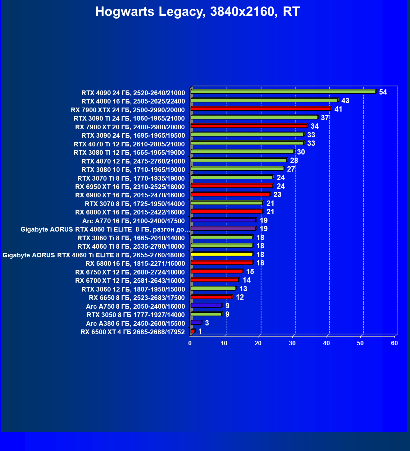 | 19 | Gigabyte Aorus RTX 4060 Ti Elite 8 ГБ, 2655—2760/18000 | 333 | 69 | 48 000 |