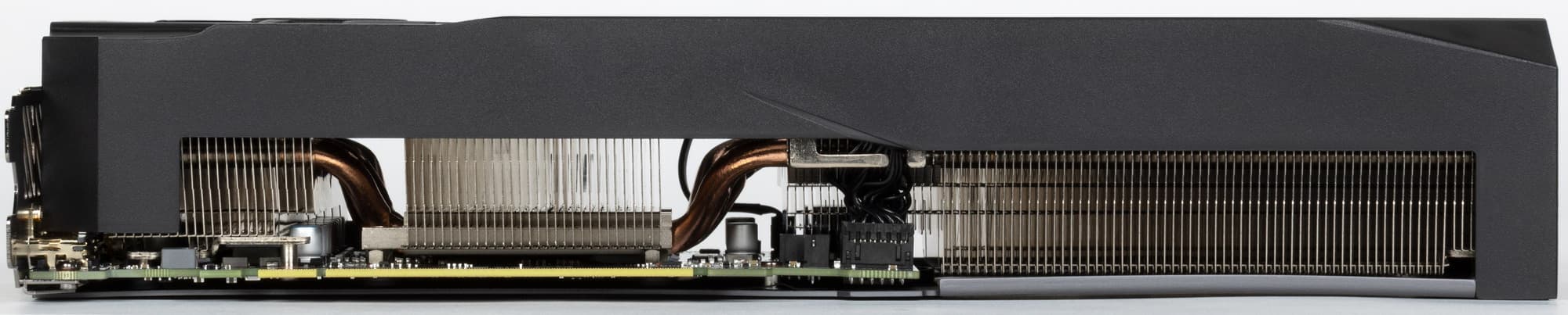 У карты Gigabyte основой кулера является многосекционный пластинчатый никелированный радиатор с тепловыми трубками, распределяющими тепло по ребрам радиатора. Трубки впрессованы в центр медной подошвы и припаяны к ней, они непосредственно контактируют с поверхностью кристалла GPU.