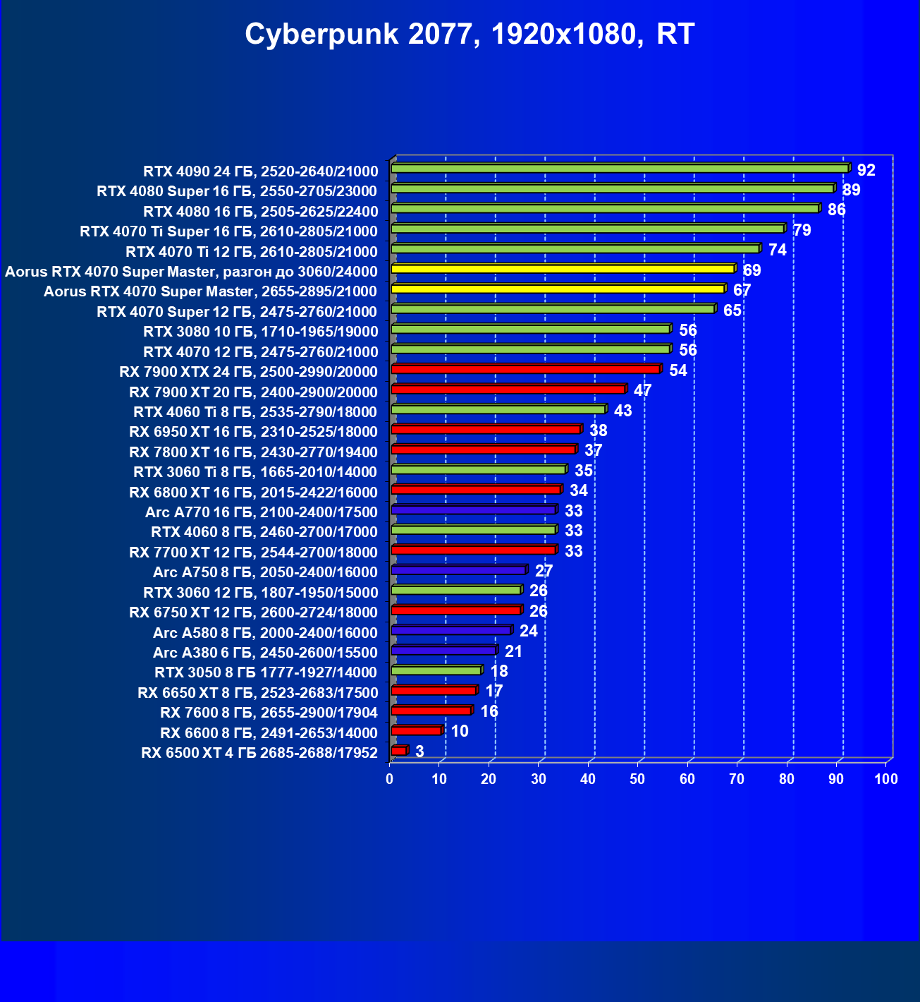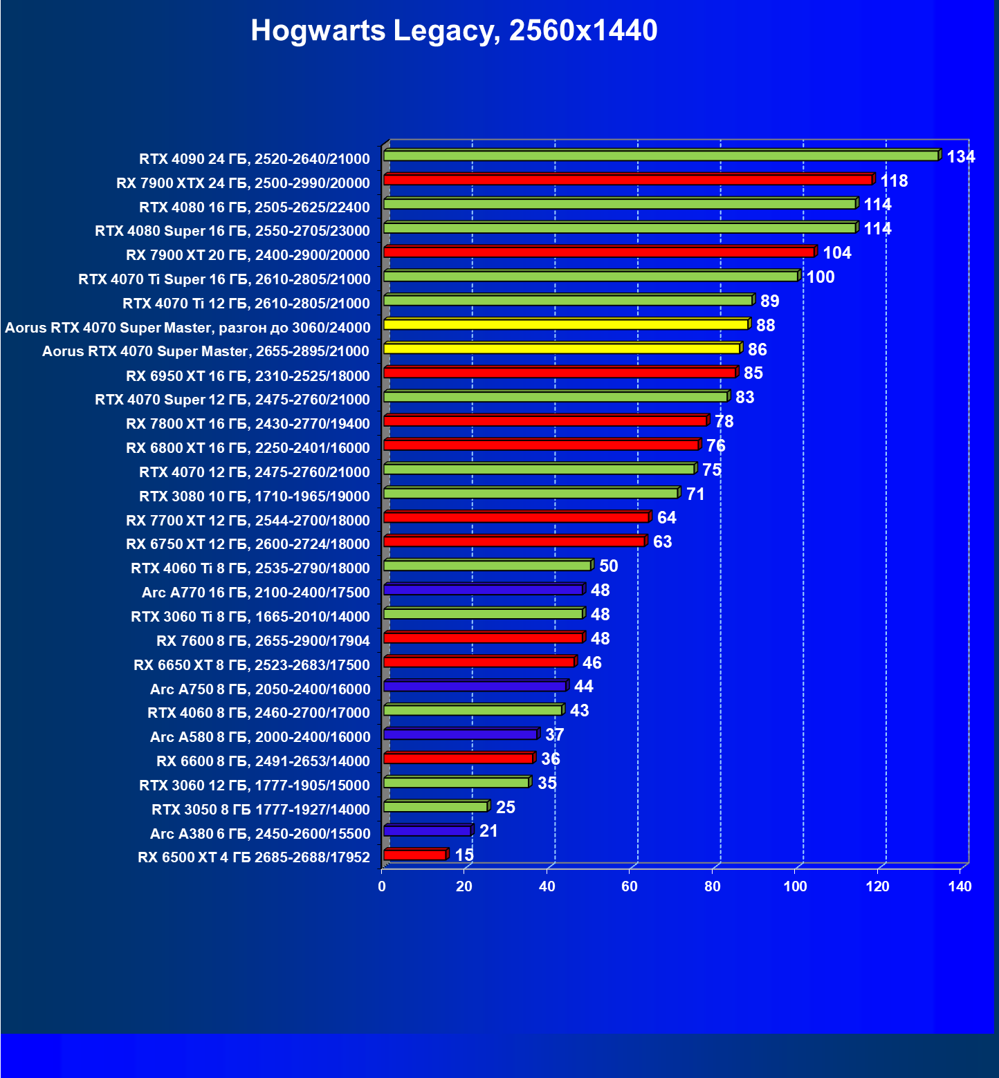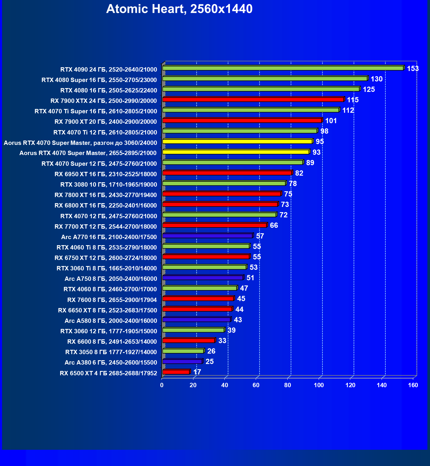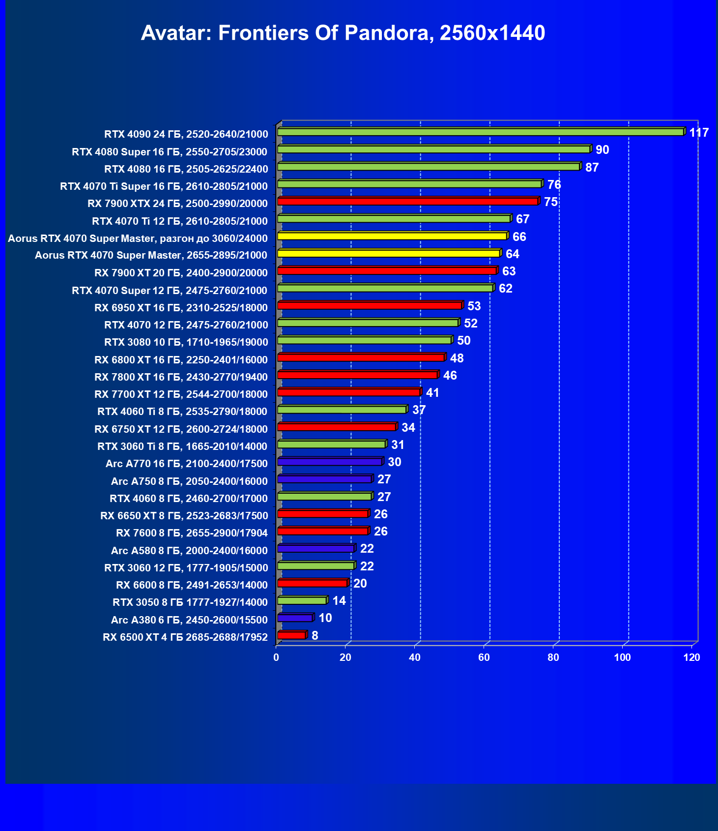 | 06 | Aorus RTX 4070 Super Master, разгон до 3060/24000 | 1792 | 219 | 82 000 |