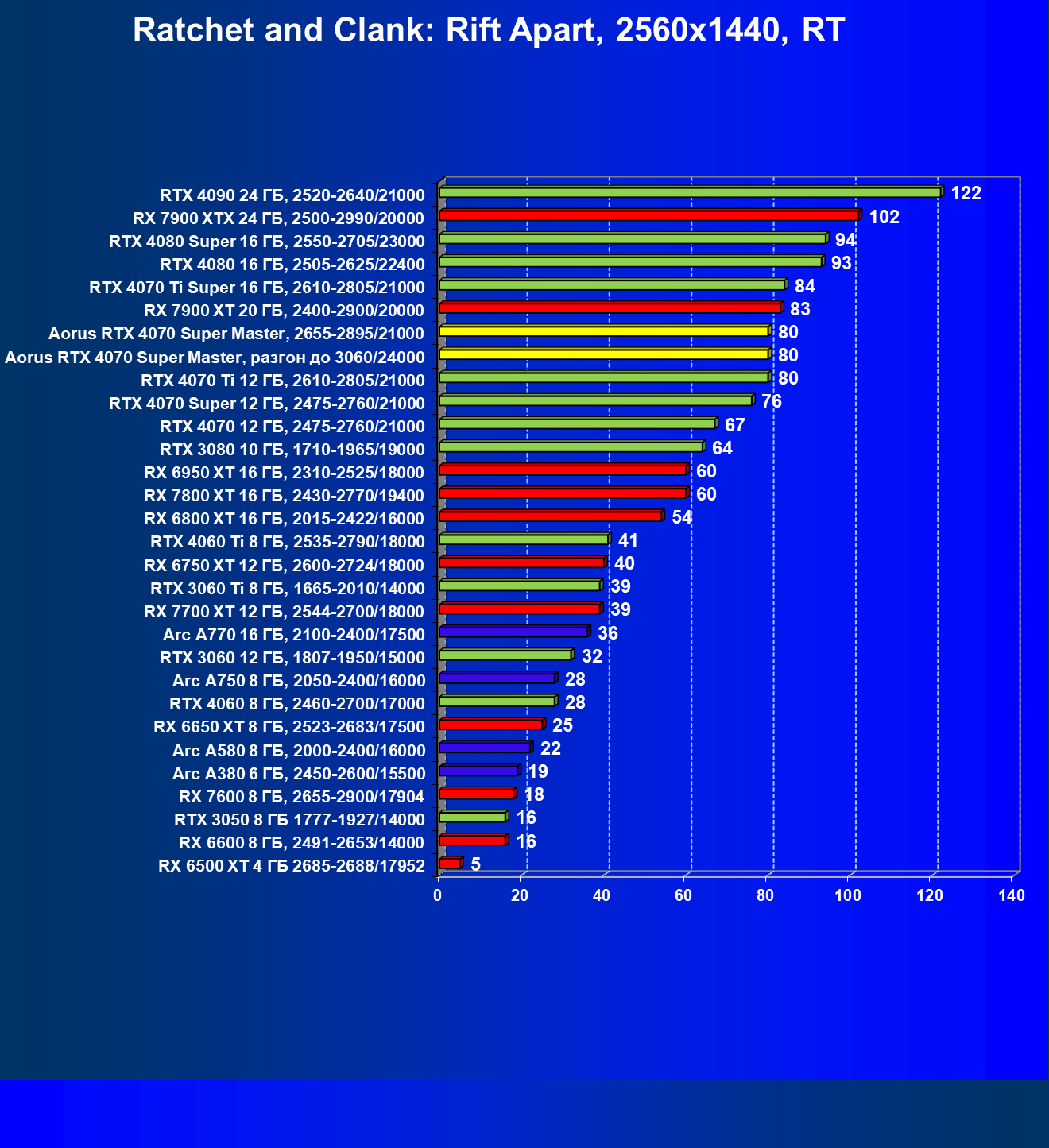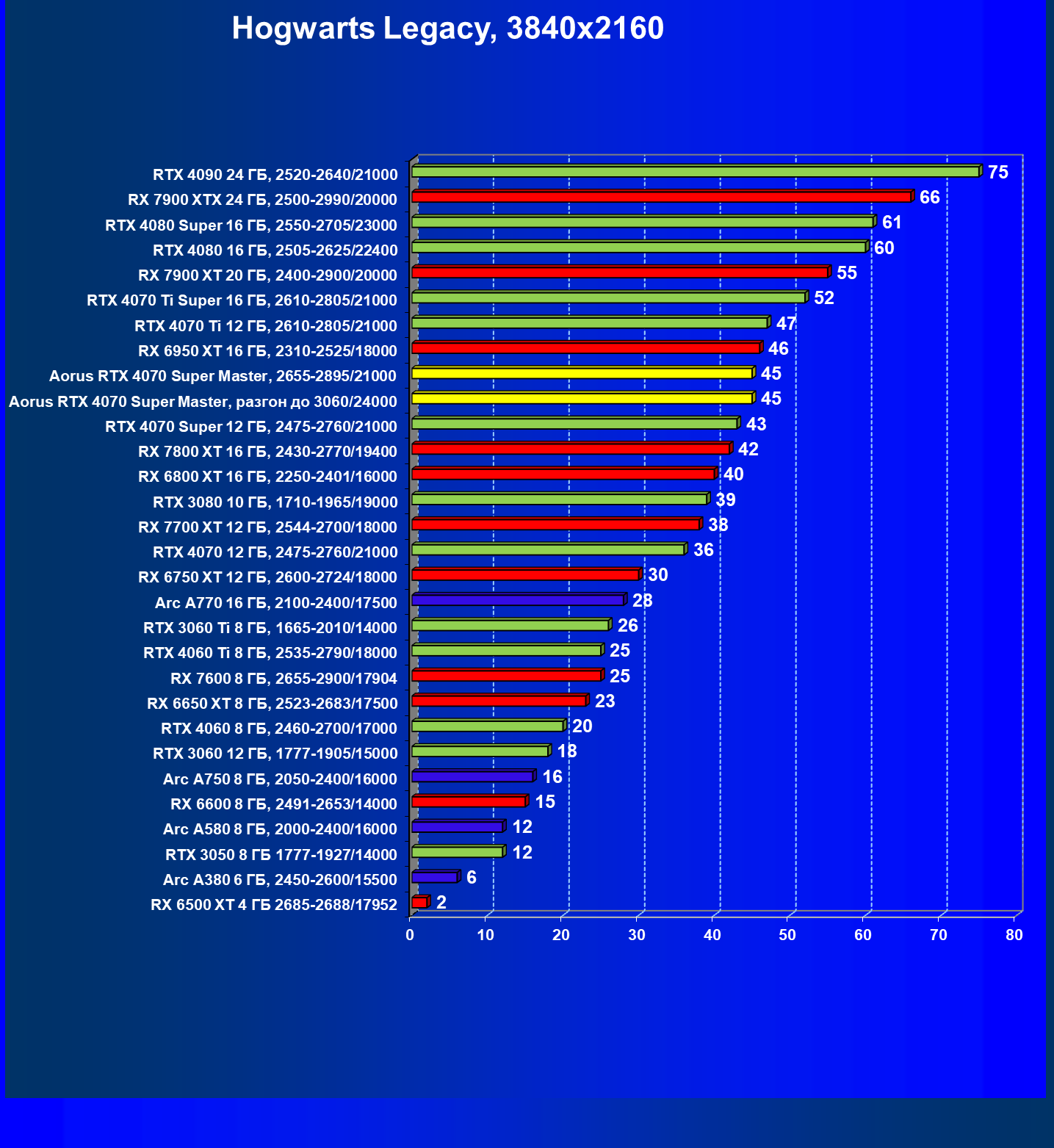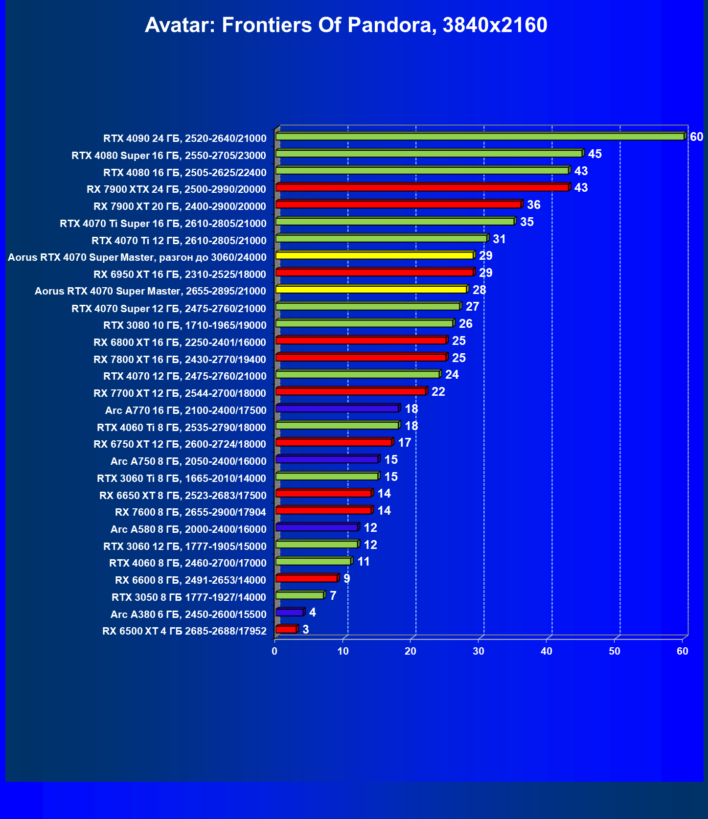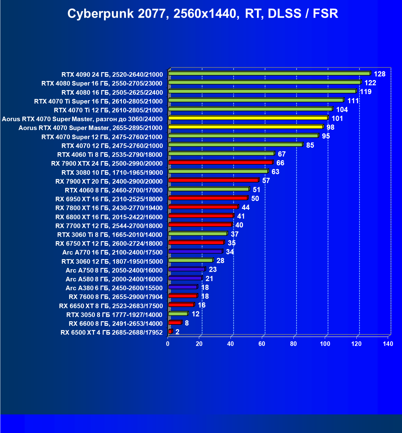 | 06 | Aorus RTX 4070 Super Master, разгон до 3060/24000 | 1792 | 219 | 82 000 |