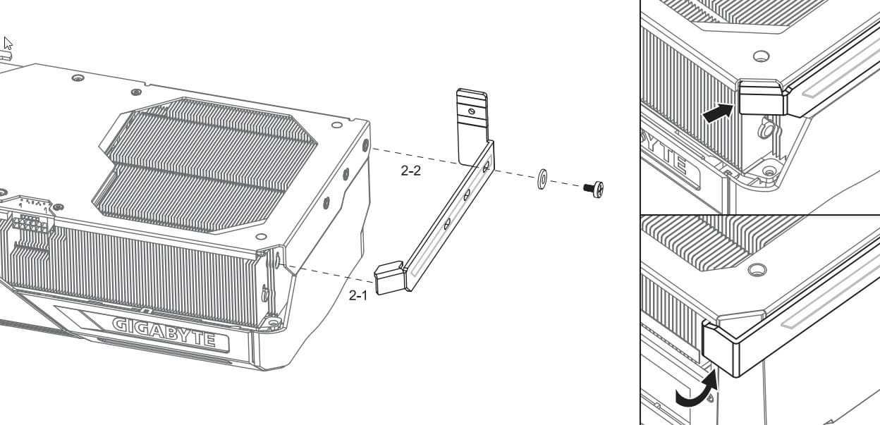 В комплекте поставки кроме традиционного краткого руководства пользователя имеются фирменный стикер Aorus, разборная металлическая подставка-кронштейн под карту с набором крепежа и переходник питания.