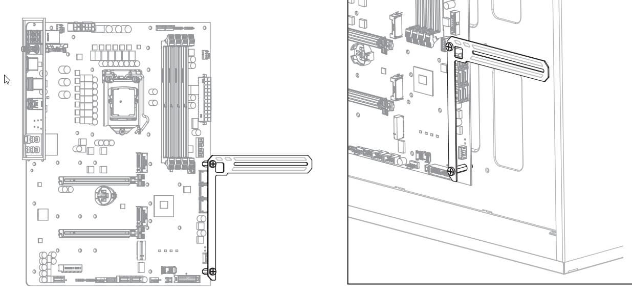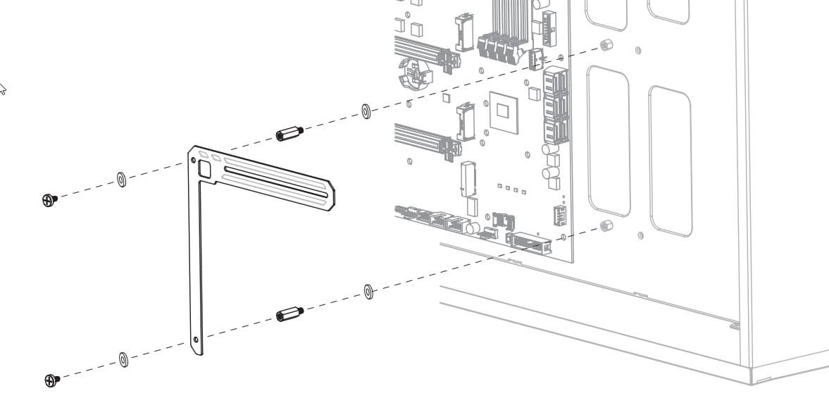 Подставка — не в виде штатива, и даже не в виде кронштейна-подпорки под карту. Это тоже кронштейн, но крепится он к стенке корпуса либо за пределами материнской платы (в случае модели форм-фактора ATX), либо над ней (в случае форм-фактора E-ATX), используя прилагаемый набор крепежа.