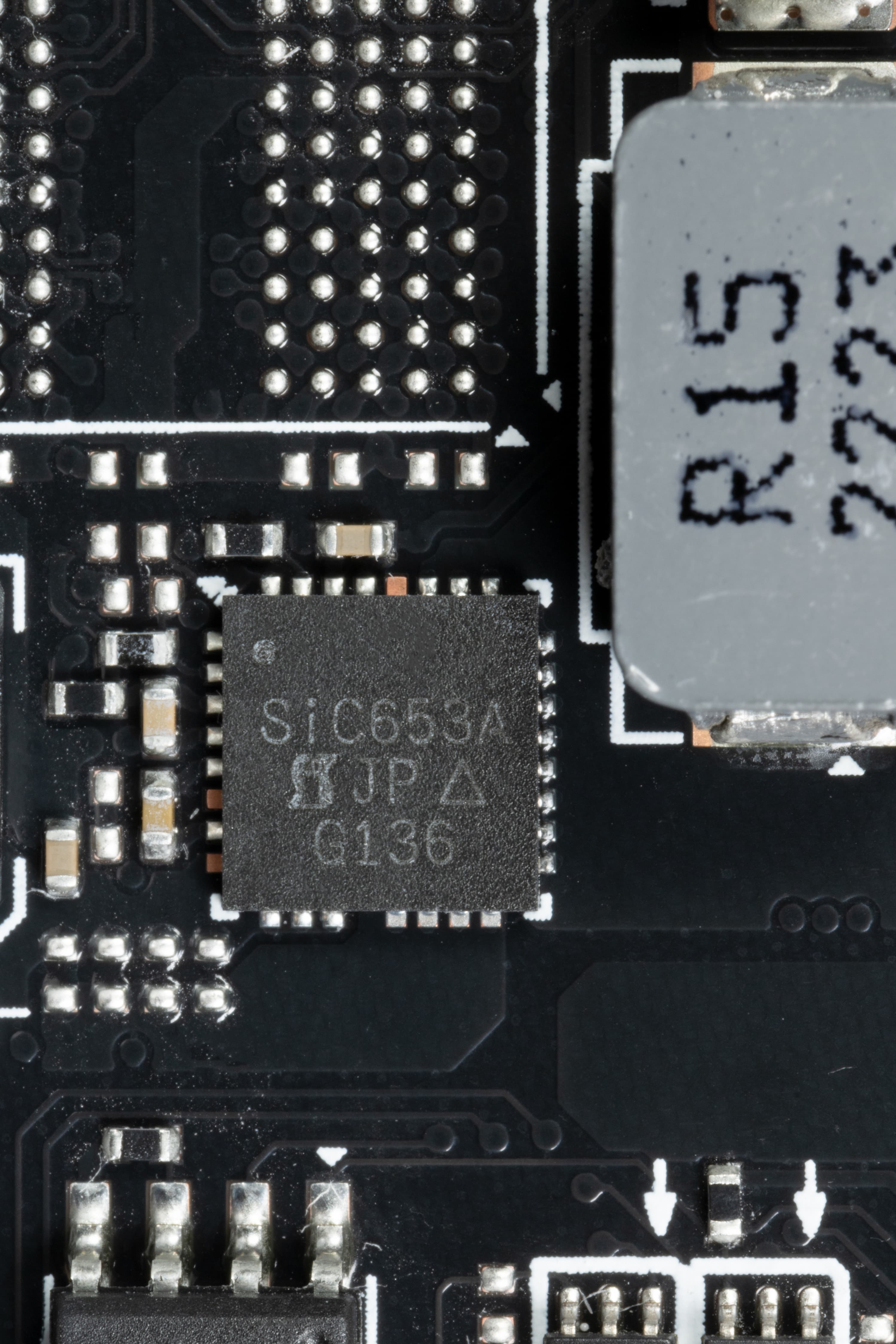 В преобразователе питания, традиционно для всех видеокарт Nvidia, используются транзисторные сборки DrMOS — в данном случае SIC653A (Vishay Siliconix), каждая из которых рассчитана максимально на 50 А.