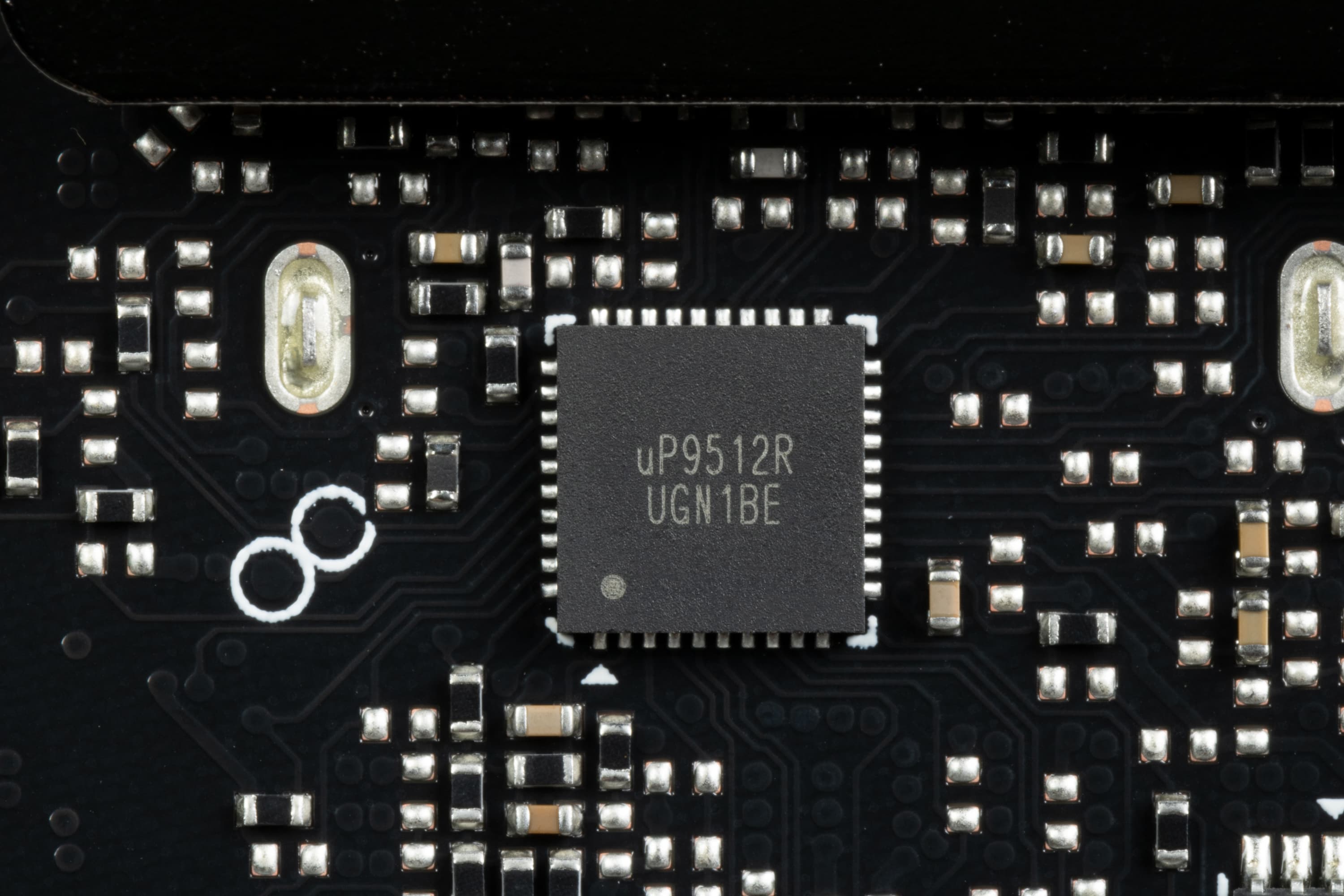 10 фазами питания ядра управляет ШИМ-контроллер uP9512R (uPI Semiconductor) расположенный на оборотной стороне PCB. Он рассчитан как раз максимум на 12 фаз.