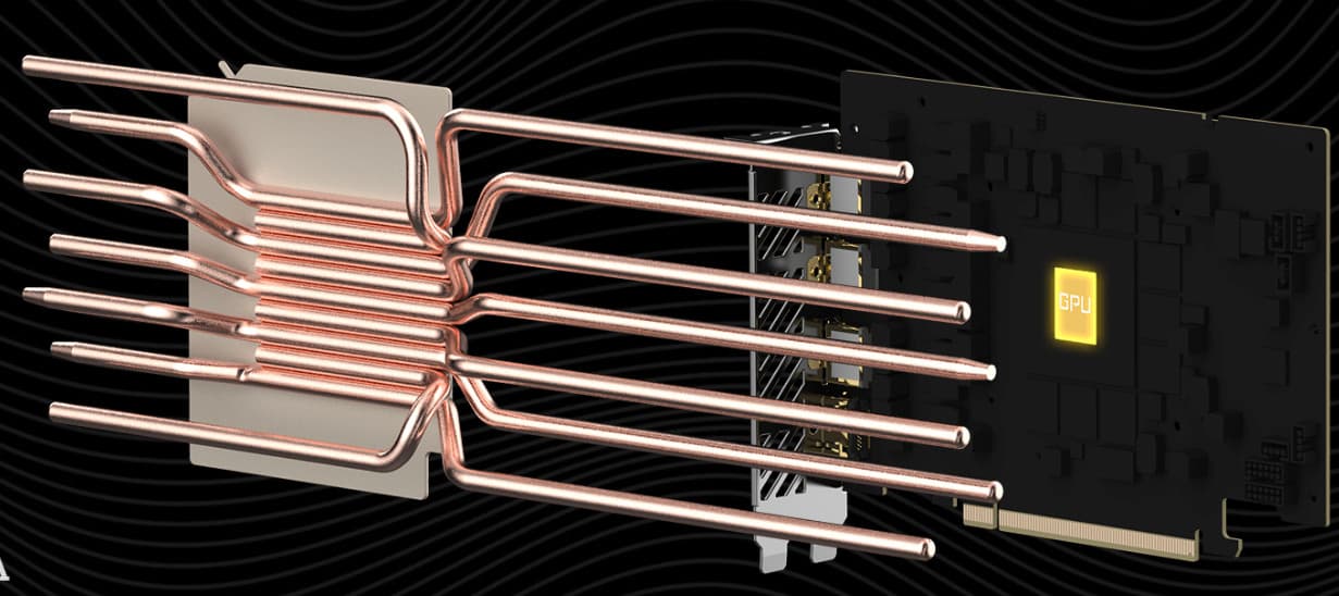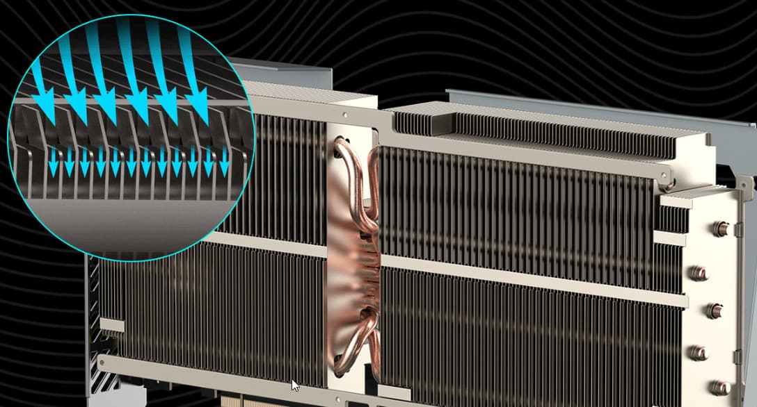 У карты Gigabyte основой кулера является огромный многосекционный пластинчатый никелированный радиатор с тепловыми трубками, распределяющими тепло по ребрам радиатора. Трубки припаяны к огромной медной подошве, под которой скрывается испарительная камера.