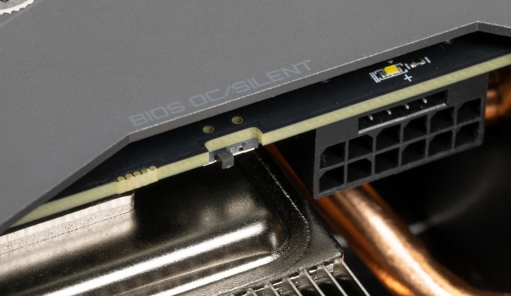 Карта имеет два режима работы, они заложены в двух вариантах BIOS, которые переключаются с помощью переключателя на верхнем торце карты: OC (производительный) и Silent (тихая работа системы охлаждения). Разница между режимами состоит только в настройках работы вентиляторов.
