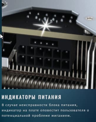 Подсвечены логотипы бренда на верхнем торце и на оборотной стороне карты. Также организована подсветка по краям лопастей вентиляторов с помощью светодиодов на концах самих лопастей: она включается только при вращении вентиляторов; когда они стоят — свечения нет.