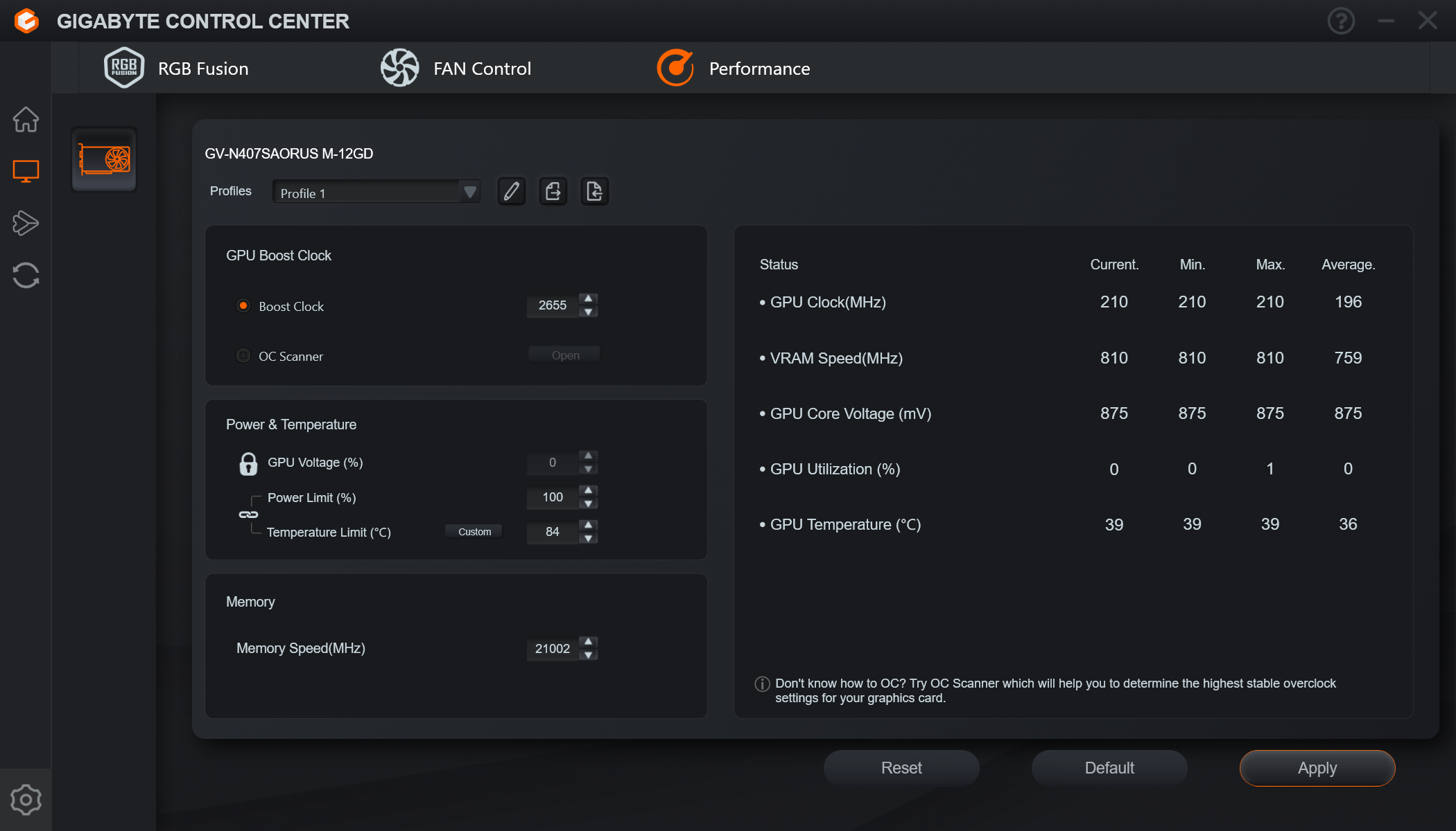 Управление работой карты обеспечивается с помощью знакомой фирменной утилитой Gigabyte Control Center.