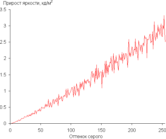 Реальная гамма-кривая ближе всего к стандартной при выборе варианта Gamma 3, поэтому далее мы измерили яркость 256 оттенков серого (от 0, 0, 0 до 255, 255, 255) при этом значении. График ниже показывает прирост (не абсолютное значение!) яркости между соседними полутонами: