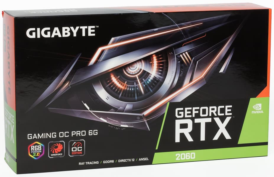 Gigabyte GeForce RTX 2060 Gaming OC Pro 6G (6 ГБ) является отличным вариантом GeForce RTX 2060 для тех, кому не требуется серьезный ручной разгон, навороченная подсветка и прочие излишества. Это лучший ускоритель в ценовом диапазоне 28—32 тыс. рублей. Несмотря на позиционирование, у карты улучшена система питания и немного повышены частоты работы, а главным плюсом Gigabyte GeForce RTX 2060 Gaming OC Pro 6G является отличная система охлаждения, обеспечивающая низкую температуру ядра и карты в целом, но достаточно тихая и не слишком увеличивающая габариты ускорителя.