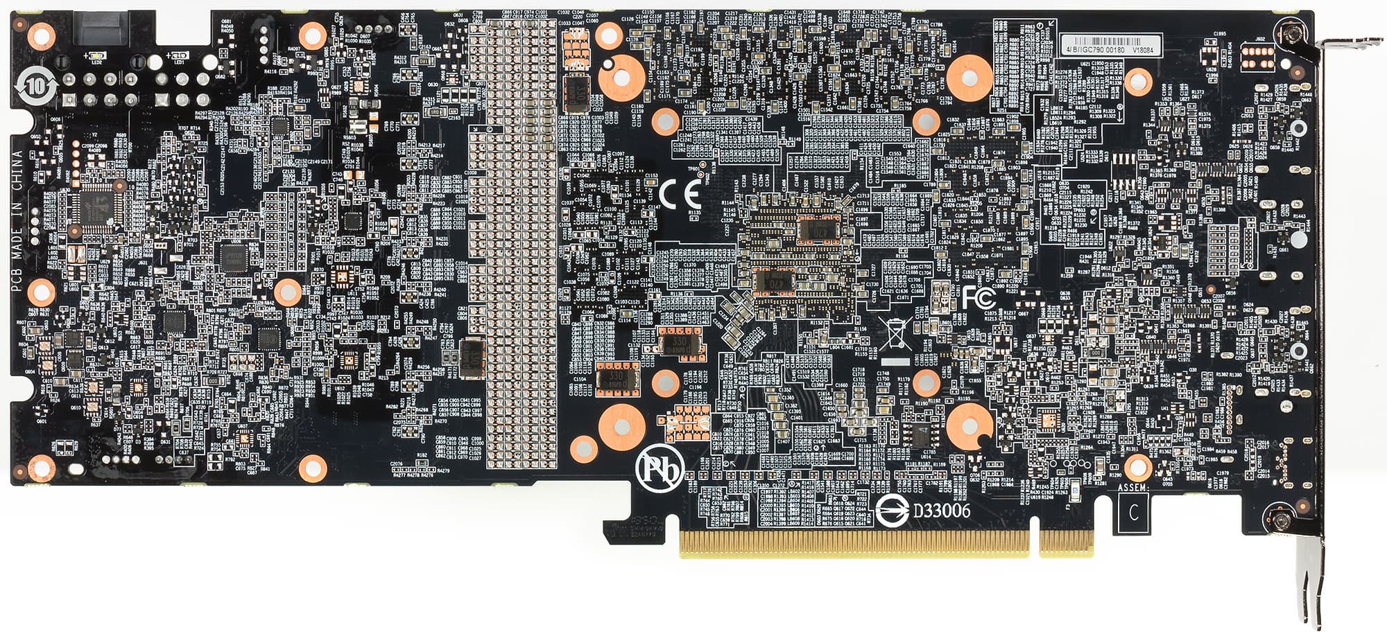 Перед нами уже, так сказать, традиционный двухсекционный радиатор пластинчатого типа, обе секции которого соединяются 4 тепловыми трубками, прижимающимися напрямую к микросхеме GPU. На той же подошве основного радиатора имеется и термоинтерфейс для охлаждения микросхем памяти. К силовым элементам конвертера питания прижимается подошва на второй части радиатора. На обороте карты установлена толстая пластина, служащая не только элементом жесткости, но и охладителем PCB.