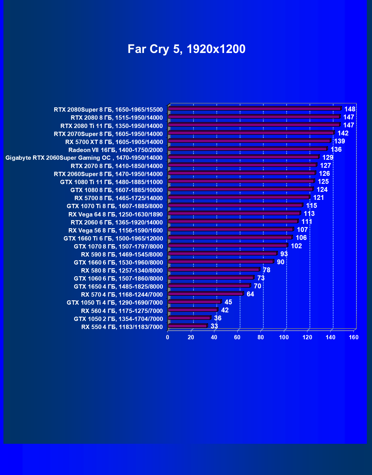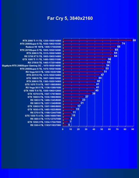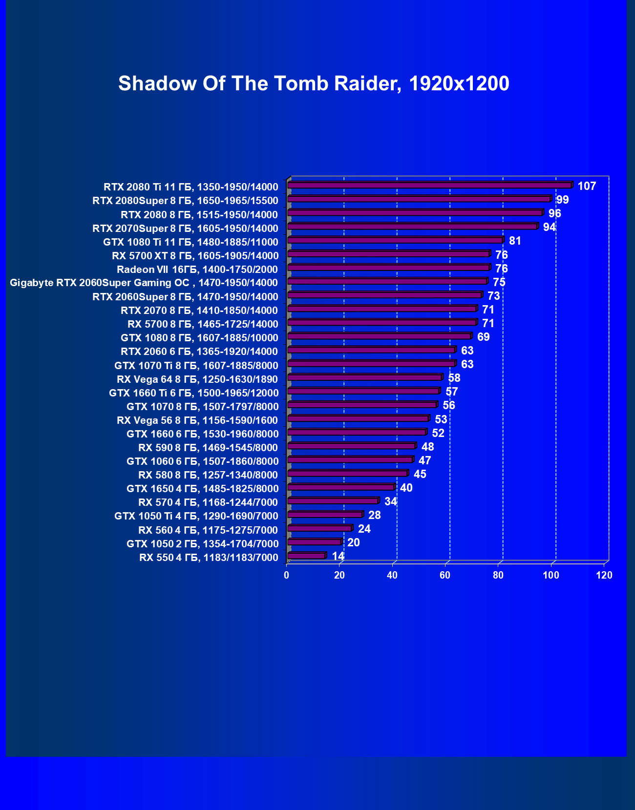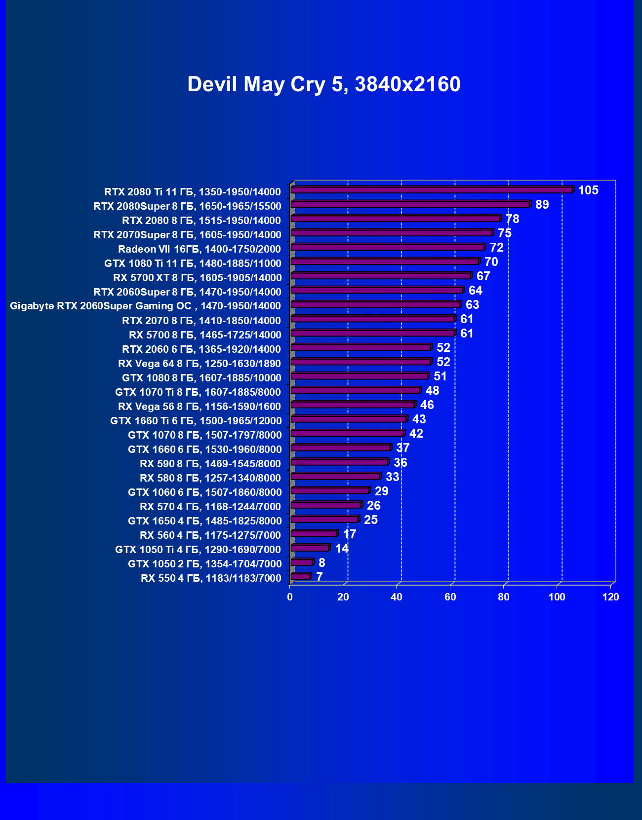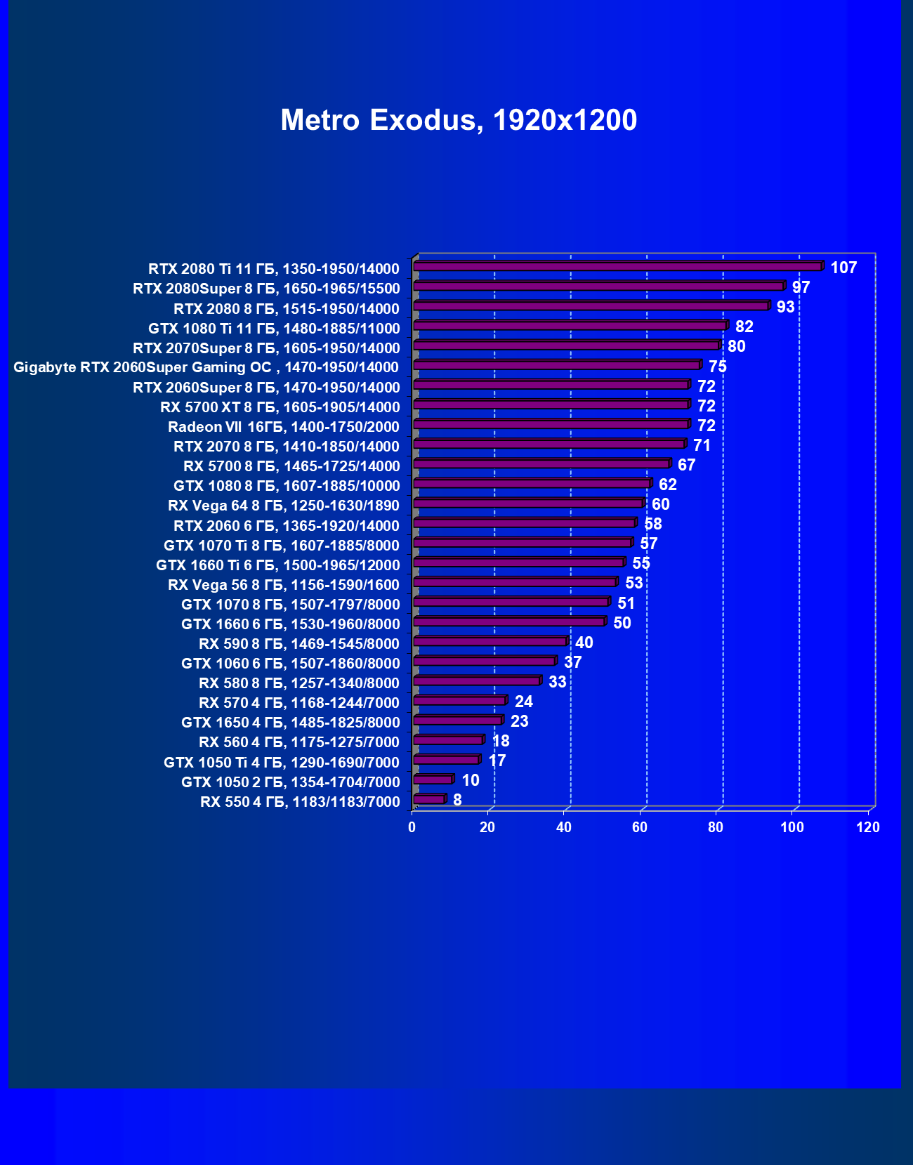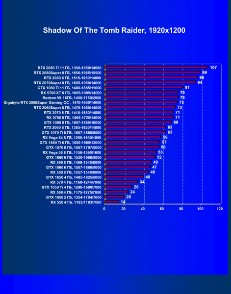 | 08 | RX 5700 XT 8 ГБ, 1605—1905/14000 | 300 | 860 | 28 700 |