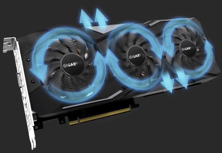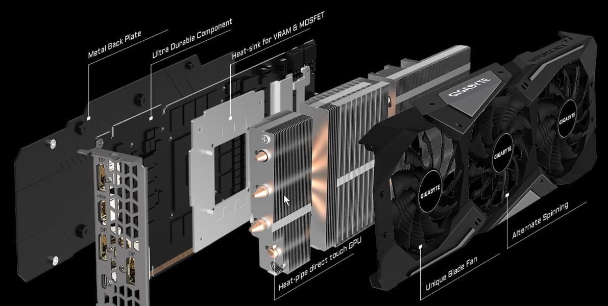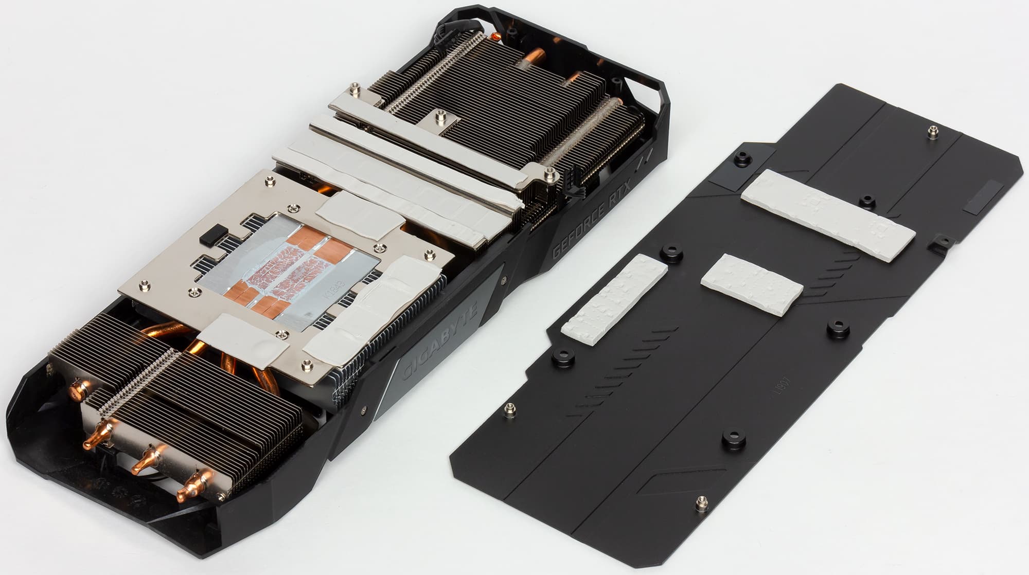 Основой кулеров серии Windforce является массивный трехсекционный радиатор с пластинчатыми ребрами, которые пересекают 5 тепловых трубок, 4 из которых прижимаются напрямую к «те́льцу» GPU. На подошве основного радиатора имеется термоинтерфейс для охлаждения микросхем памяти. К силовым элементам конвертера питания прижимается подошва на второй части радиатора. На обороте карты установлена толстая пластина, служащая не только элементом жесткости, но и охладителем PCB.