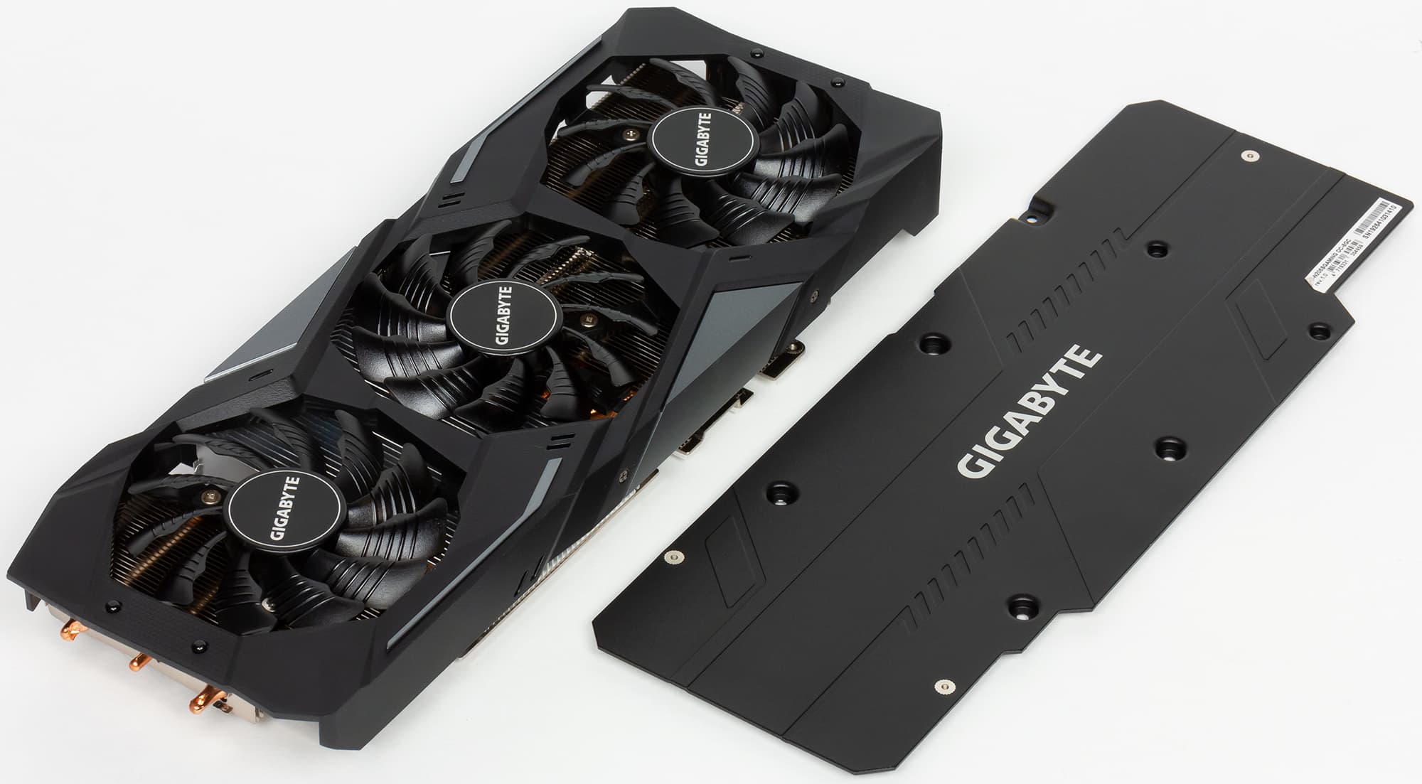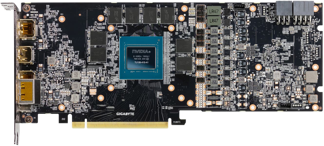 А у Gigabyte преемственность заключается в том, что одна и та же PCB служит для целого набора видеокарт: RTX 2060 Super, RTX 2070, RTX 2070 Super, RTX 2080 и RTX 2080 Super, благо все GPU TU106/TU104 совместимы по контактам. Более того, все последние карты Gigabyte на основе GeForce RTX 2070/2080 и их «супер»-варианты похожи как две капли воды даже внешне, и без чтения наклейки с названием модели даже не понять, где какая. Разницу можно обнаружить только в их толщине (у RTX 2080/2080 Super/2070 Super кулер шире).