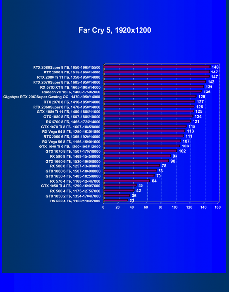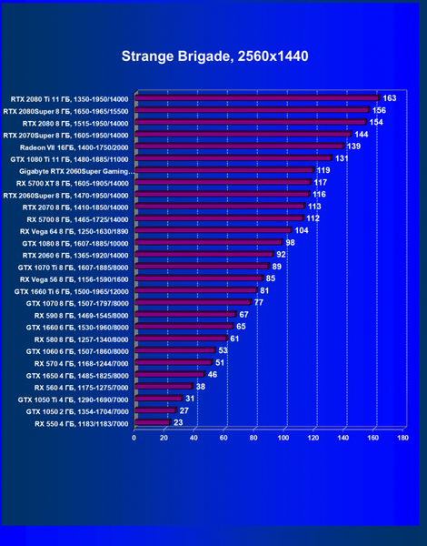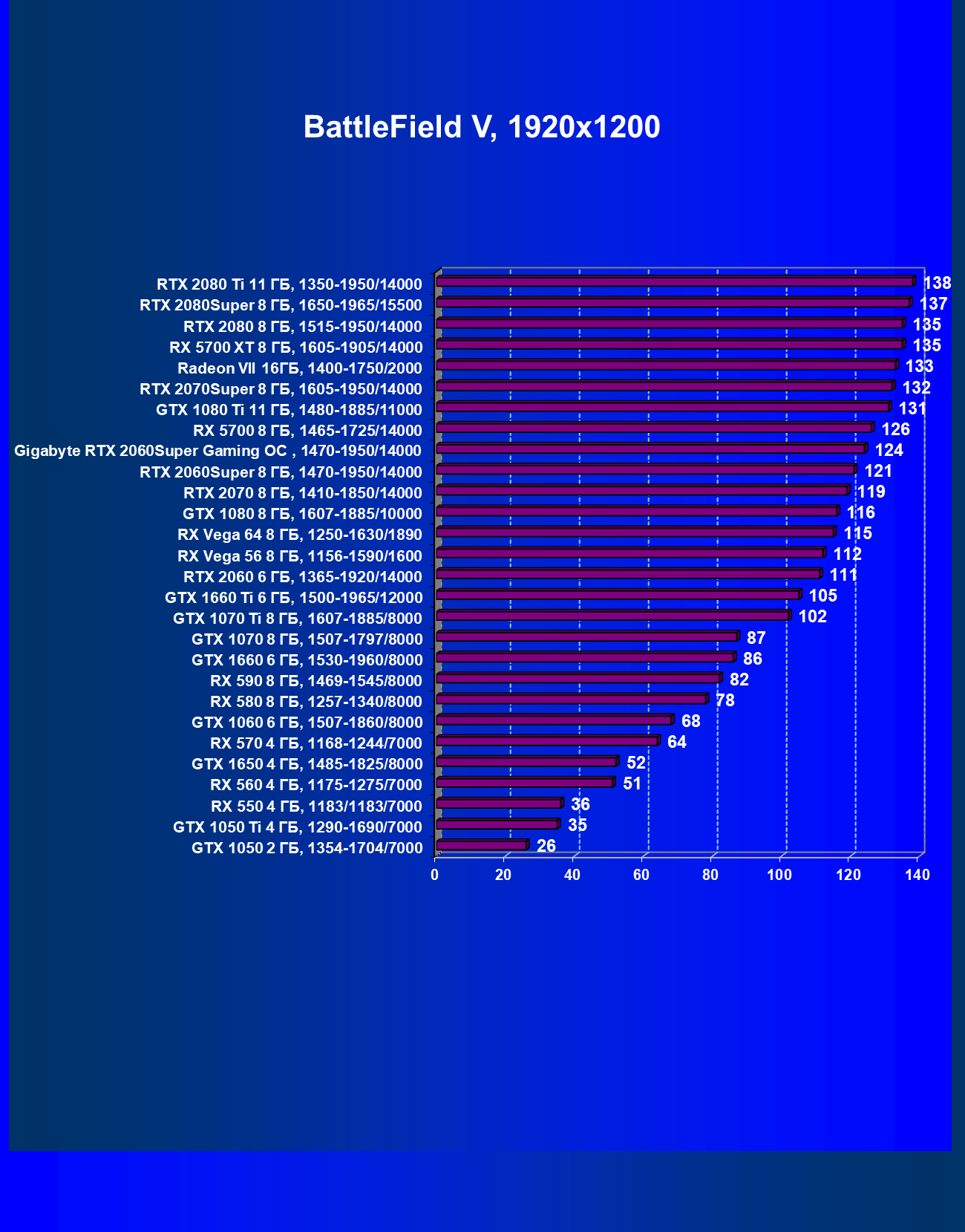 Чем мы дальше спускаемся вниз по ценовой линейке ускорителей, тем жестче конкуренция. На момент подготовки материала стоимость средневзвешенного Radeon RX 5700 XT примерно равна стоимости не менее средневзвешенного GeForce RTX 2060 Super, хотя первый чуть-чуть быстрее, потому в своей группе он занял лидирующую позицию. У видеокарты Gigabyte чуть повыше Boost-частота, чем у GeForce RTX 2060 Super Founders Edition, ее GPU чаще работал на более высоких частотах, что дало хоть и мизерный (около 2%), но все-таки прирост производительности.